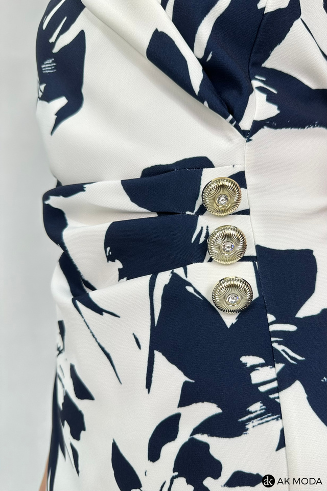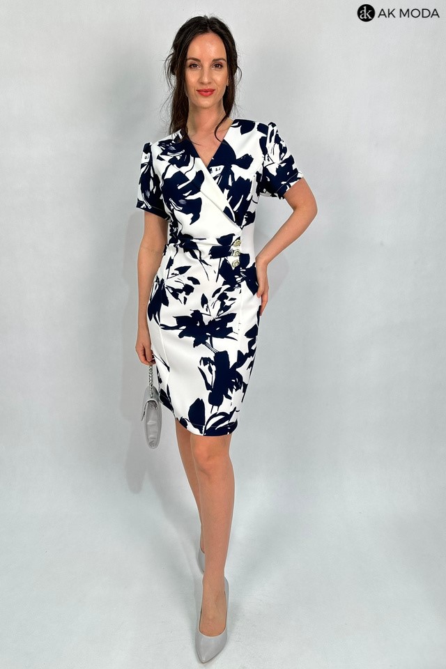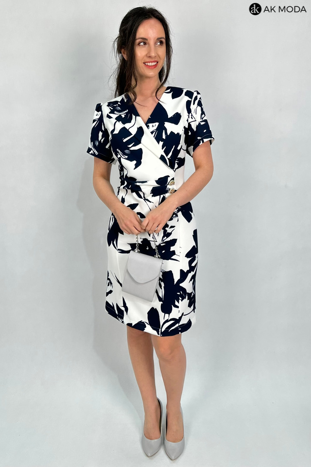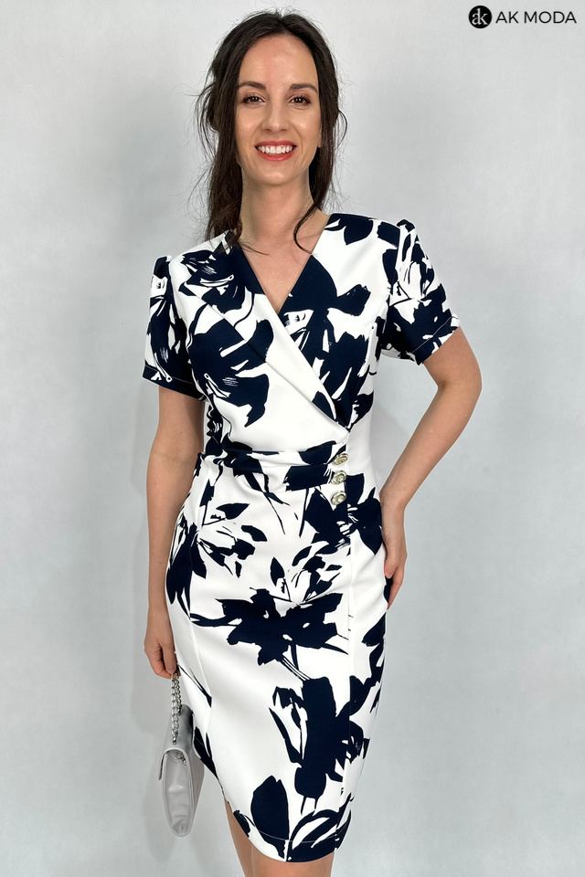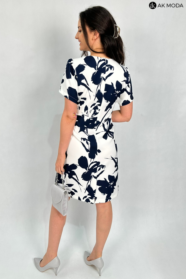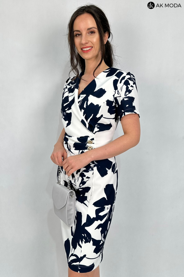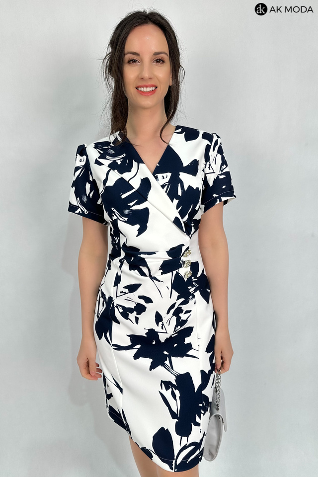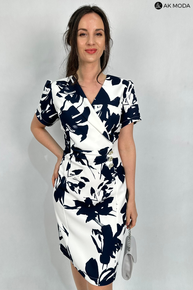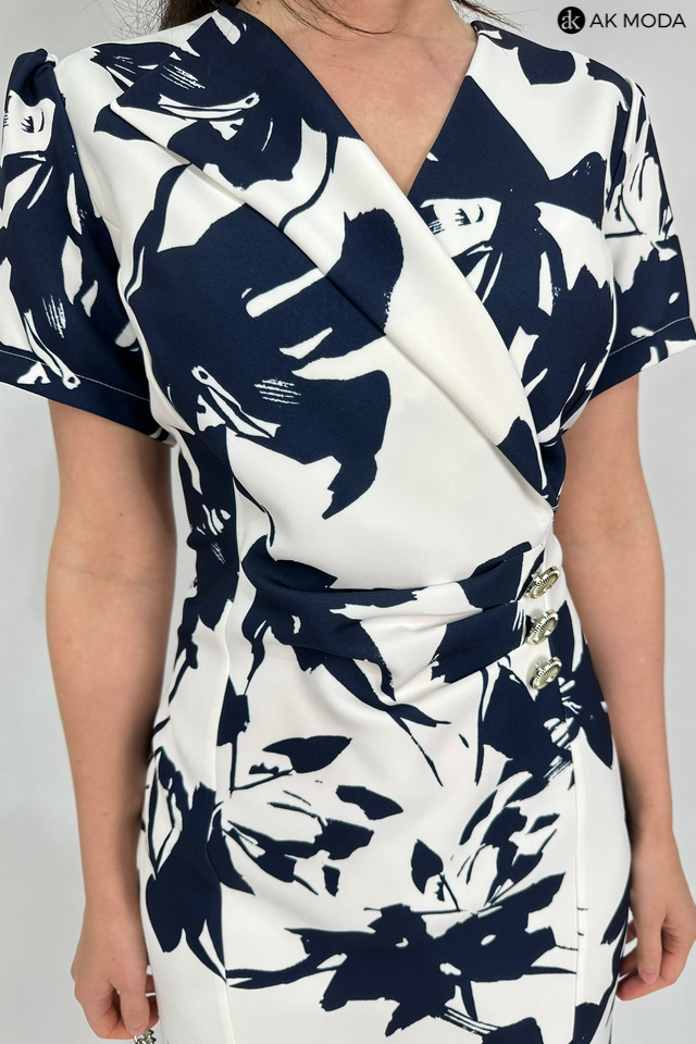 Elegancka, dopasowana sukienka w kolorze śmietankowym z granatowym printem. Dekolt kopertowy - dopasowuje się do biustu, krótkie rękawy, w talii marszczenie i ozdobne guziki.