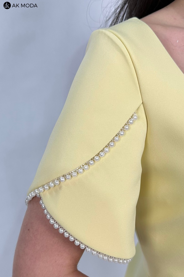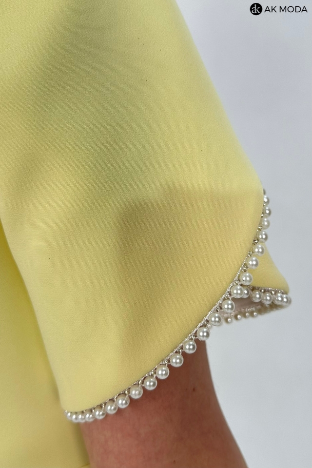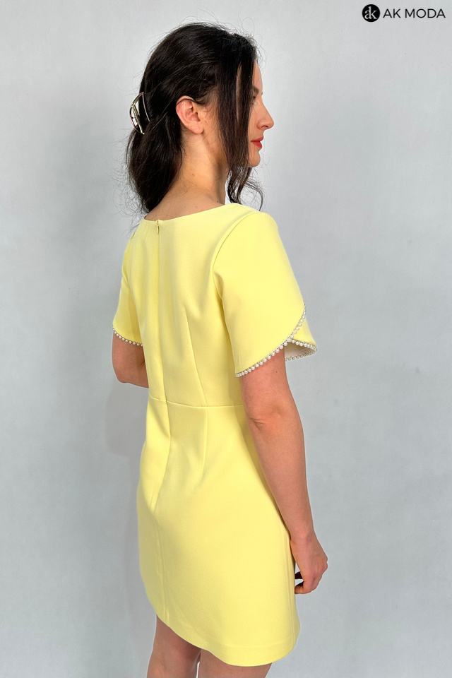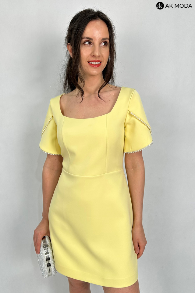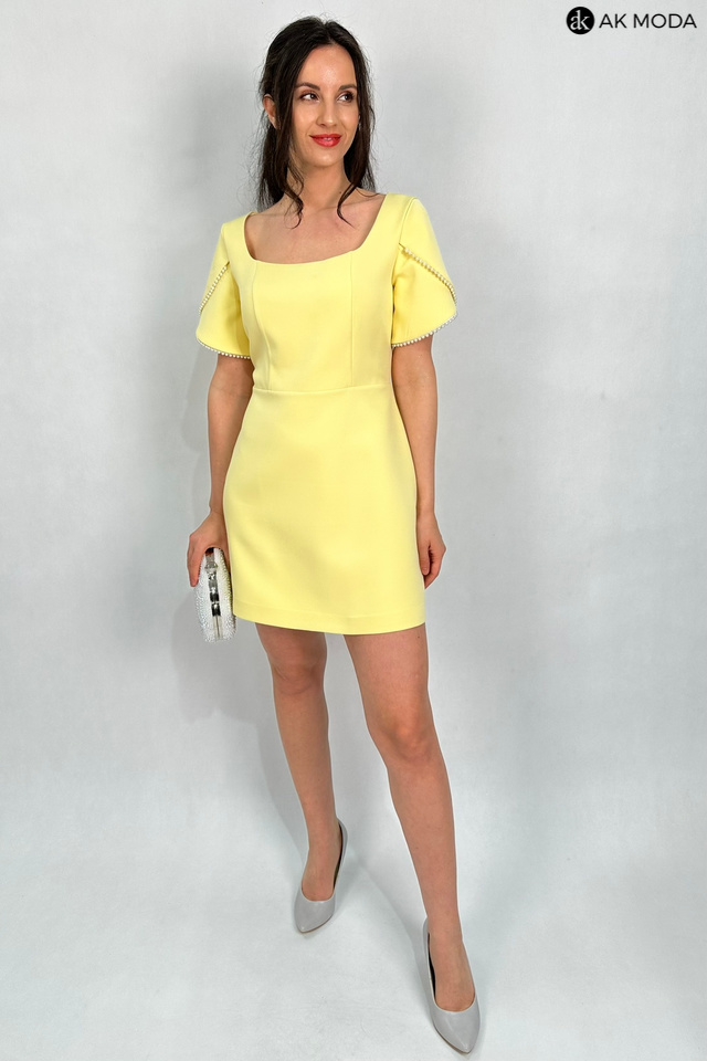 Elegancka sukienka mini w kolorze żółtym. Dekolt kwadratowy, krókie kopertowe rękawki, ozdobione perełkami.
