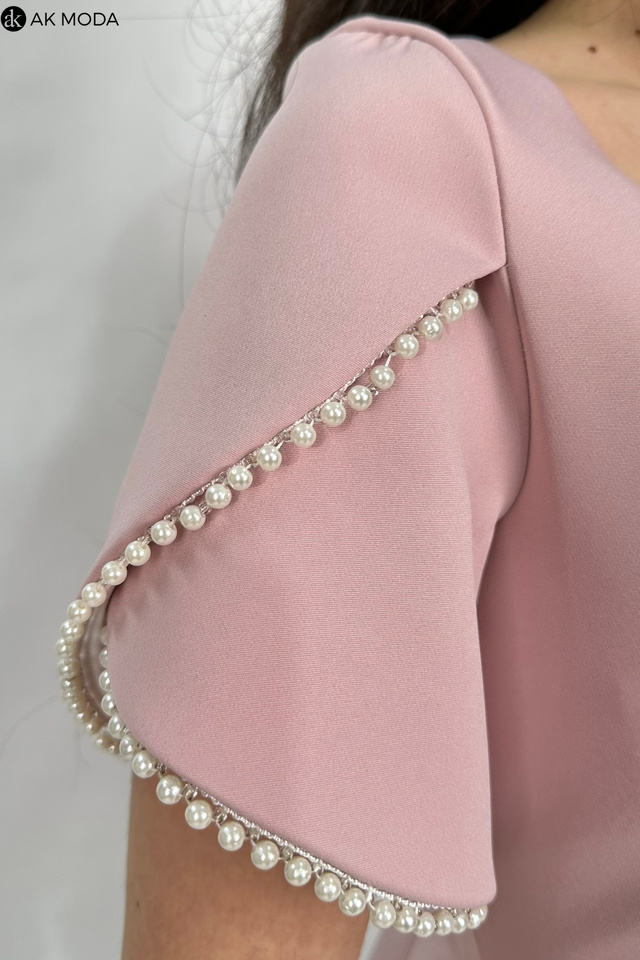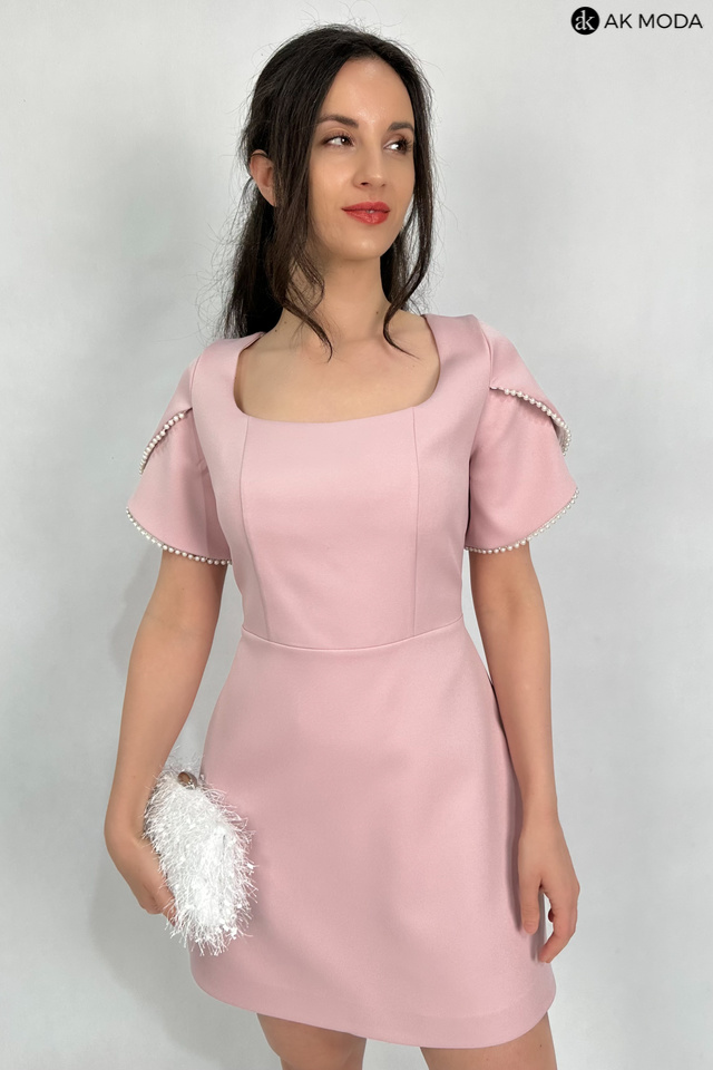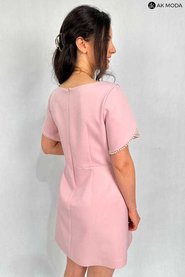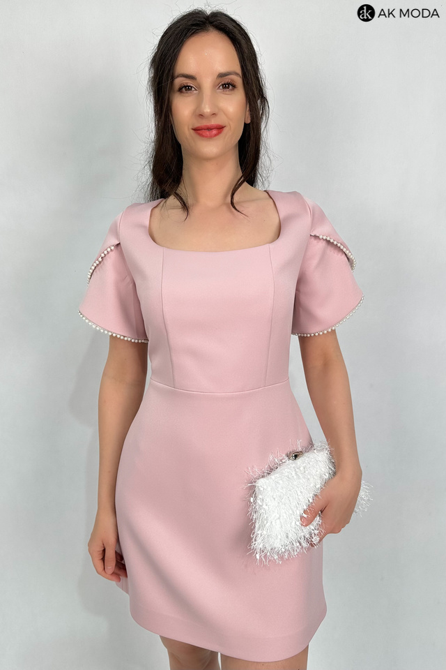 Elegancka sukienka mini w kolorze pudrowego różu. Dekolt kwadratowy, krókie kopertowe rękawki, ozdobione perełkami.