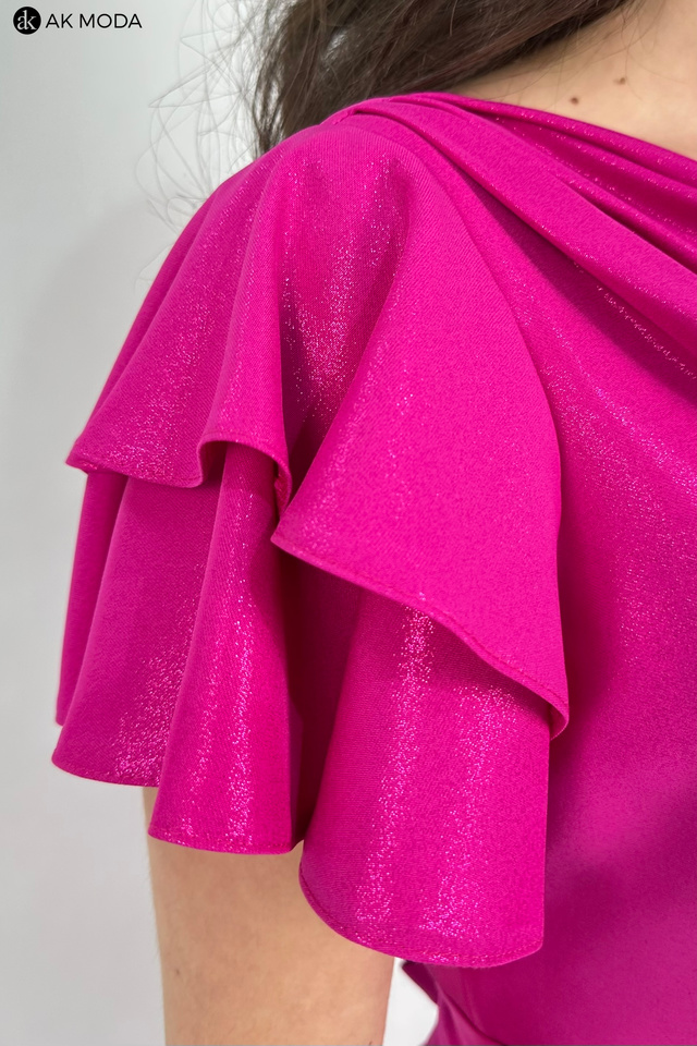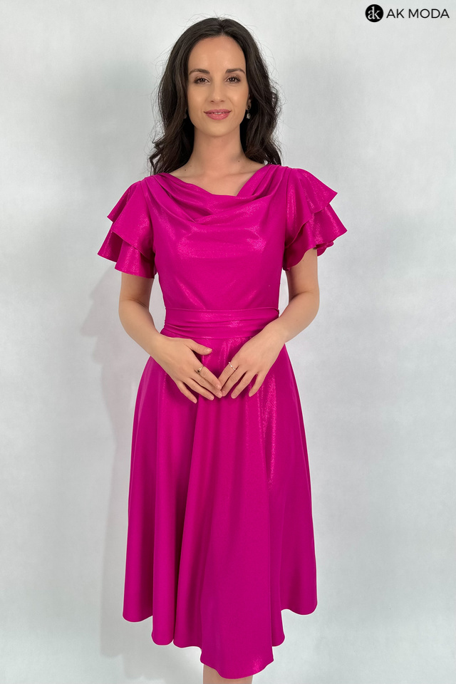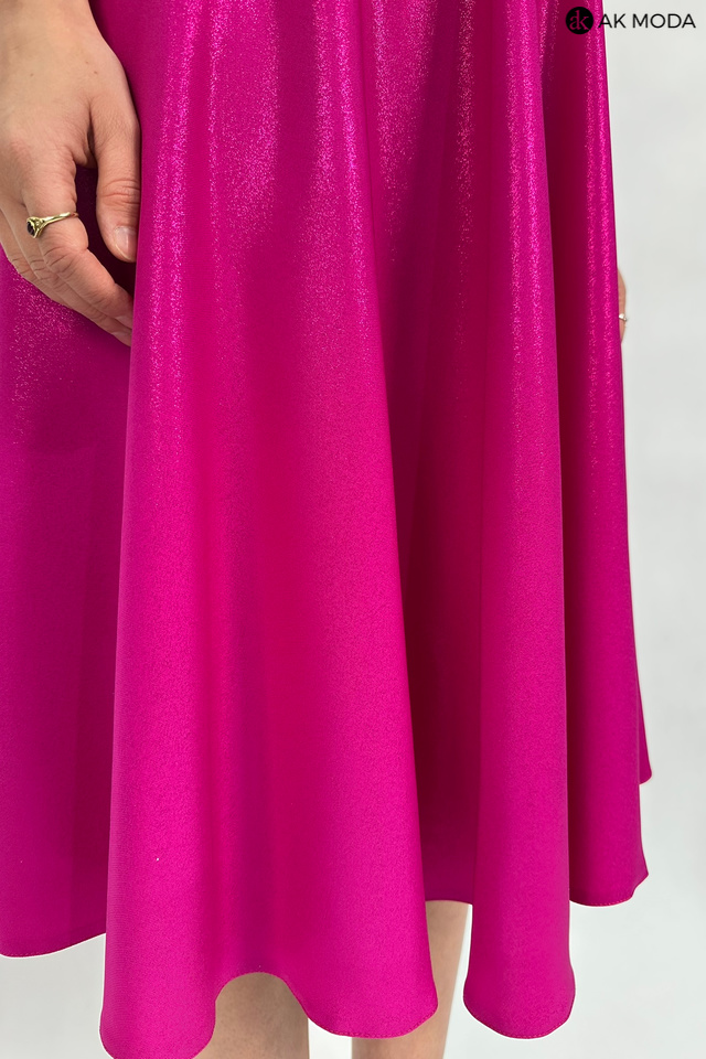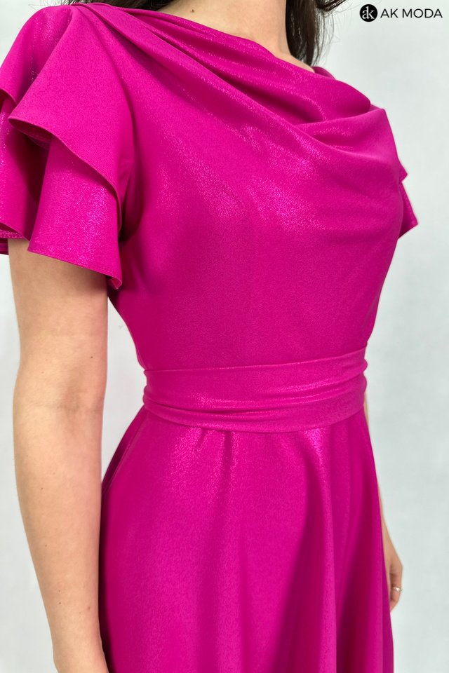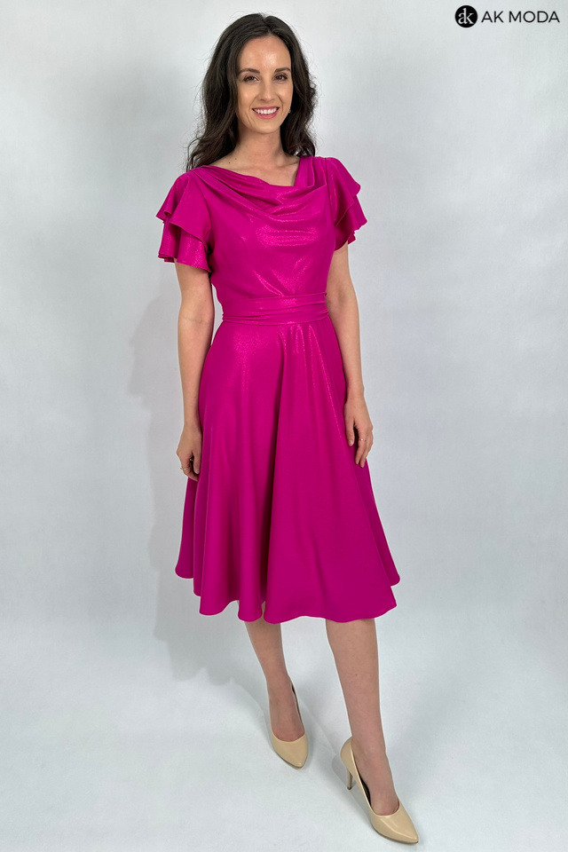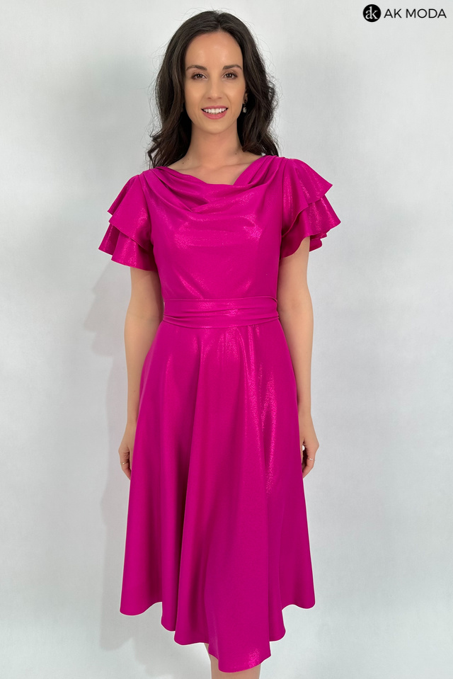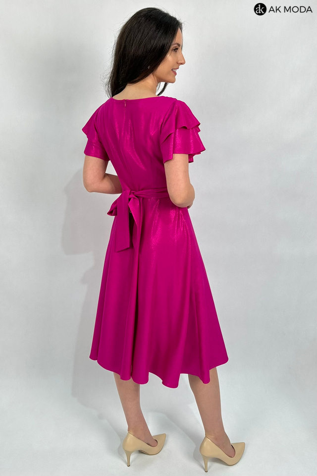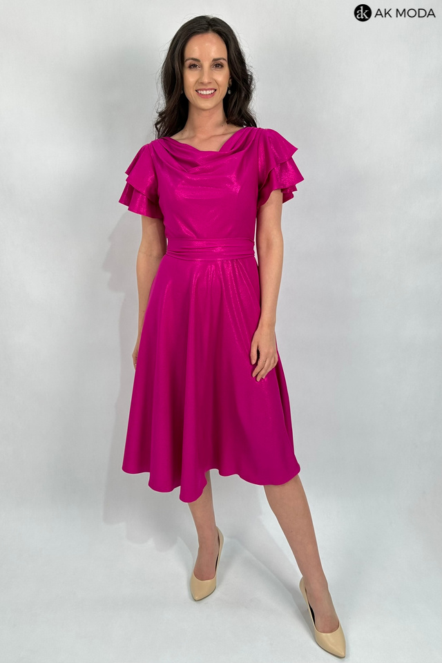 Elegancka, rozkloszowana sukienka w kolorze fuksjowym, uszyta z delikatnie błyszczącego materiału. Dekolt typu woda, krótkie warstwowe rękawki, w talii wiązany pasek.