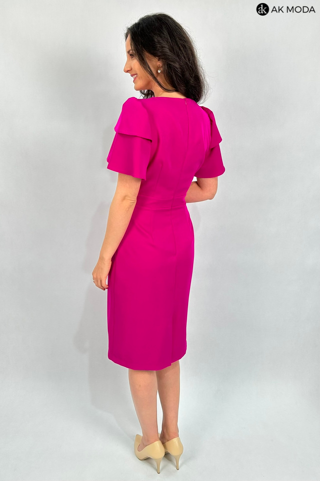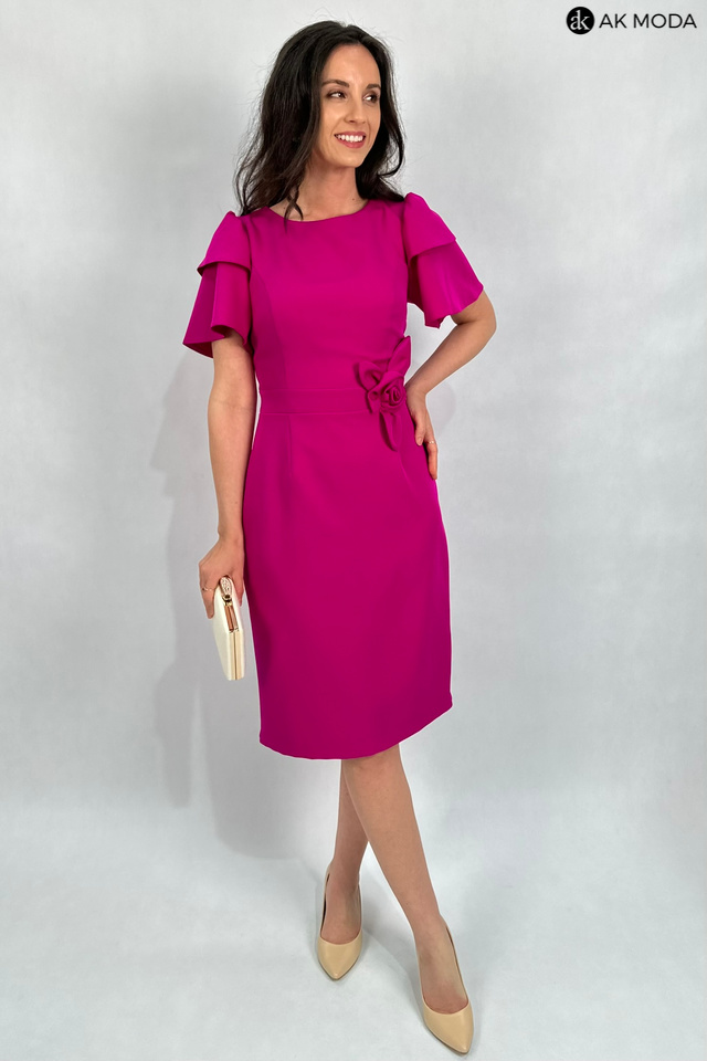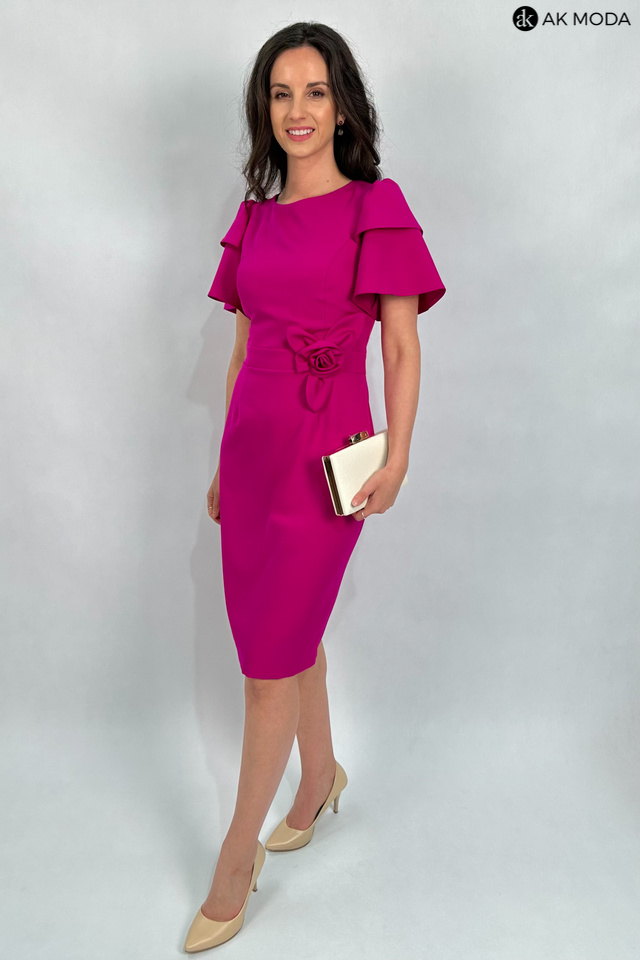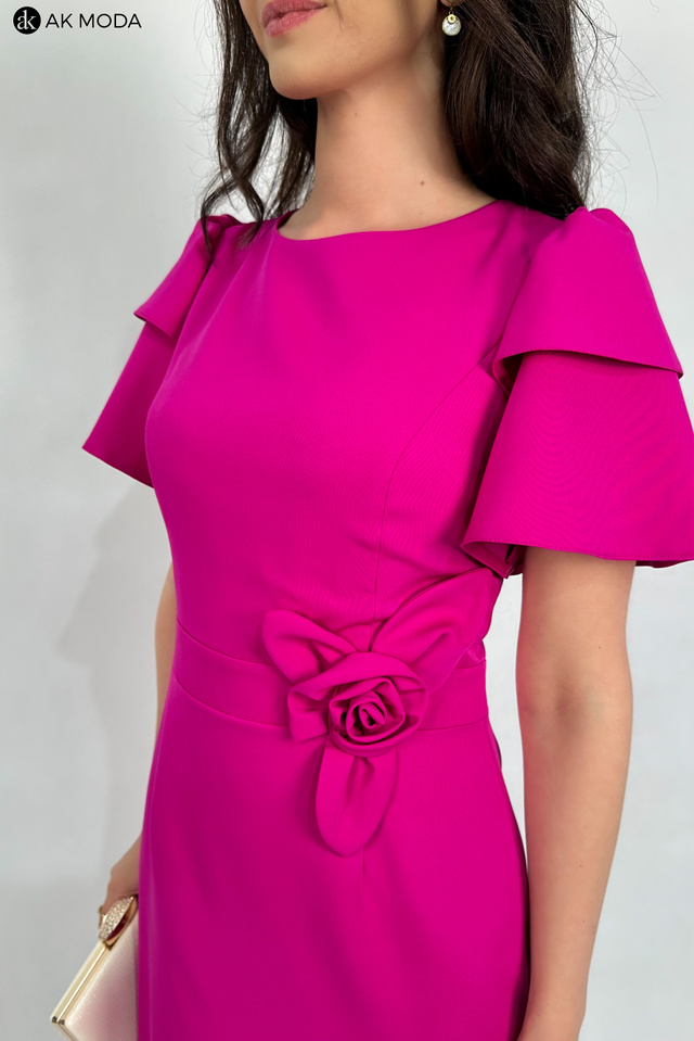 Elegancka, dopasowana sukienka w kolorze fuksjowym.Dekolt okrągły, krótkie, warstwowe rękawki, w talii ozdobny kwiatek.