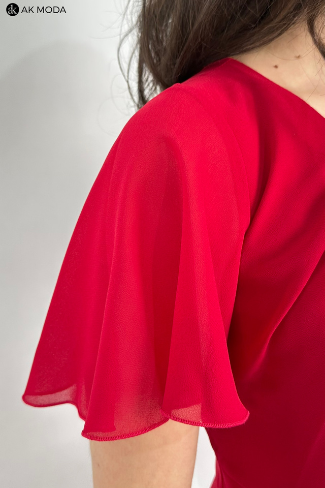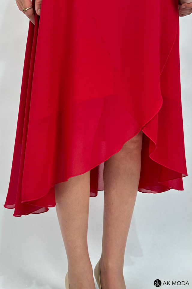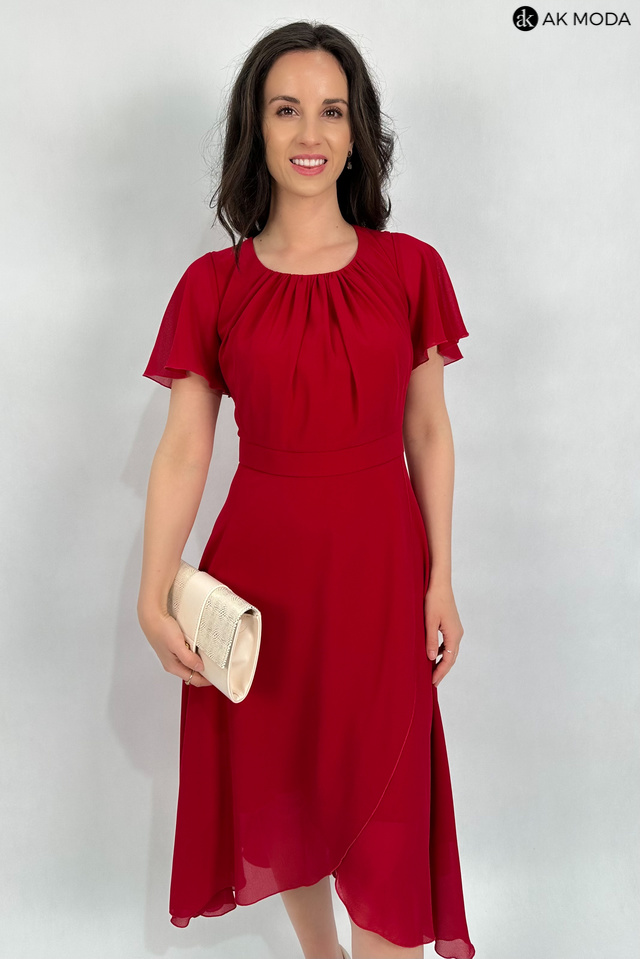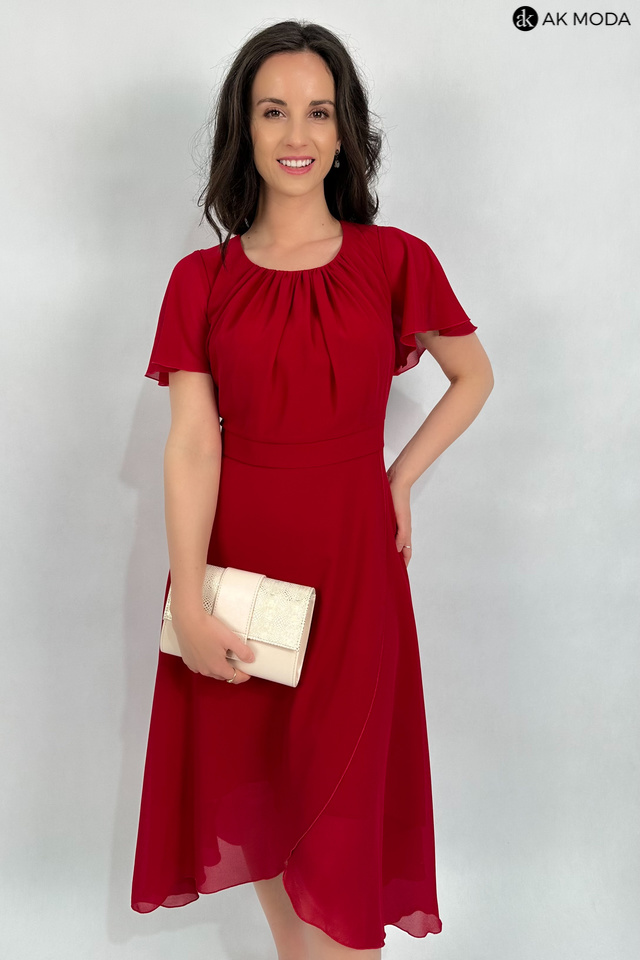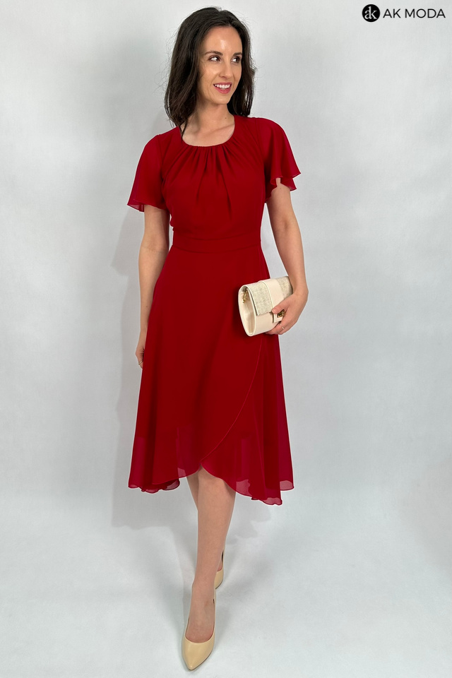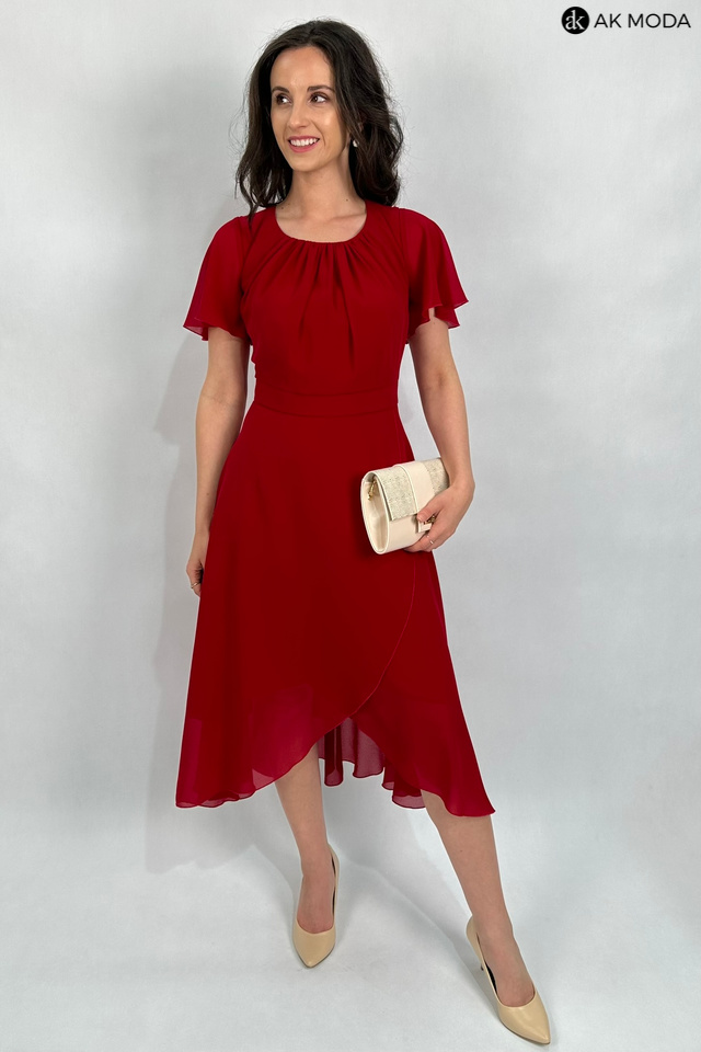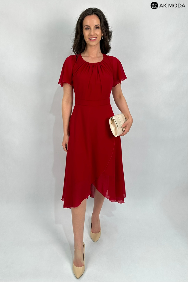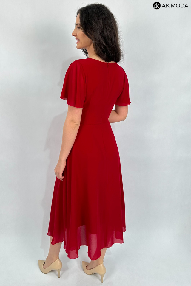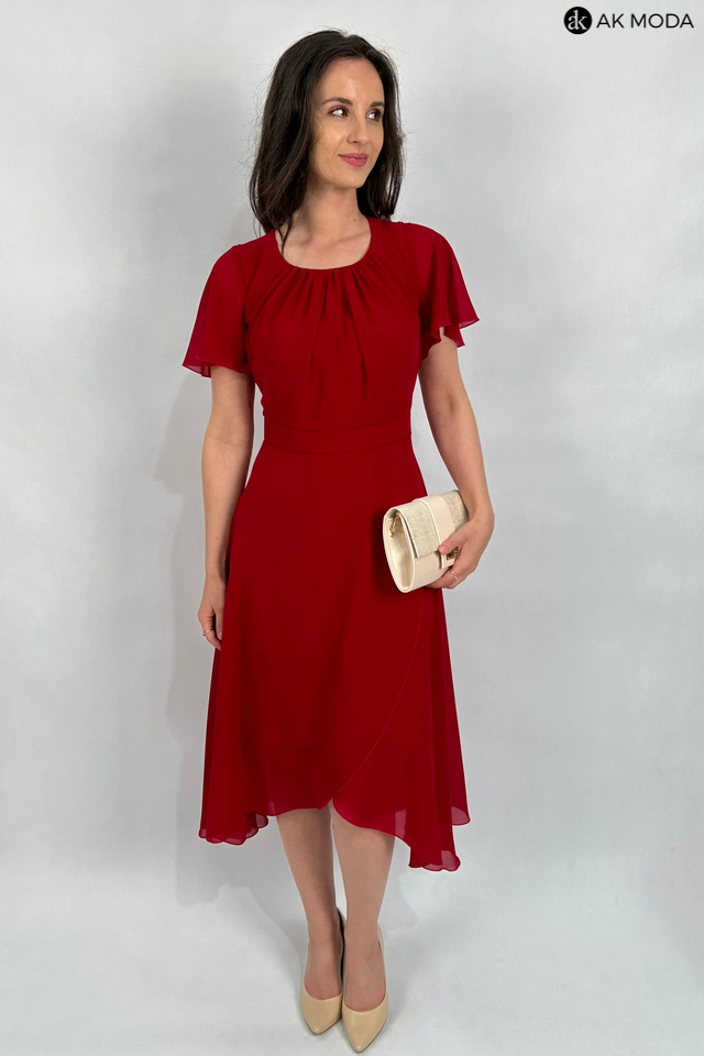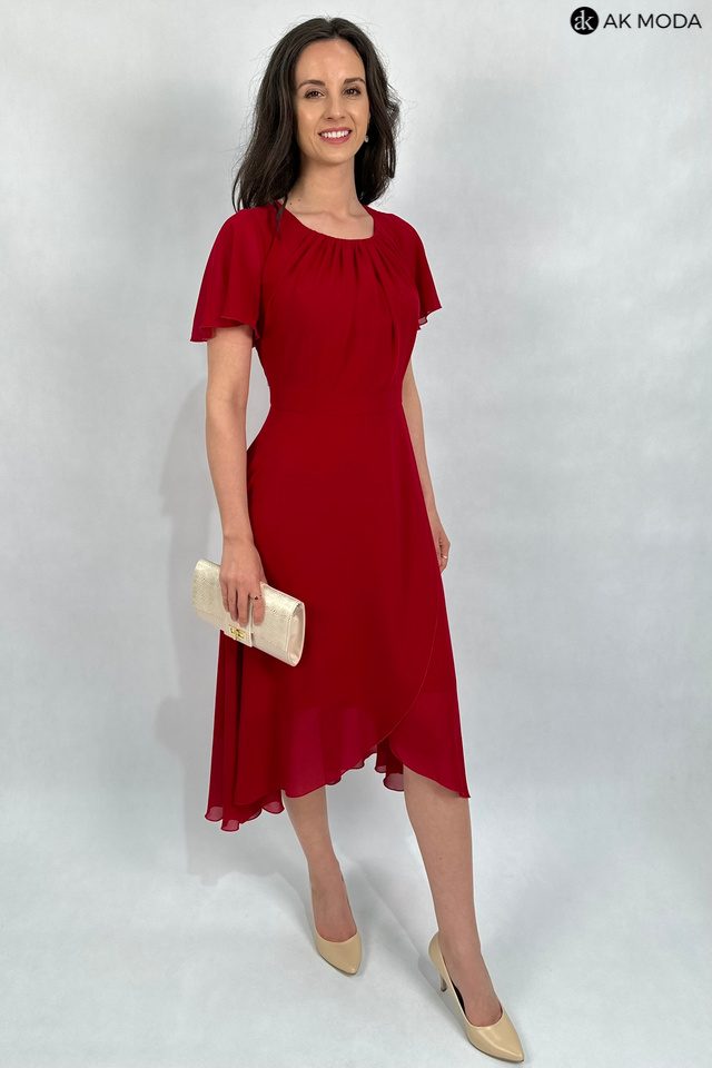Elegancka, rozkloszowana sukienka midi w kolorze czerwonym z asymetrycznym dołem. Dekolt okrągły z marszczeniem, krótkie luźne rękawki.
