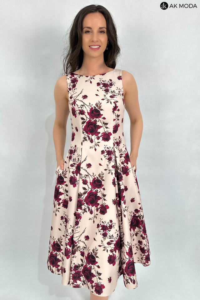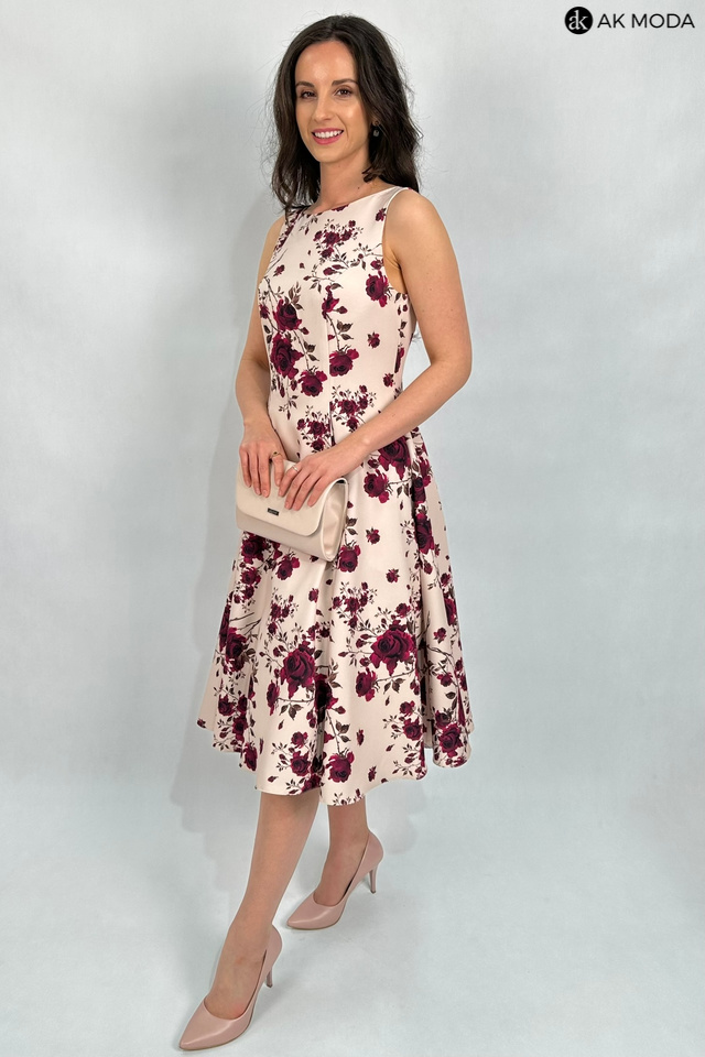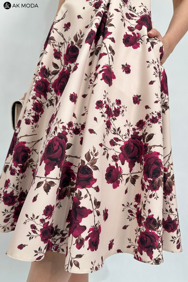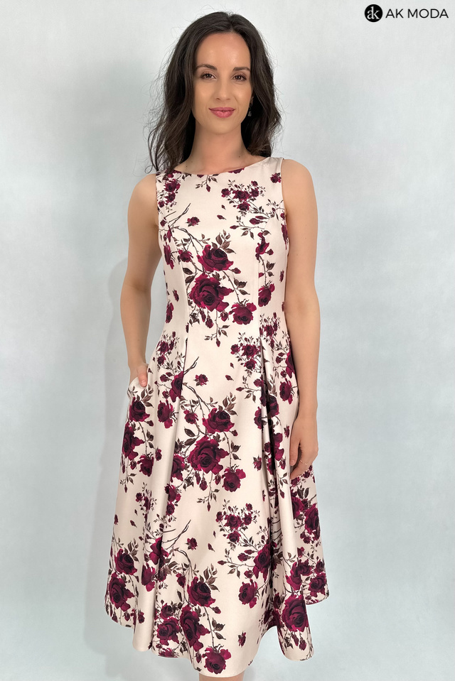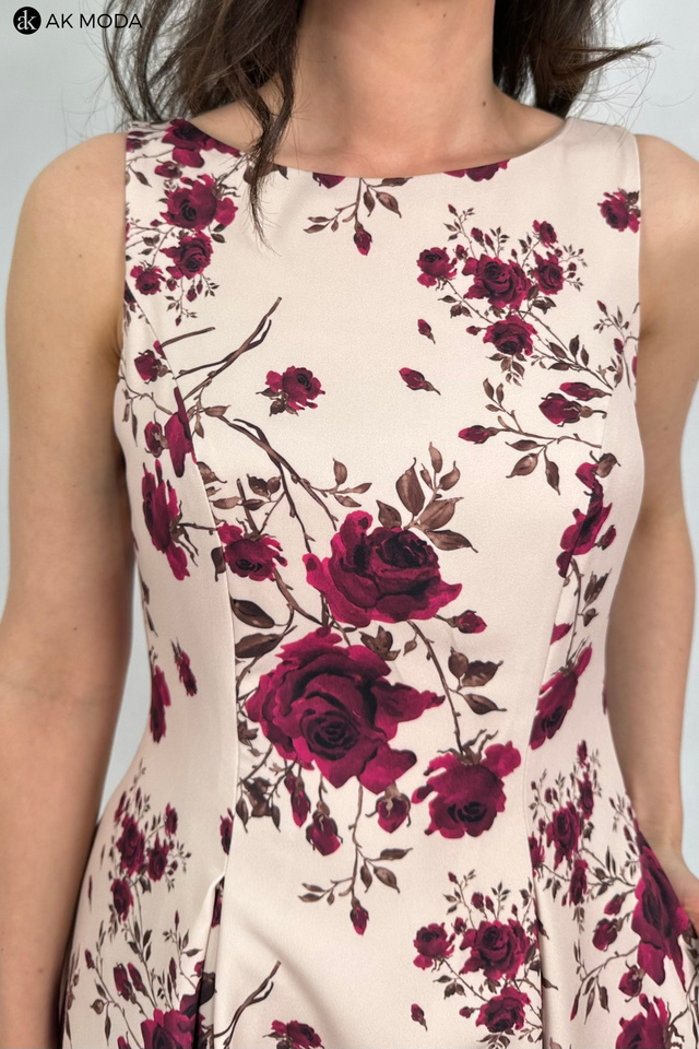 Elegancka sukienka midi w kolorze beżowym z kwiatowym printem. Dekolt okrągły, na plecach wycięcie w serek. Fason rozkloszowany z usztywnionym dołem i kieszeniami.