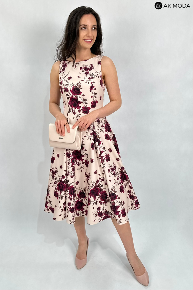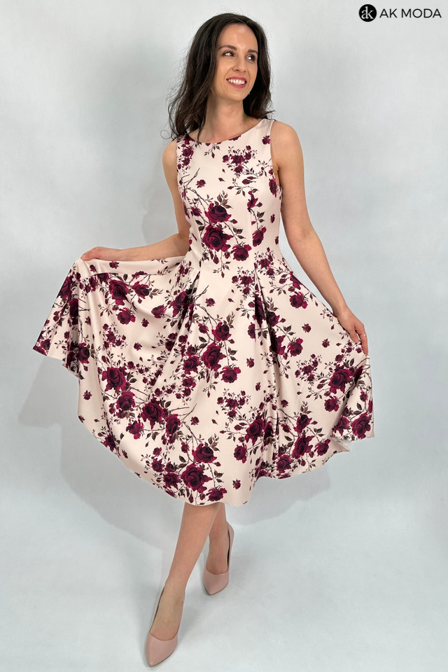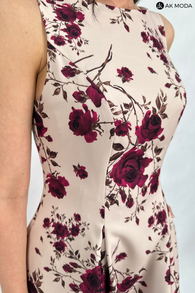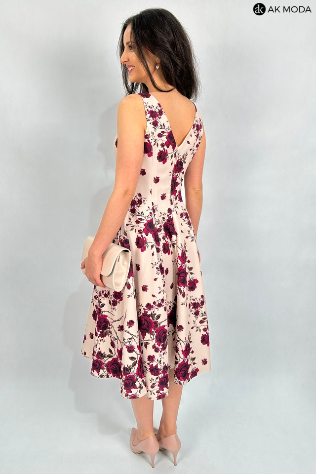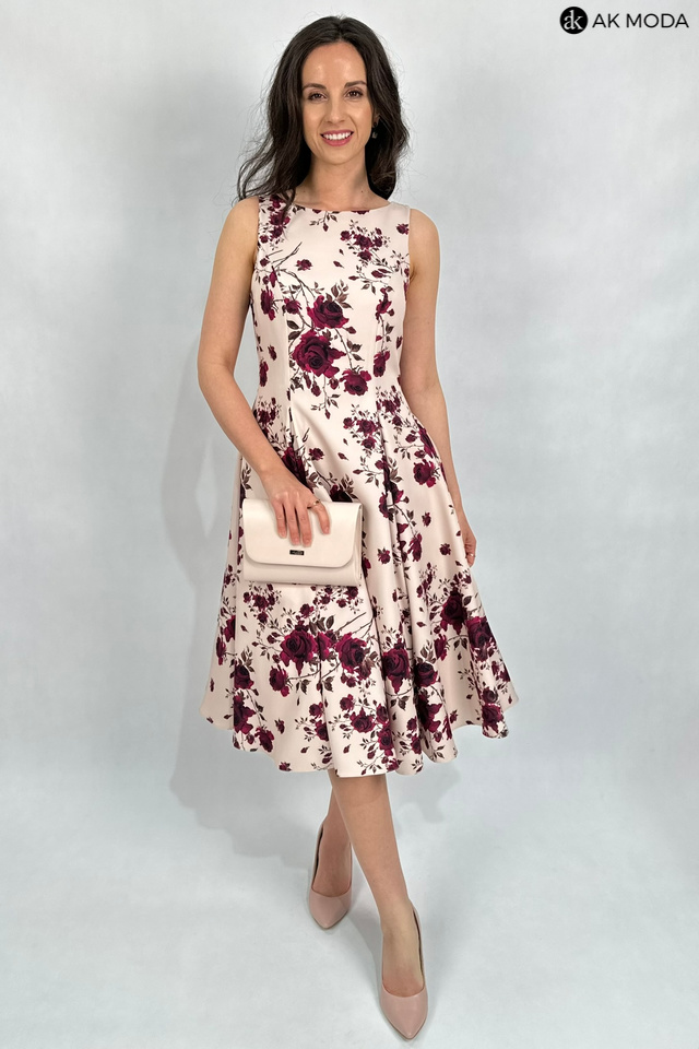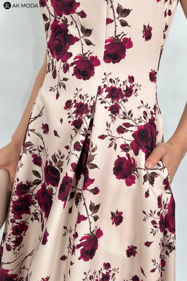 Elegancka sukienka midi w kolorze beżowym z kwiatowym printem. Dekolt okrągły, na plecach wycięcie w serek. Fason rozkloszowany z usztywnionym dołem i kieszeniami.
