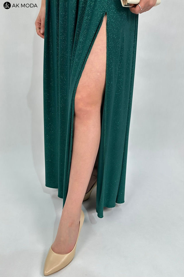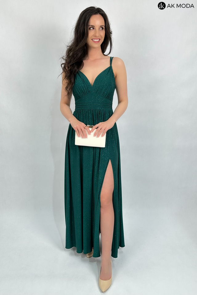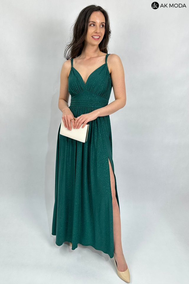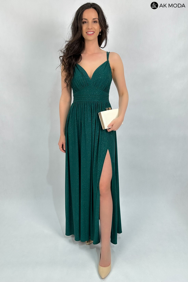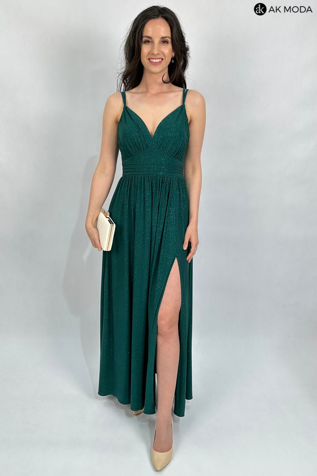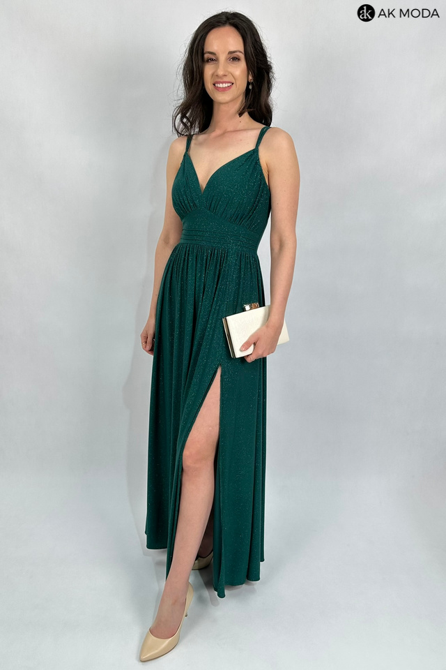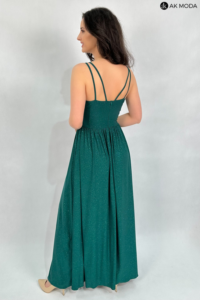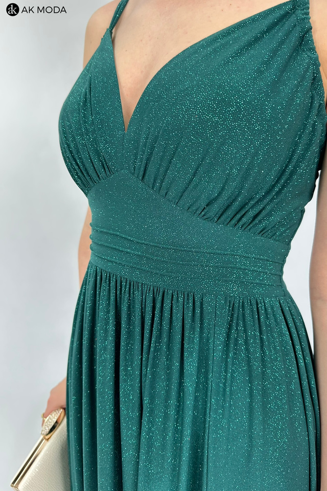 Długa rozkloszowanan sukienka w kolorze butelkowej zieleni, uszyta z elastycznego, brokatowego materiału. Dekolt w szpic, cienkie, podwójne ramiączka.