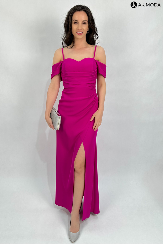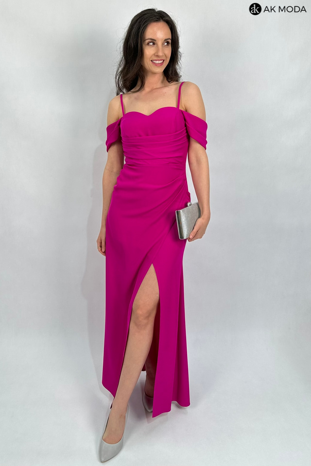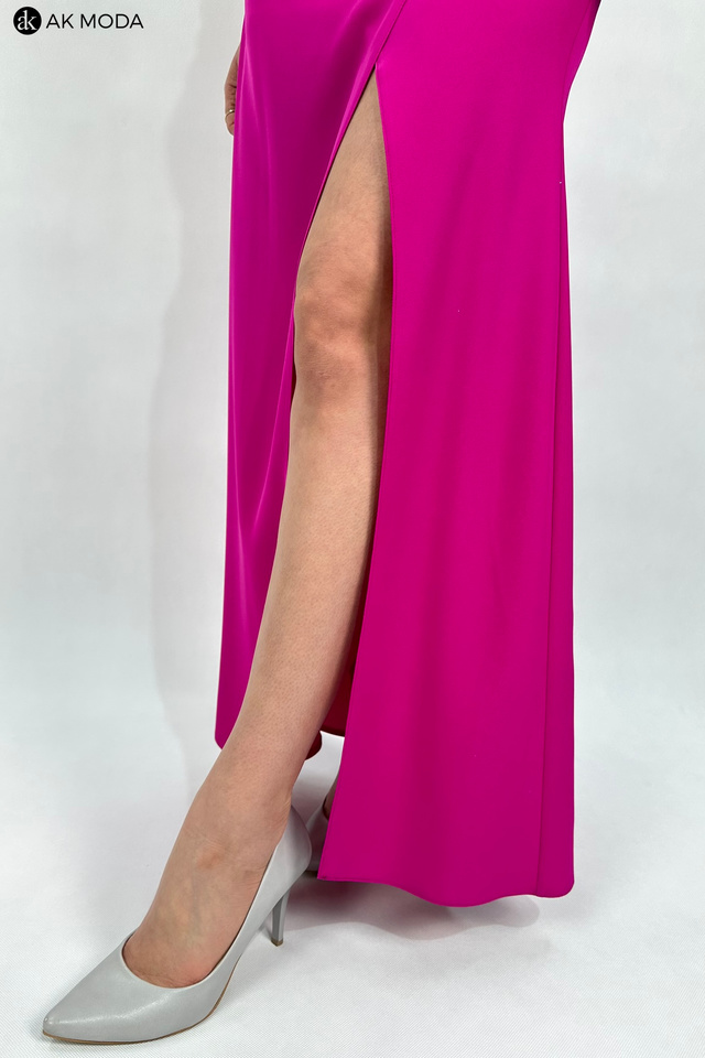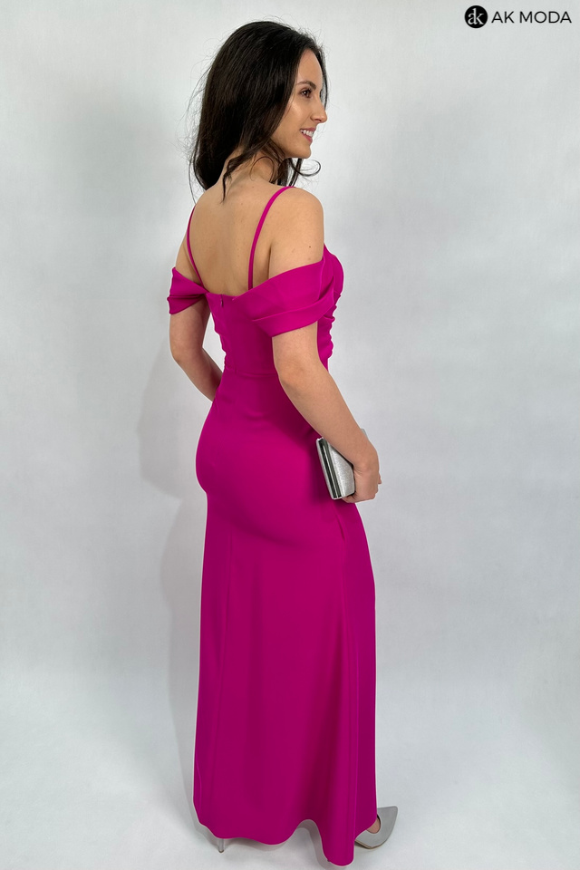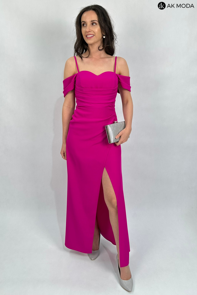 Długa, dopasowana sukienka w kolorze fuksjowym na cienkich szelkach i z opadającymi ramionami. Dekolt w kształcie serca, w talii marszczenie, dół zakładany.