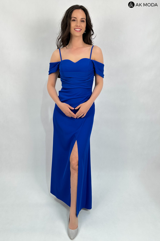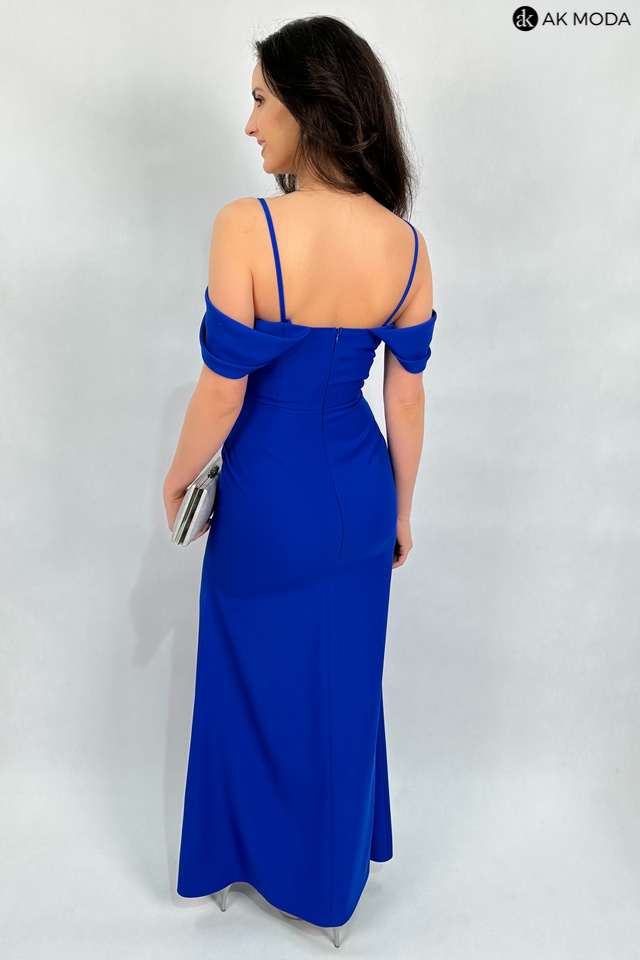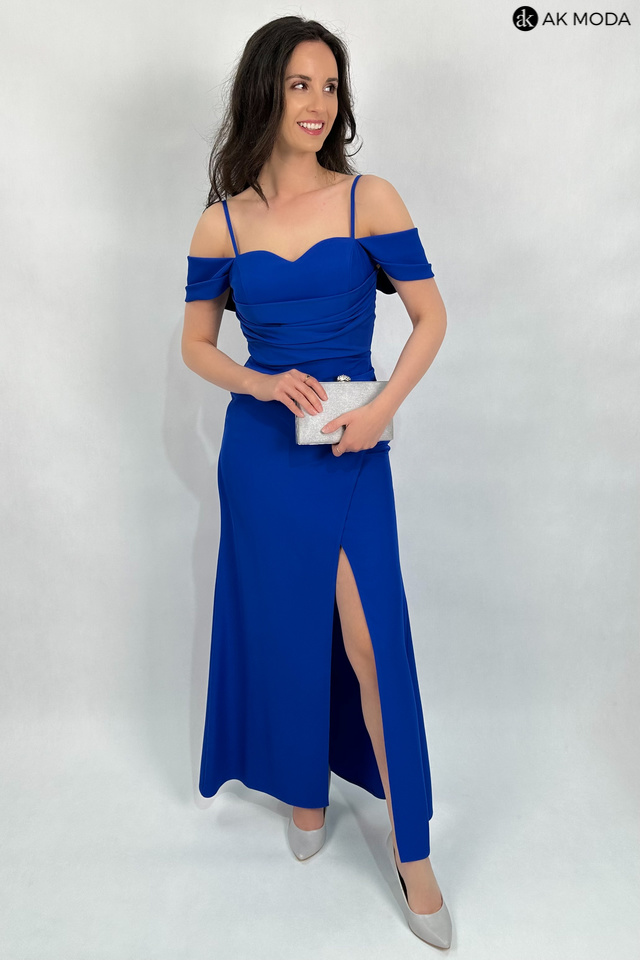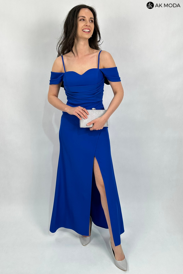 Długa, dopasowana sukienka w kolorze chabrowym na cienkich szelkach i z opadającymi ramionami. Dekolt w kształcie serca, w talii marszczenie, dół zakładany.