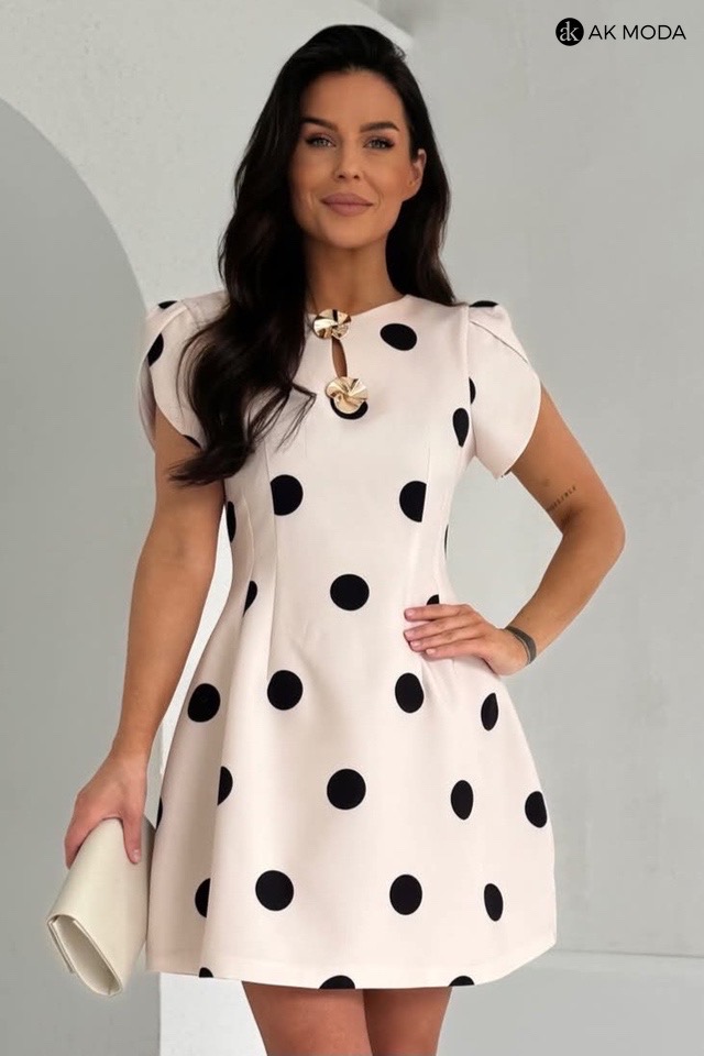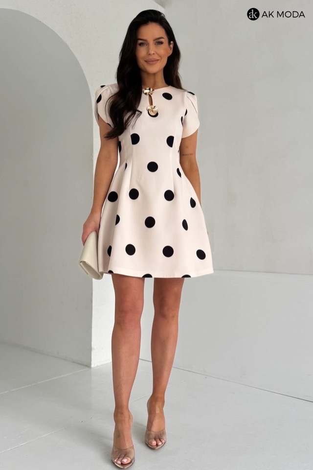 Rozkloszowana sukienka mini w kolorze beżowym w czarne grochy. Dekolt okrągły z wycięciem, krótkie kopertowe rękawki.