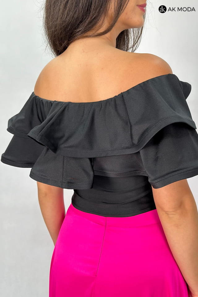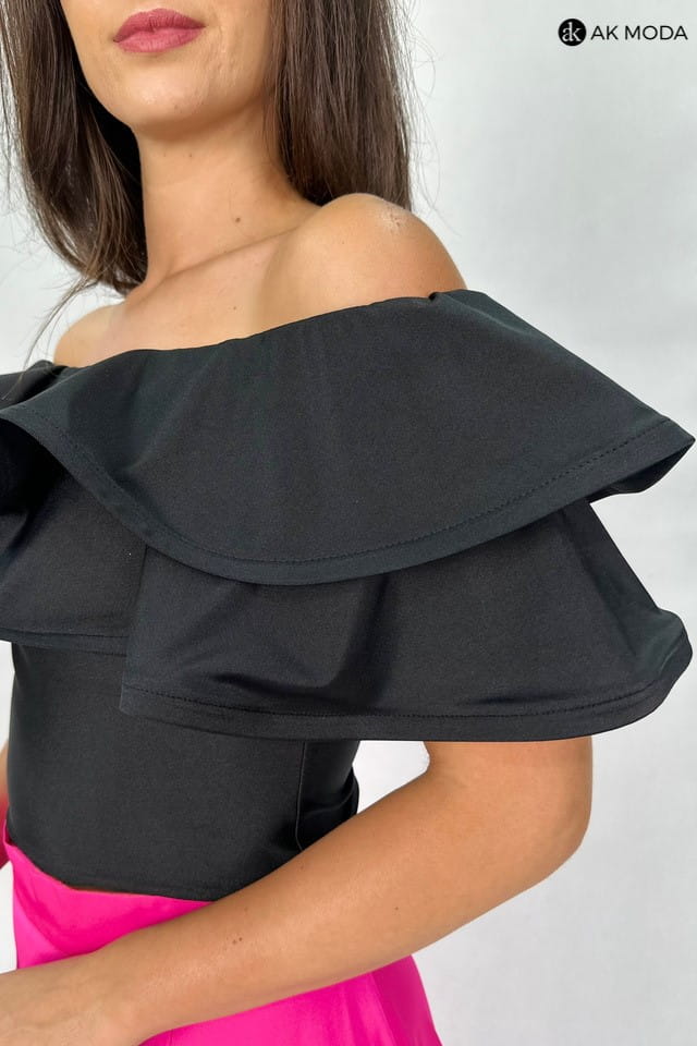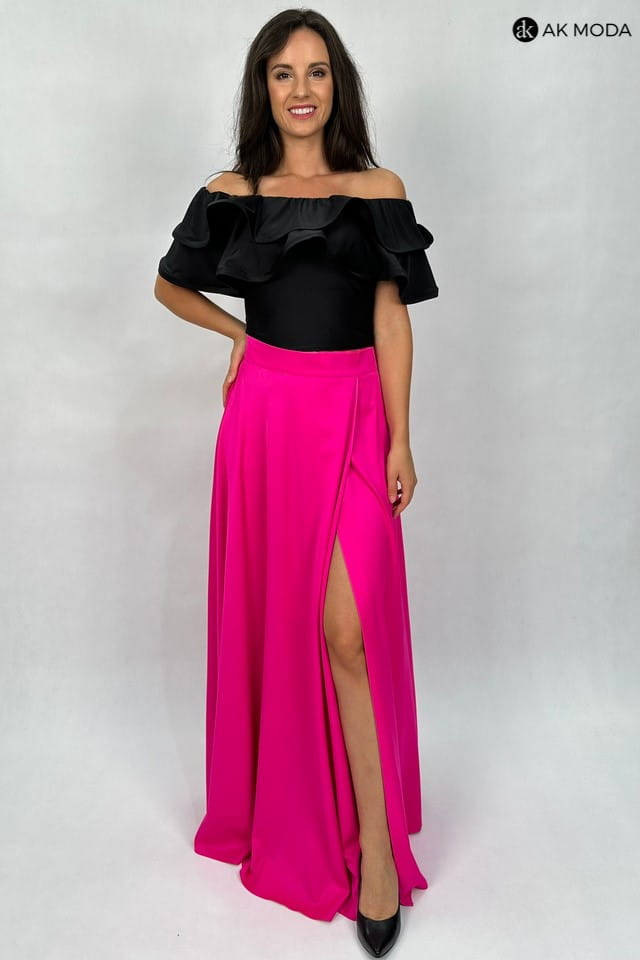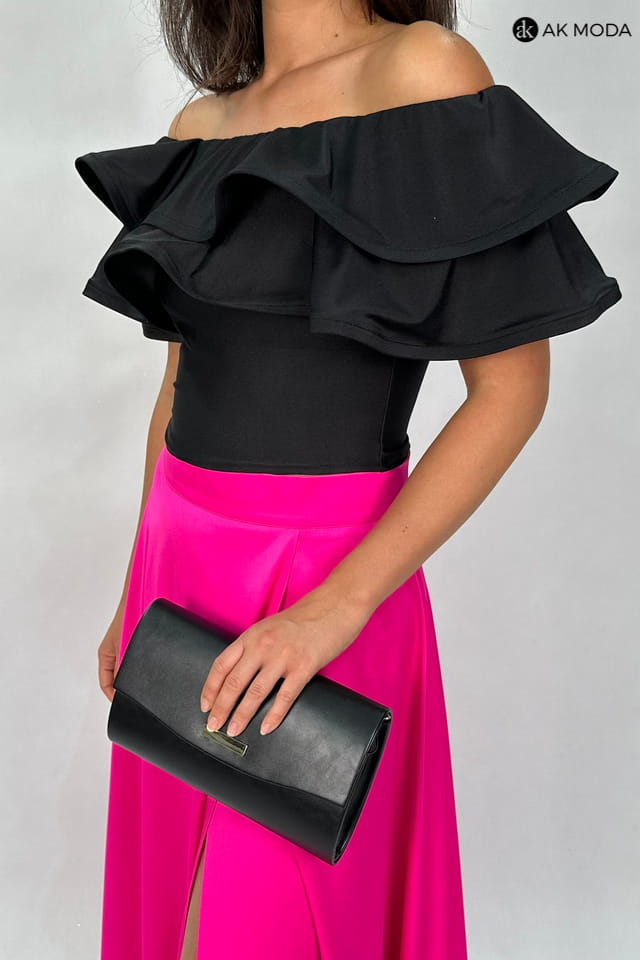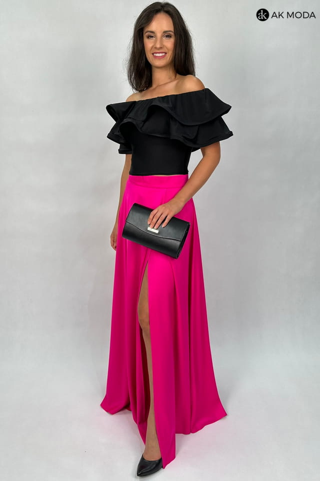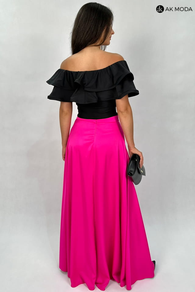 Komplet damski w kolorze czarno - różowym. W skład zestawu wchodzi elastyczna, czarna bluzka z hiszpańskim dekoltem z falbankami, oraz rozkloszowana, zakładana różowa spódnica.