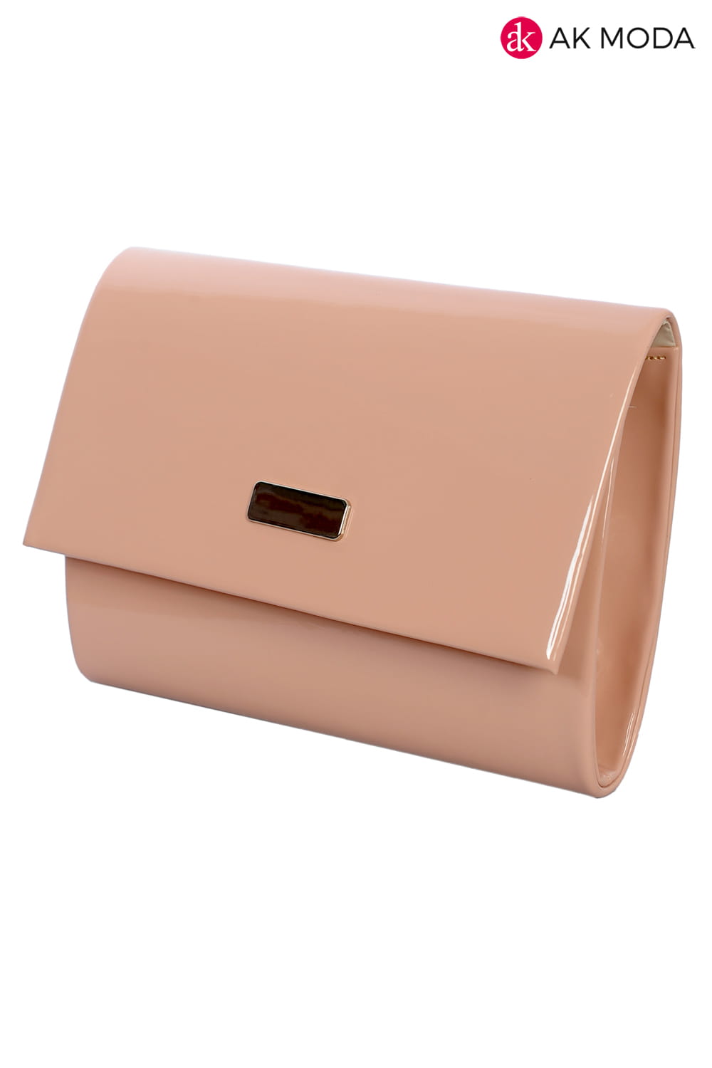 Elegancka lakierowana kopertówka posiadająca sztywną konstrukcję.