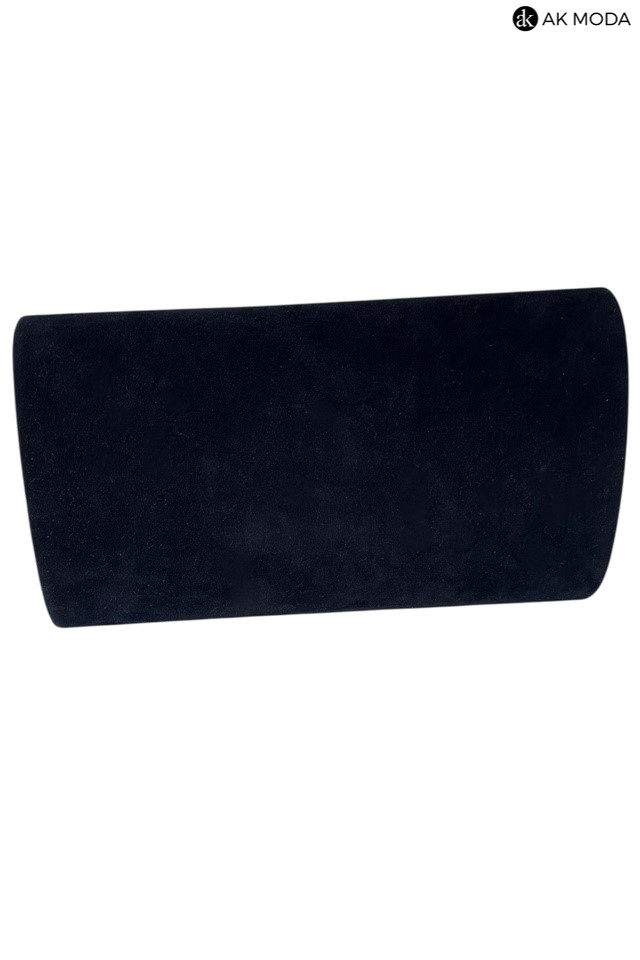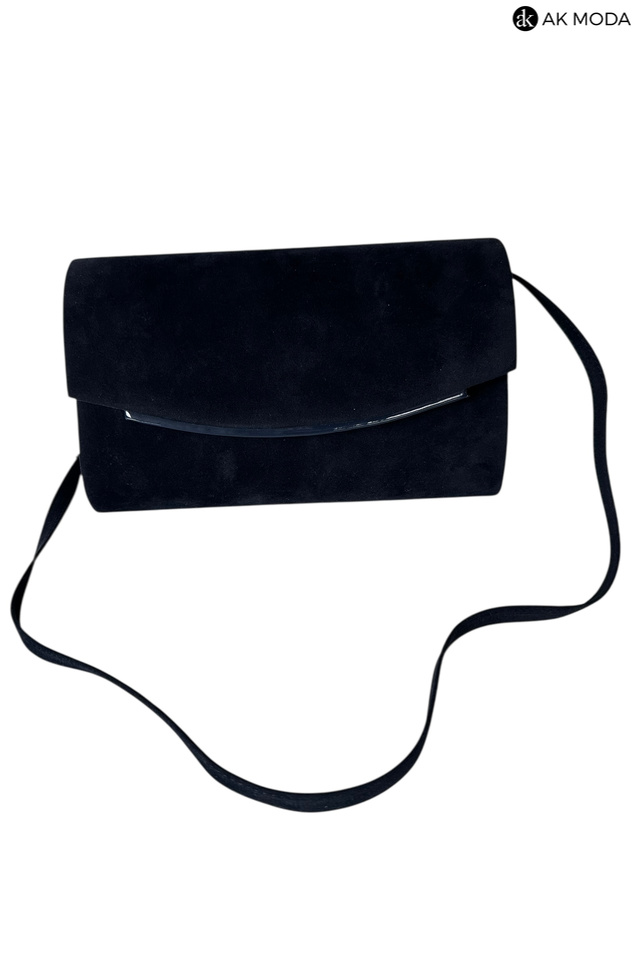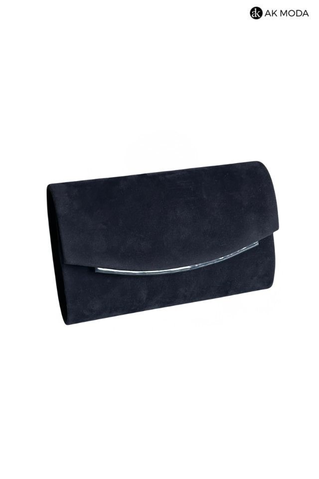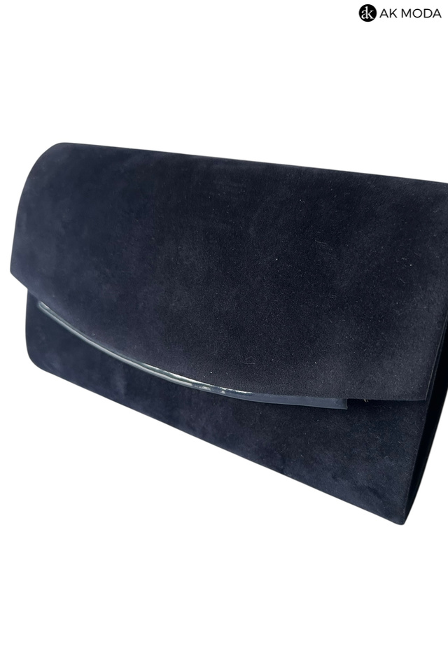 Mała elegancka kopertówka w kolorze granatowym o sztywnej konstrukcji, wykonana z imitacji zamszu z lakierowaną wstawką na klapie. Torebka posiada odpinany pasek dzięki czemu można ją nosić w dłoni lub na ramieniu.