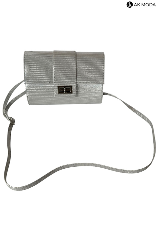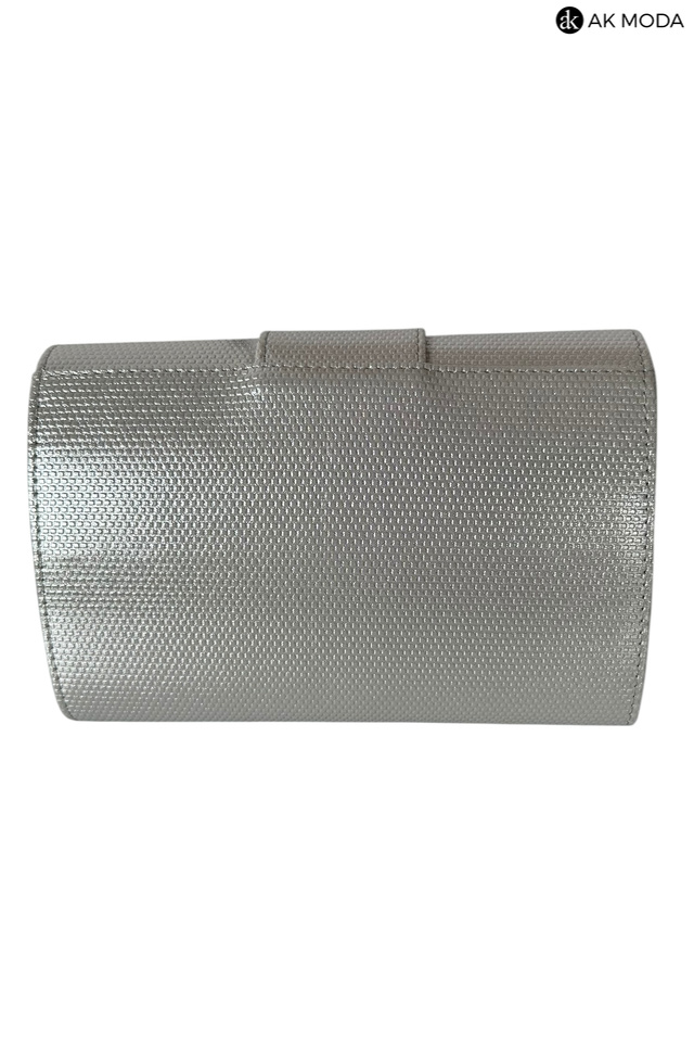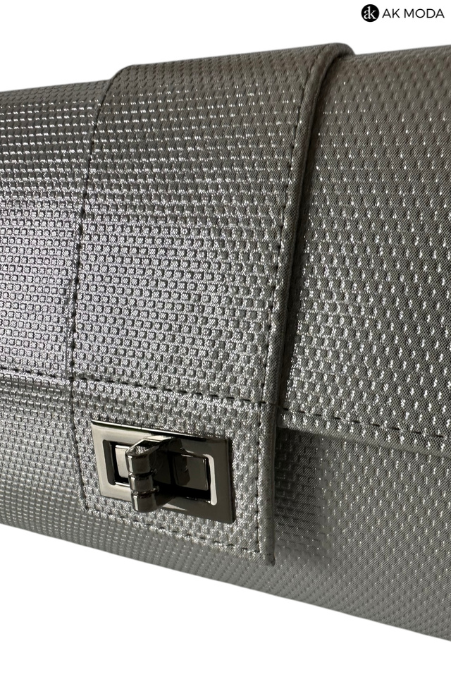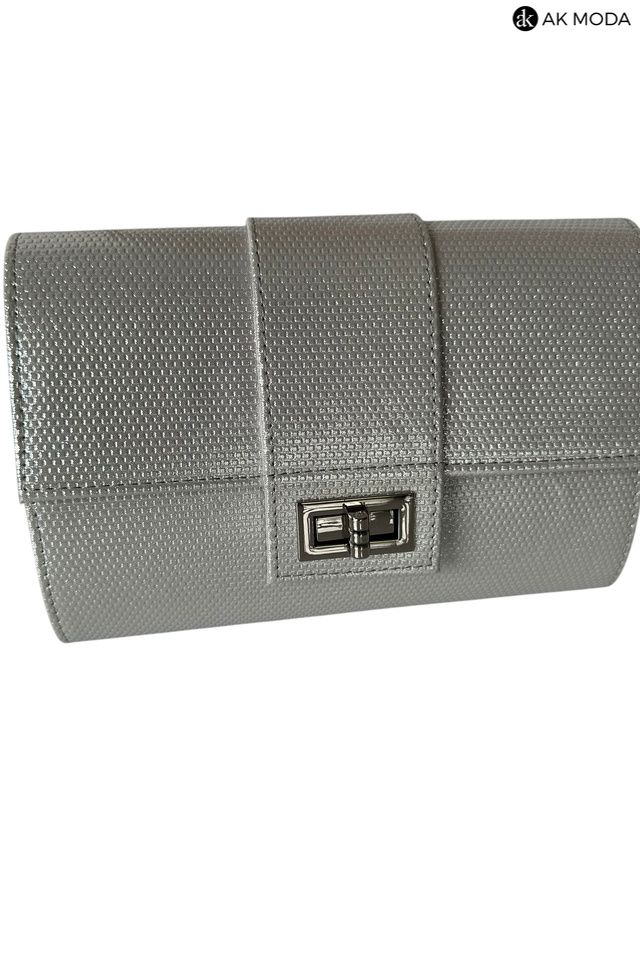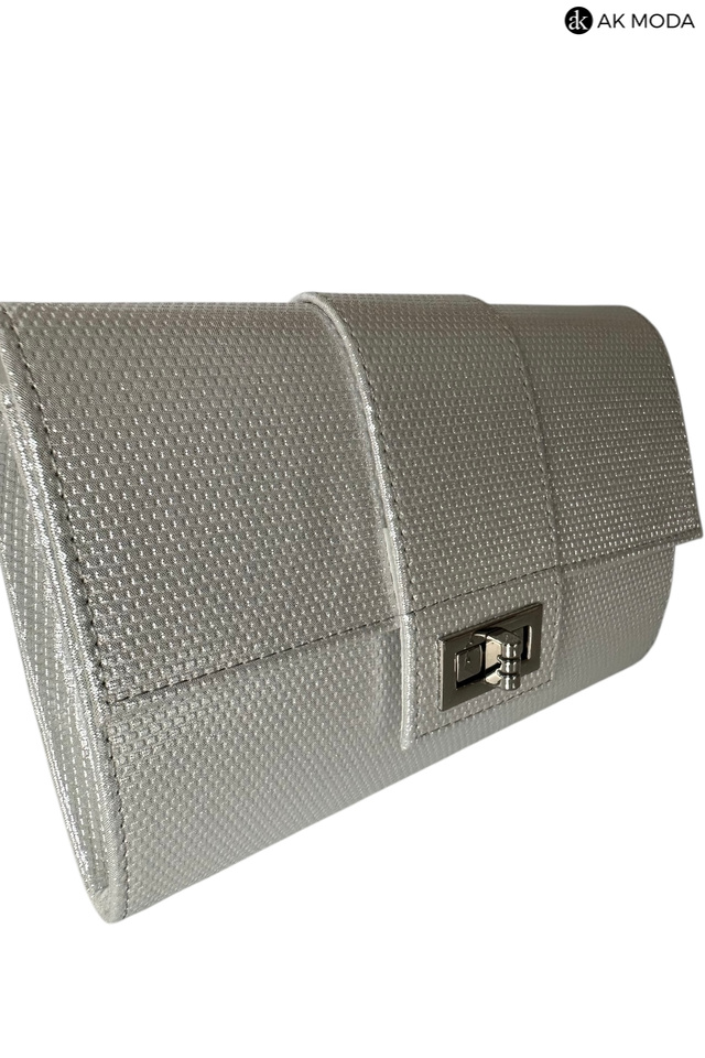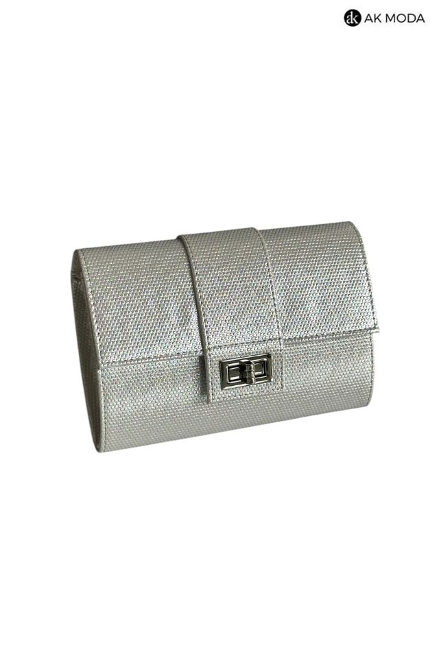 Mała elegancka kopertówka o sztywnej konstrukcji, w kolorze perłowym, wykonana z błyszcącego, fakturowanego materiału. Torebka posiada odpinany pasek dzięki czemu można ją nosić w dłoni lub na ramieniu.