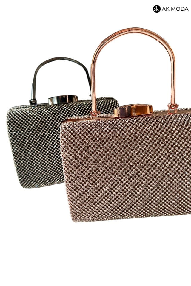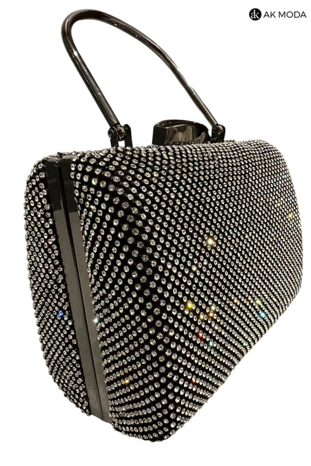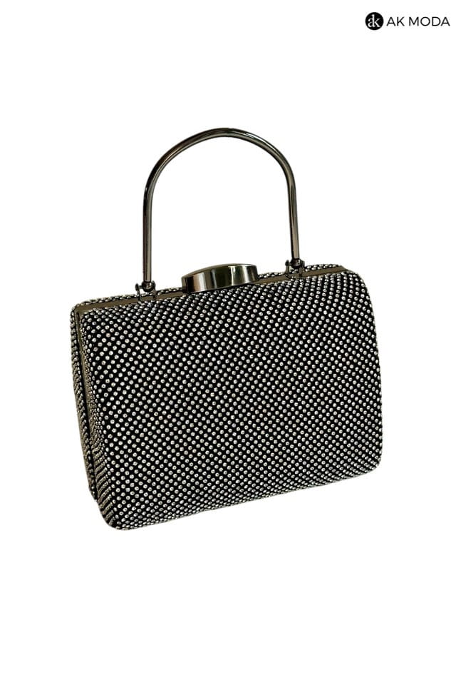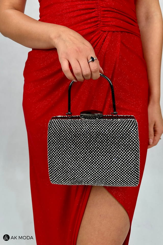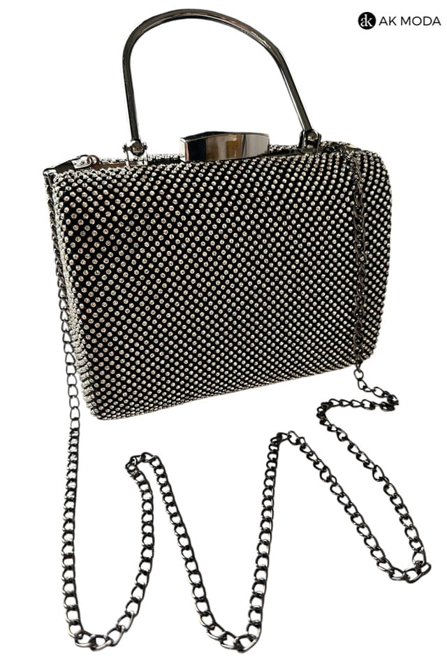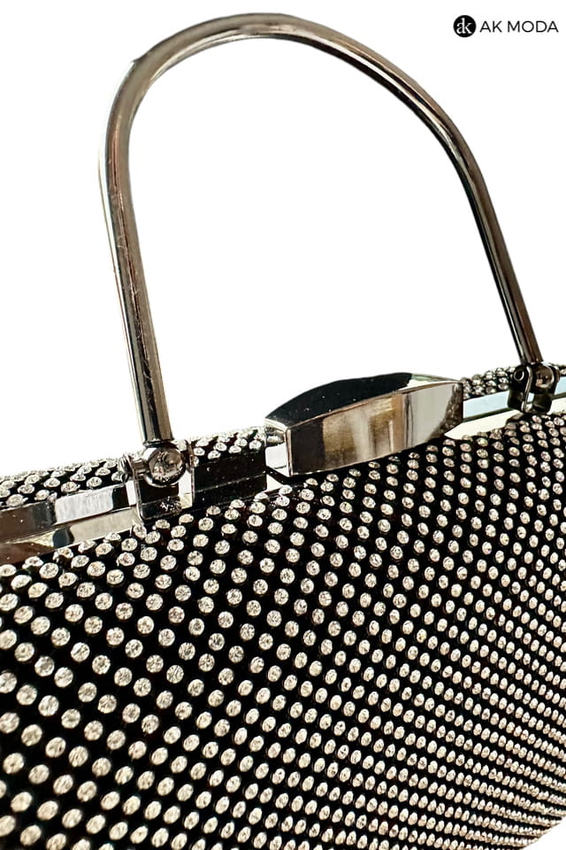 Elegancka torebka typu puzderko w kolorze czarnym z metalowym uchwytem i zapięciem na zatrzask. Torebka posiada odpinany łańcuszek, dzięki czemu można ją nosić zarówno w dłoni, jak i na ramieniu. Puzderko w całości wysadzane cyrkoniami.