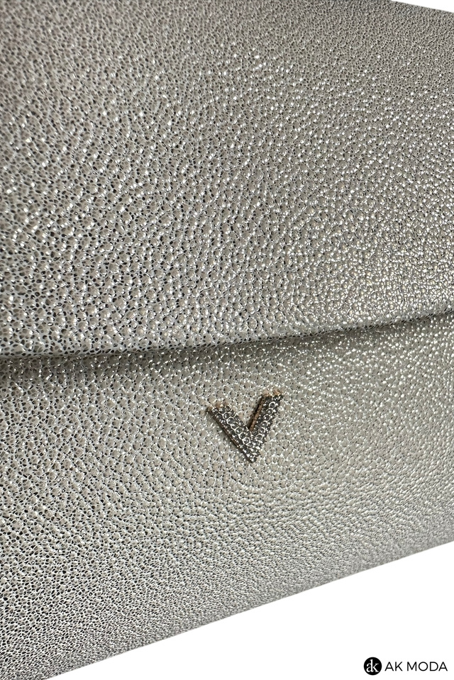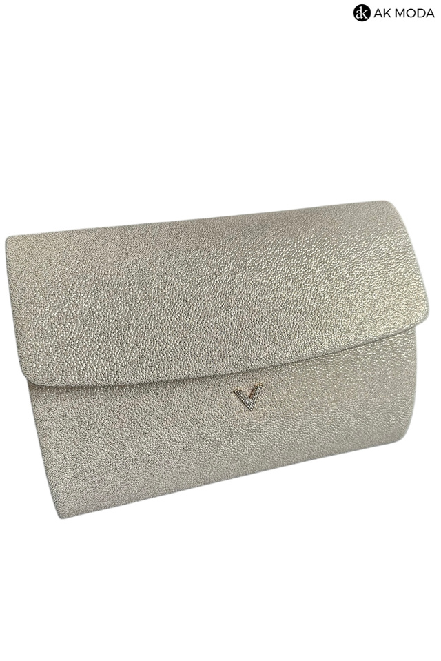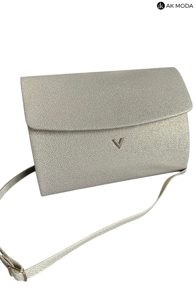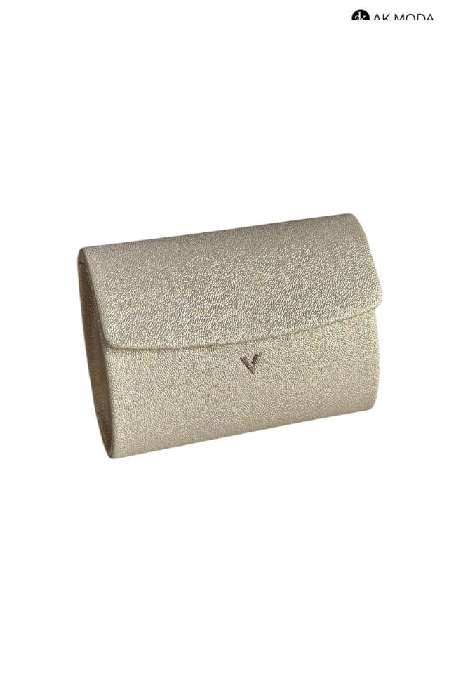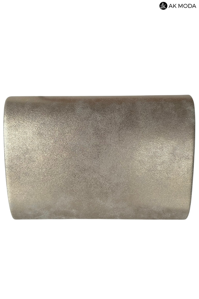 Mała elegancka kopertówka w kolorze złotym o sztywnej konstrukcji, wykonana z błyszczącego, fakturowanego materiału. Torebka posiada odpinany pasek dzięki czemu można ją nosić w dłoni lub na ramieniu.