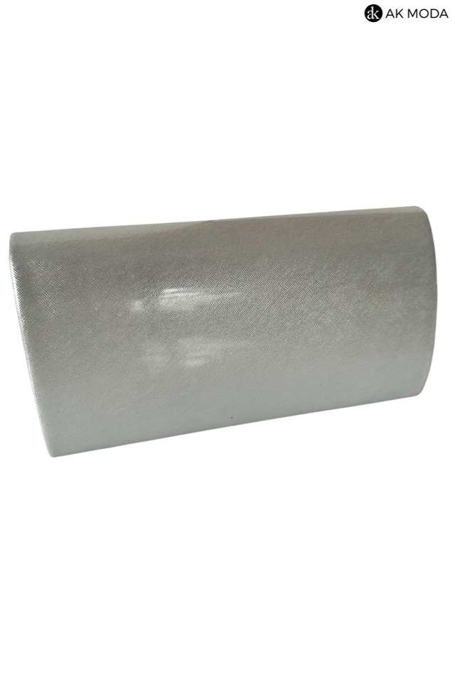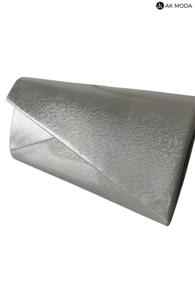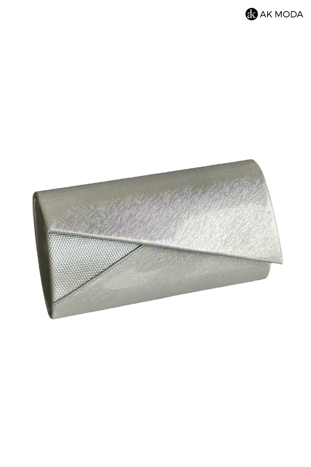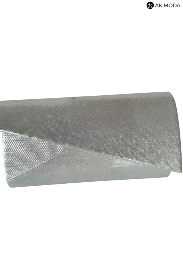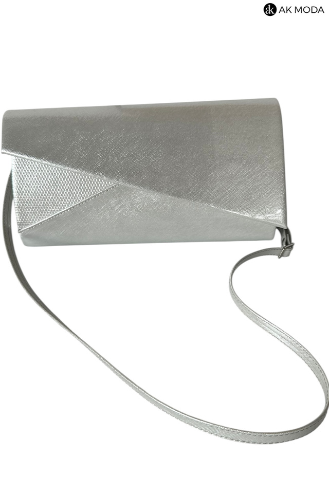 Mała elegancka kopertówka w kolorze perłowym, o sztywnej konstrukcji i asymetrycznym zapięciu. Torebka posiada odpinany pasek dzięki czemu można ją nosić w dłoni lub na ramieniu.