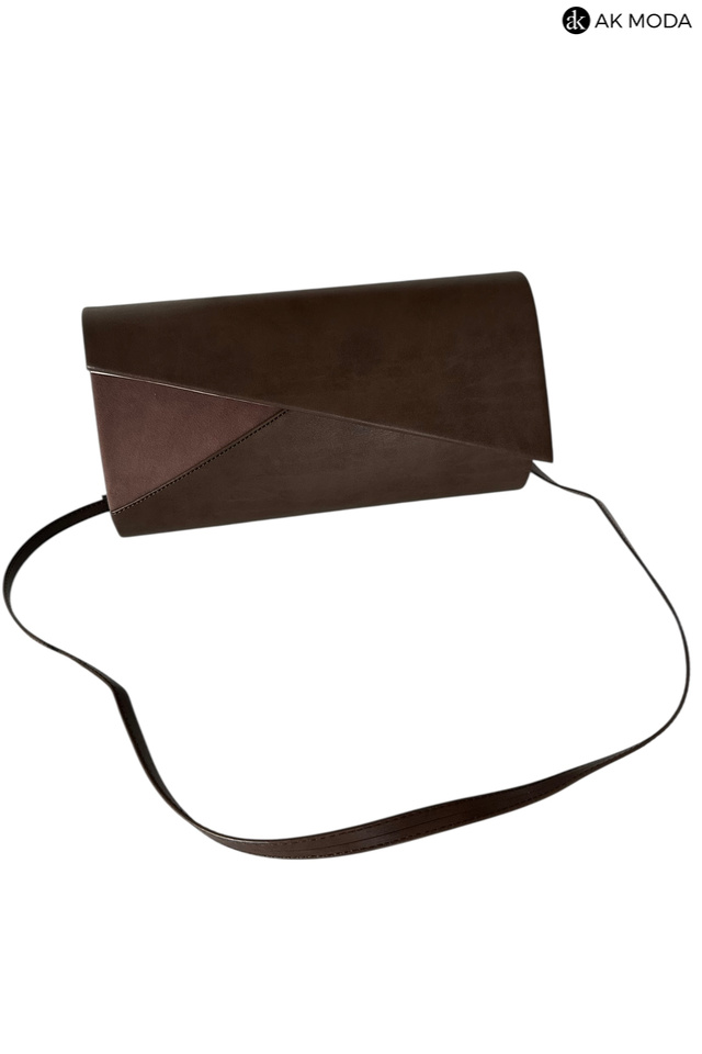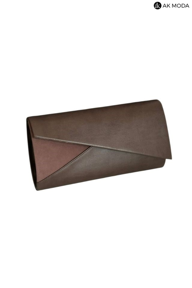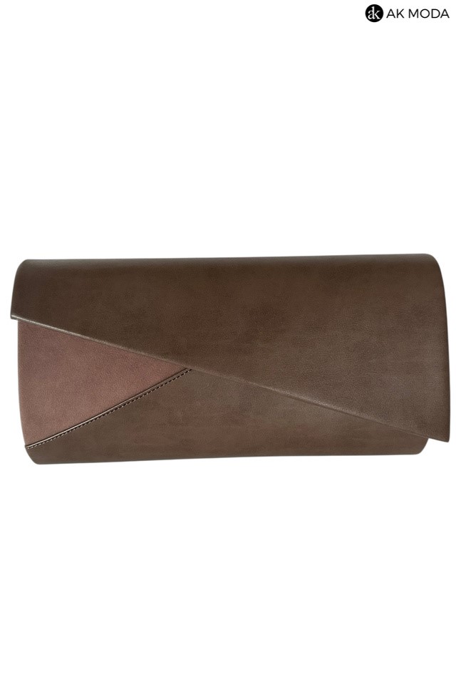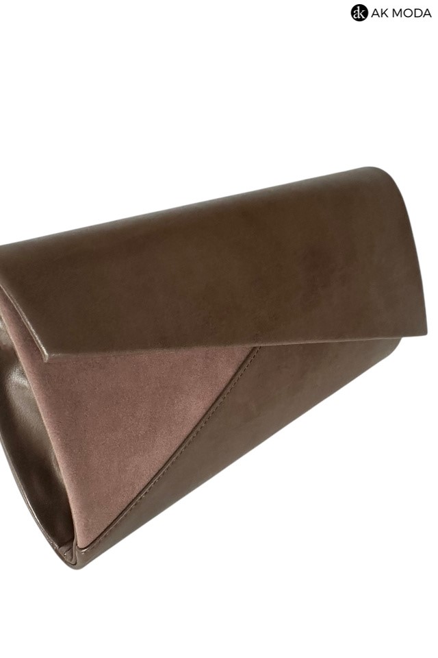 Mała elegancka kopertówka o sztywnej konstrukcji w kolorze brązowym, wykonana z gładkiej ekoskóry i zamszu. Torebka posiada odpinany pasek dzięki czemu można ją nosić w dłoni lub na ramieniu.