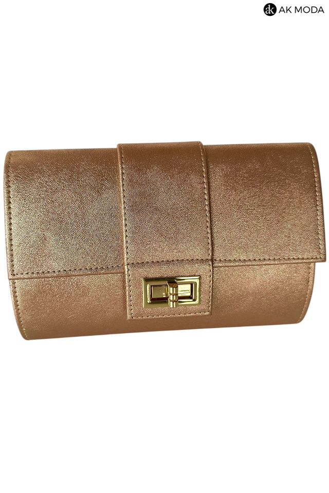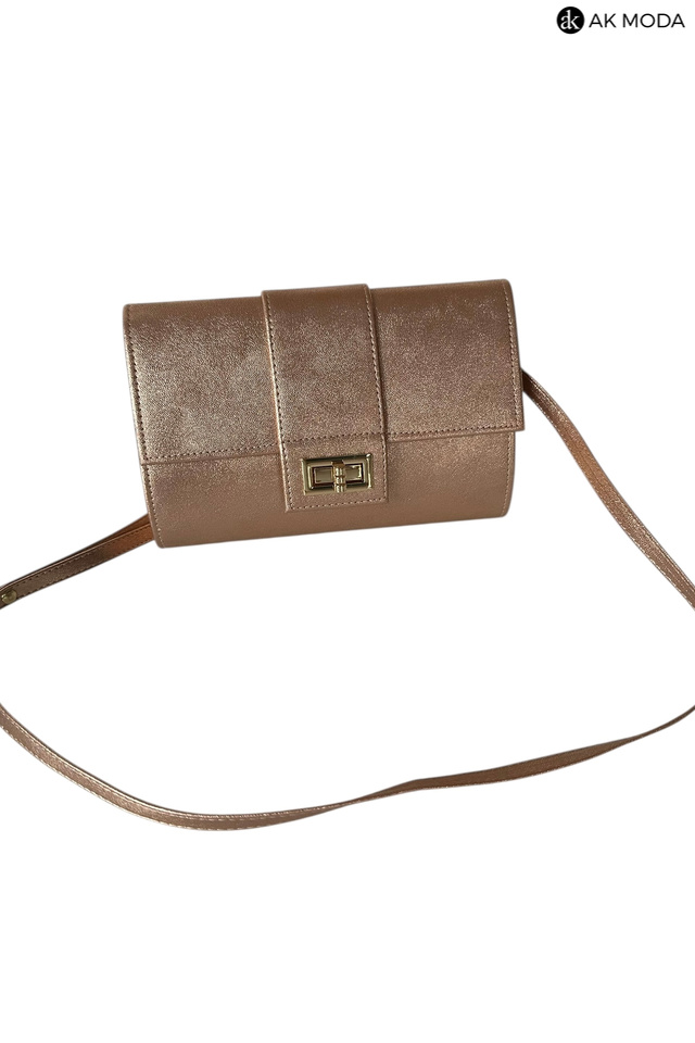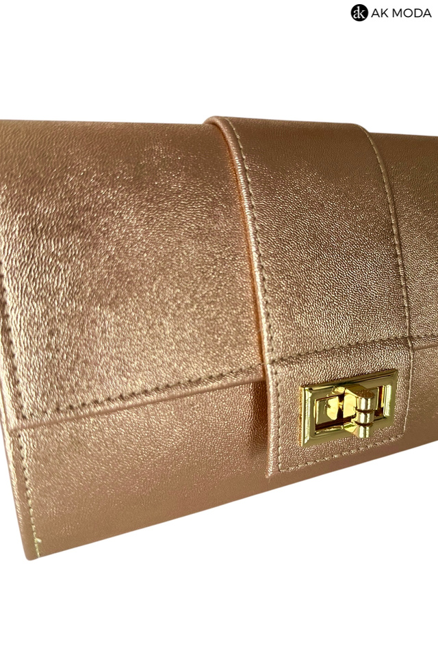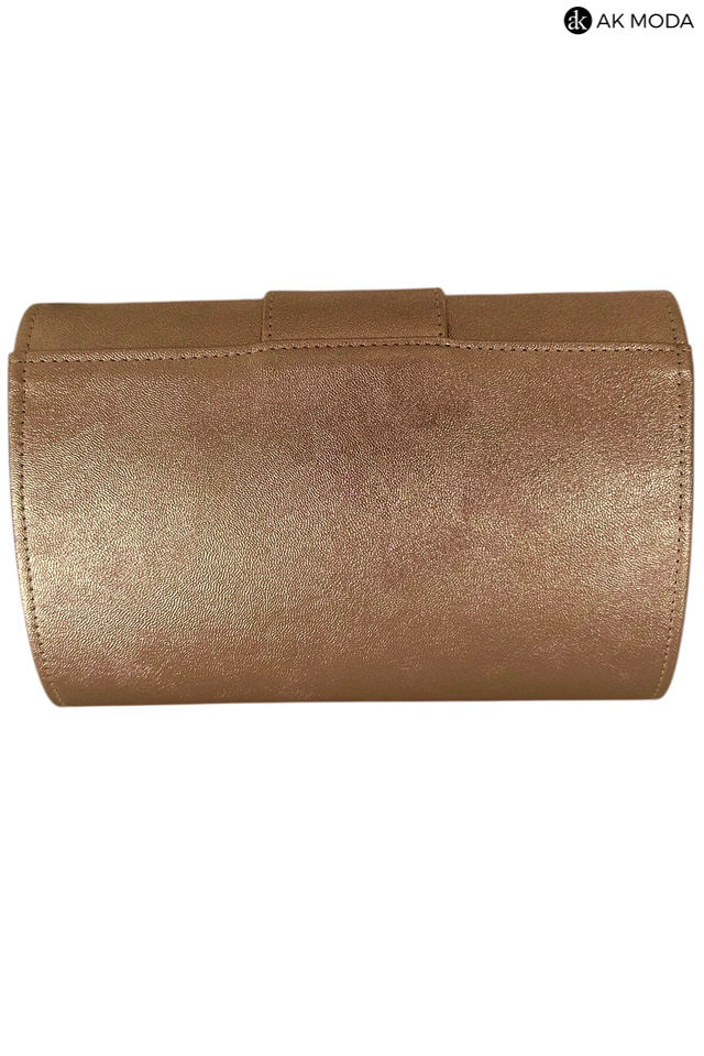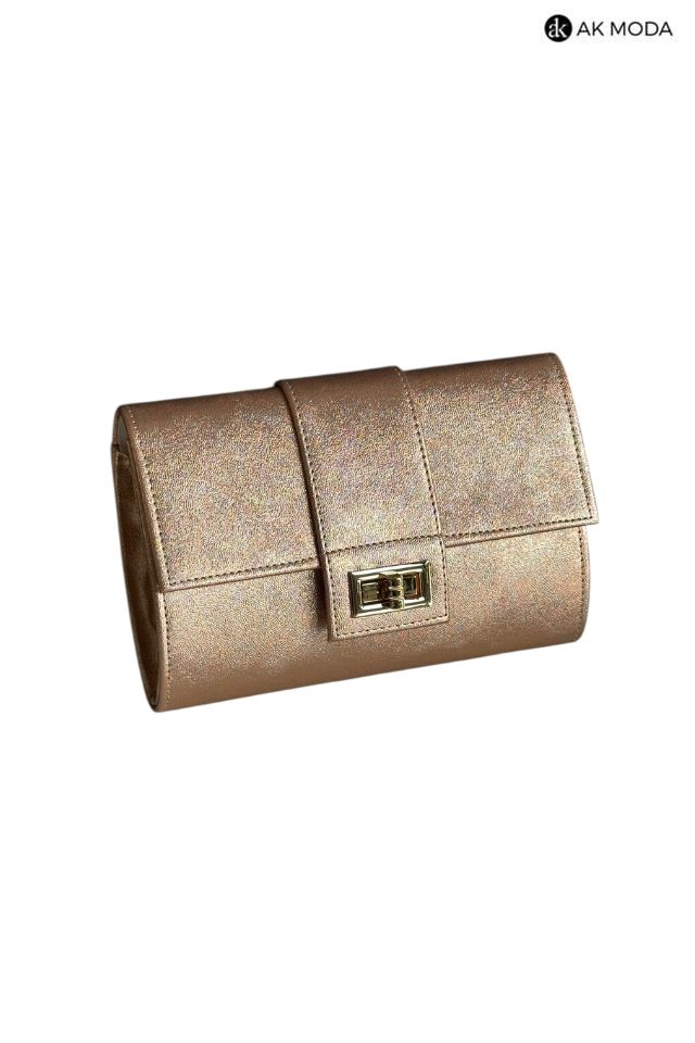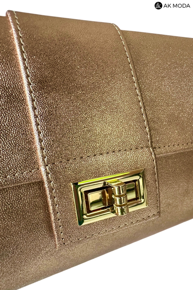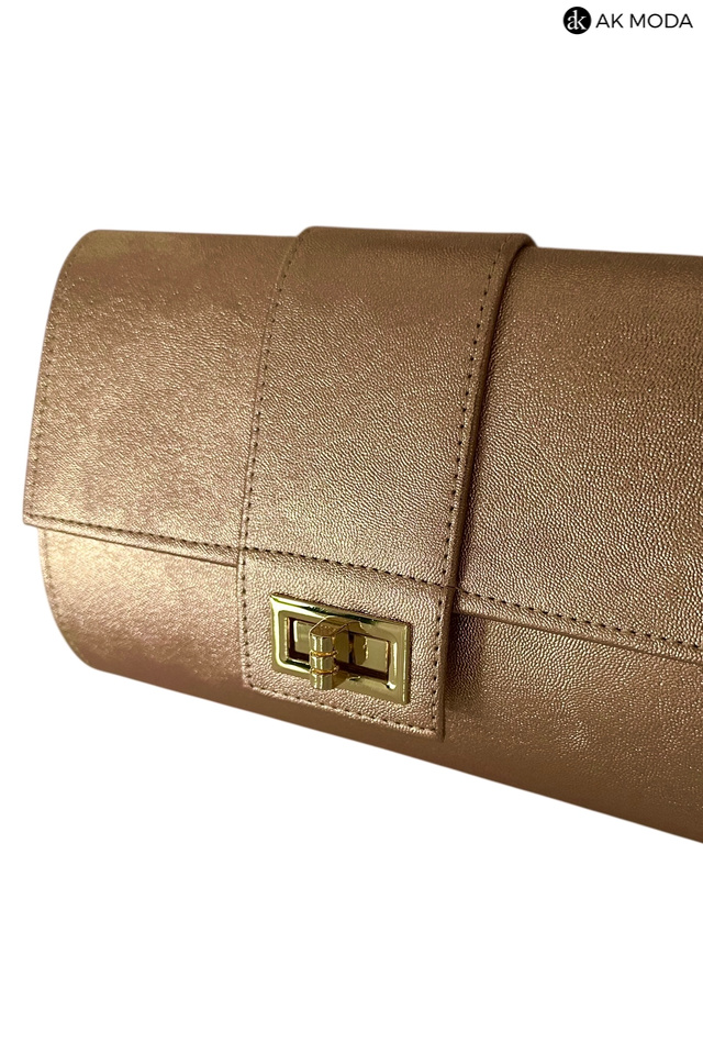 Mała elegancka kopertówka o sztywnej konstrukcji, w kolorze miedzianym, wykonana z błyszczącego, fakturowanego materiału. Torebka posiada odpinany pasek dzięki czemu można ją nosić w dłoni lub na ramieniu.