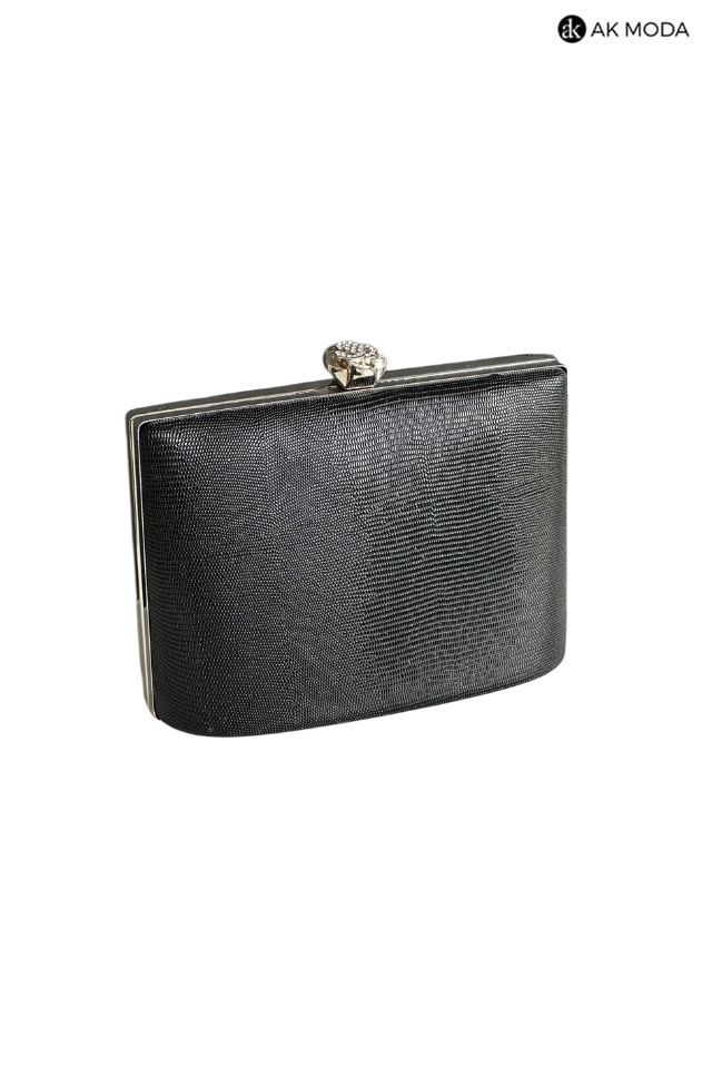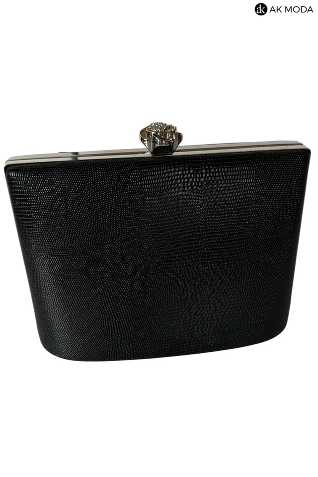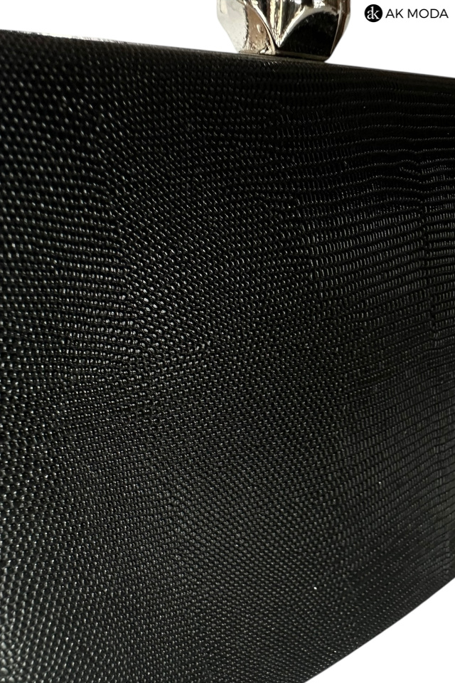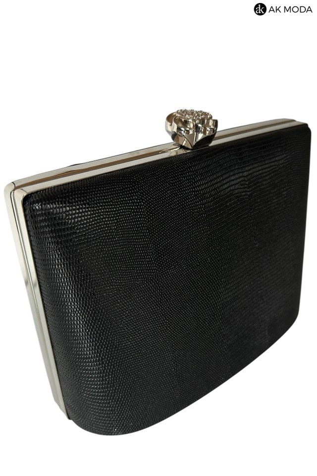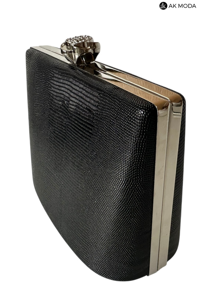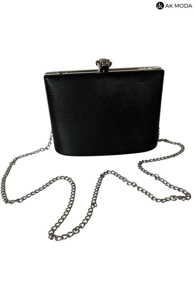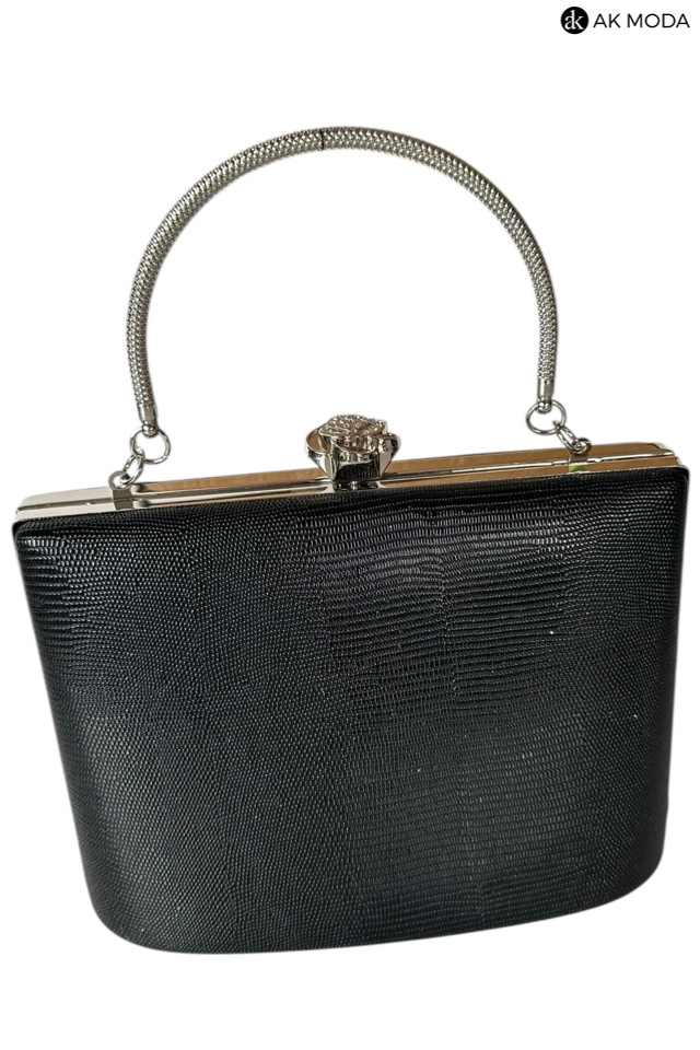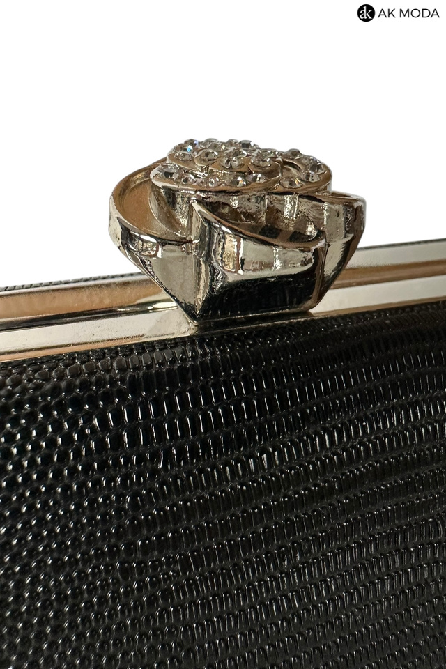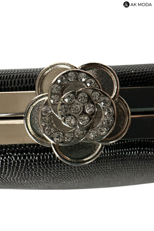 Elegancka torebka typu puzderko w kolorze czarnym z ozdobnym zapieciem w kształcie kwiatka z cyrkoniami. Torebka posiada odpinany łańcuszek oraz uchwyt, dzięki czemu można ją nosić zarówno w dłoni, jak i na ramieniu. Puzderko wykonane z fakturowanego, błyszczącego materiału.