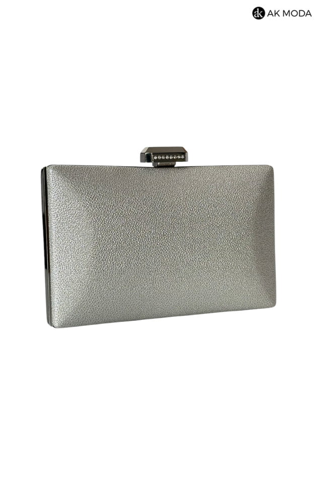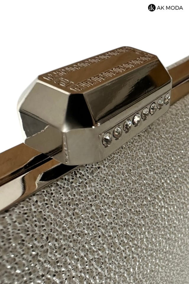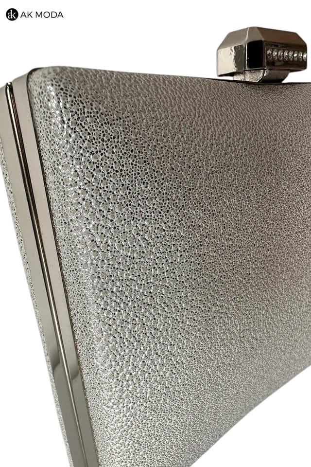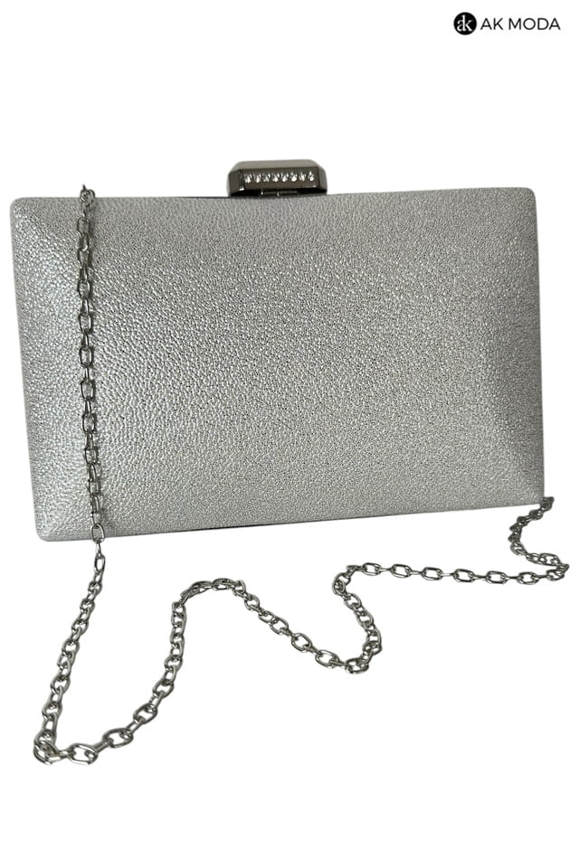 Elegancka torebka typu puzderko w kolorze srebrnym, z zapieciem na zatrzask ozdobiony cyrkoniami. Torebka posiada odpinany długi łańcuszek, dzięki czemu można ją nosić zarówno w dłoni, jak i na ramieniu. Puzderko wykonane z fakturowanego, błyszczacego materiału.