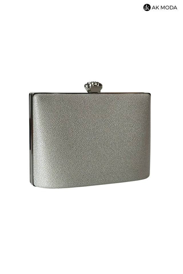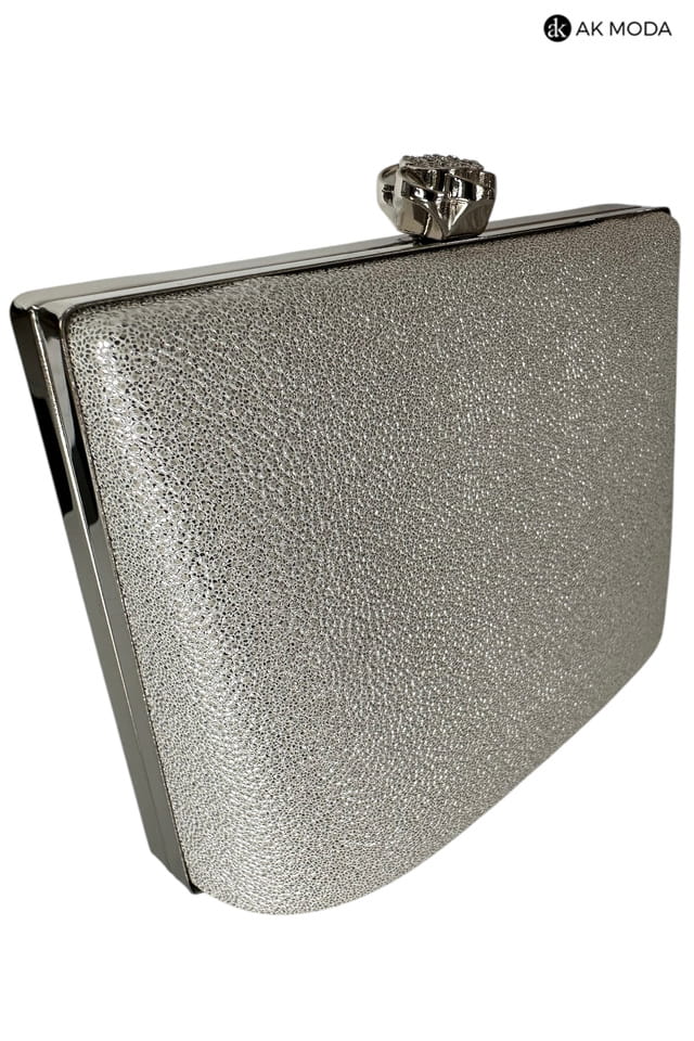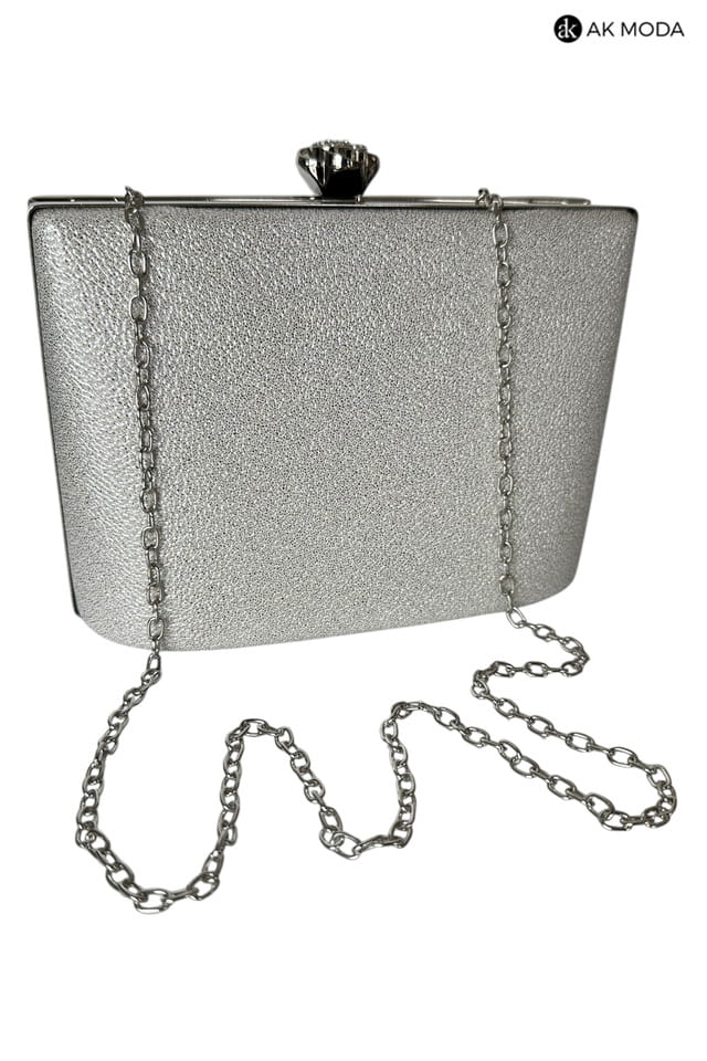 Elegancka torebka typu puzderko w kolorze srebrnym z ozdobnym zapieciem w kształcie kwiatka z cyrkoniami. Torebka posiada odpinany łańcuszek oraz uchwyt, dzięki czemu można ją nosić zarówno w dłoni, jak i na ramieniu. Puzderko wykonane z fakturowanego, błyszczącego materiału.