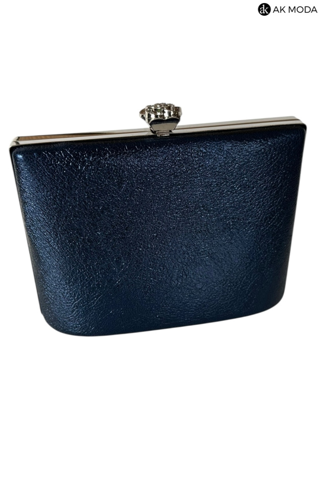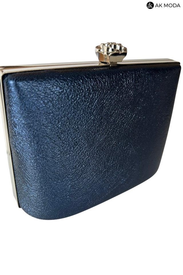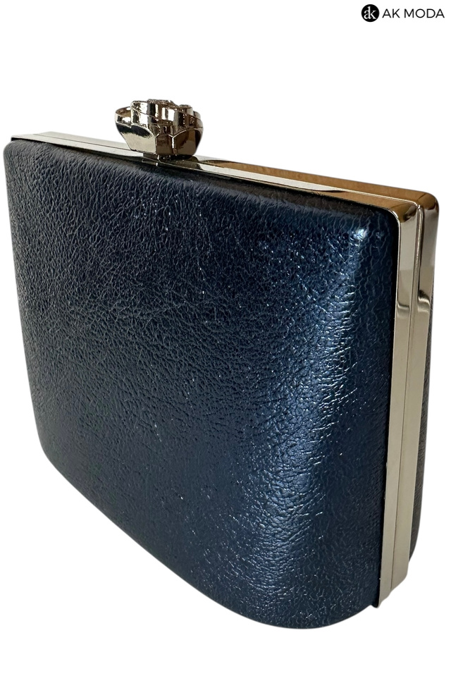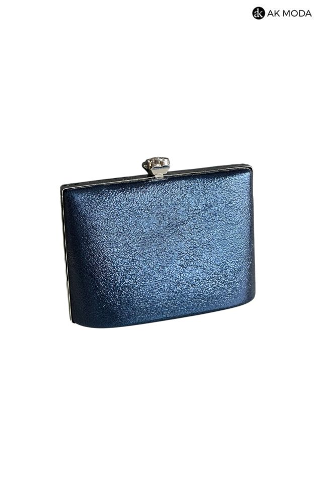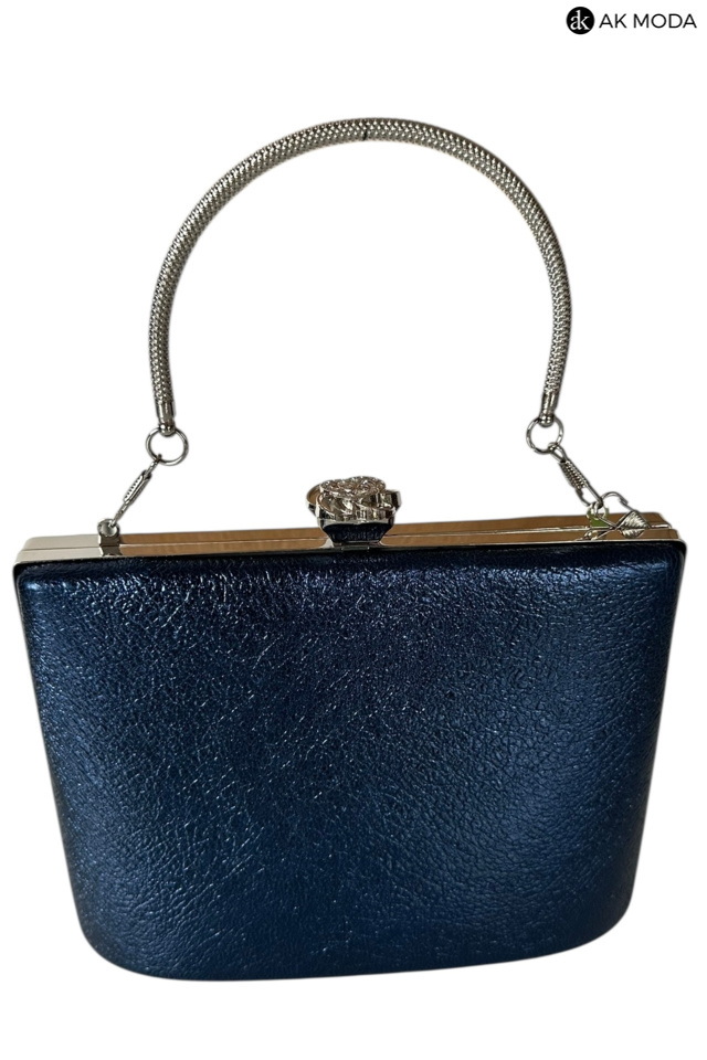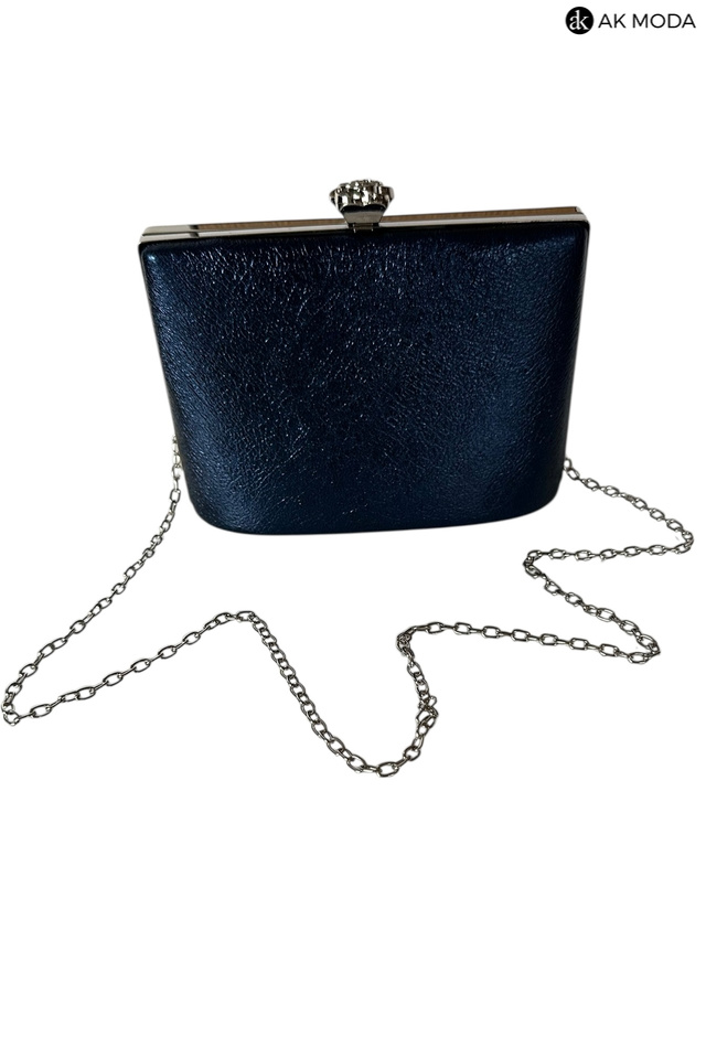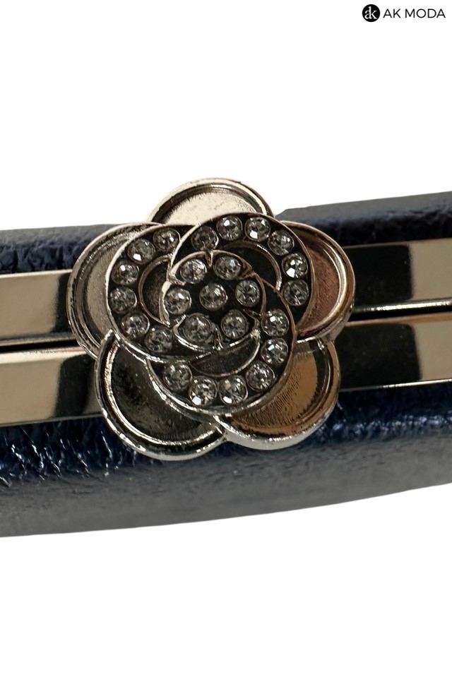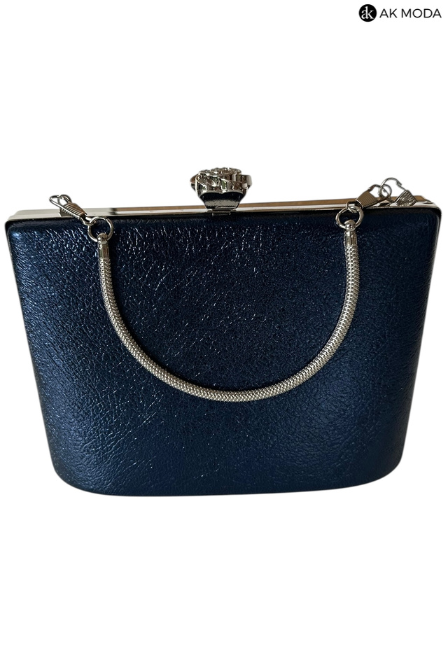Elegancka torebka typu puzderko w kolorze granatowym z ozdobnym zapieciem w kształcie kwiatka z cyrkoniami. Torebka posiada odpinany łańcuszek oraz uchwyt, dzięki czemu można ją nosić zarówno w dłoni, jak i na ramieniu. Puzderko wykonane z fakturowanego, błyszczącego materiału.