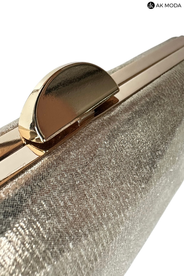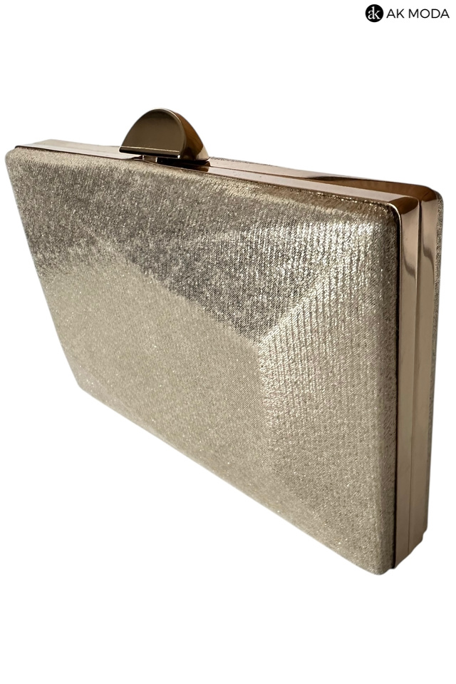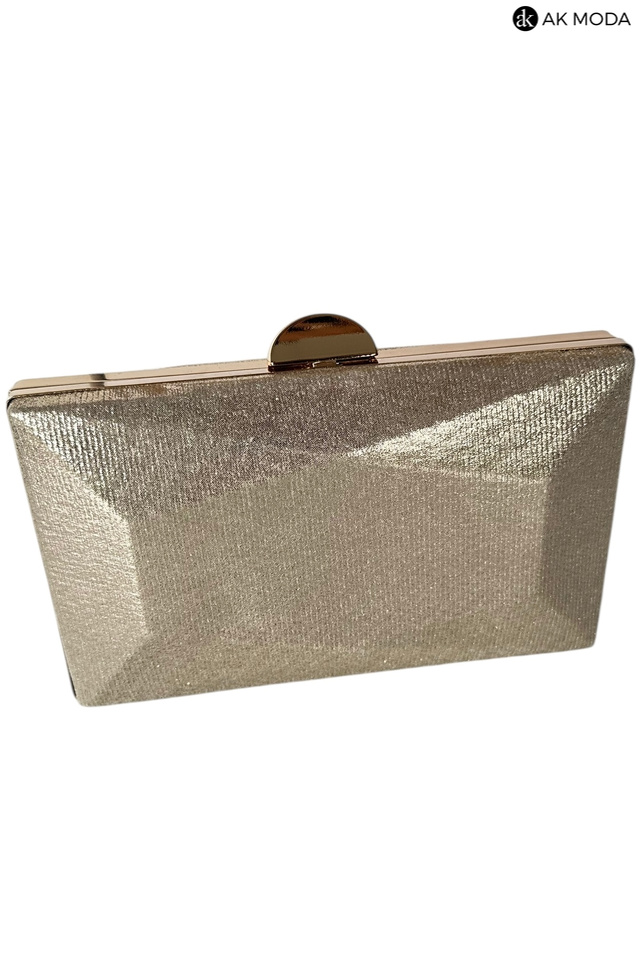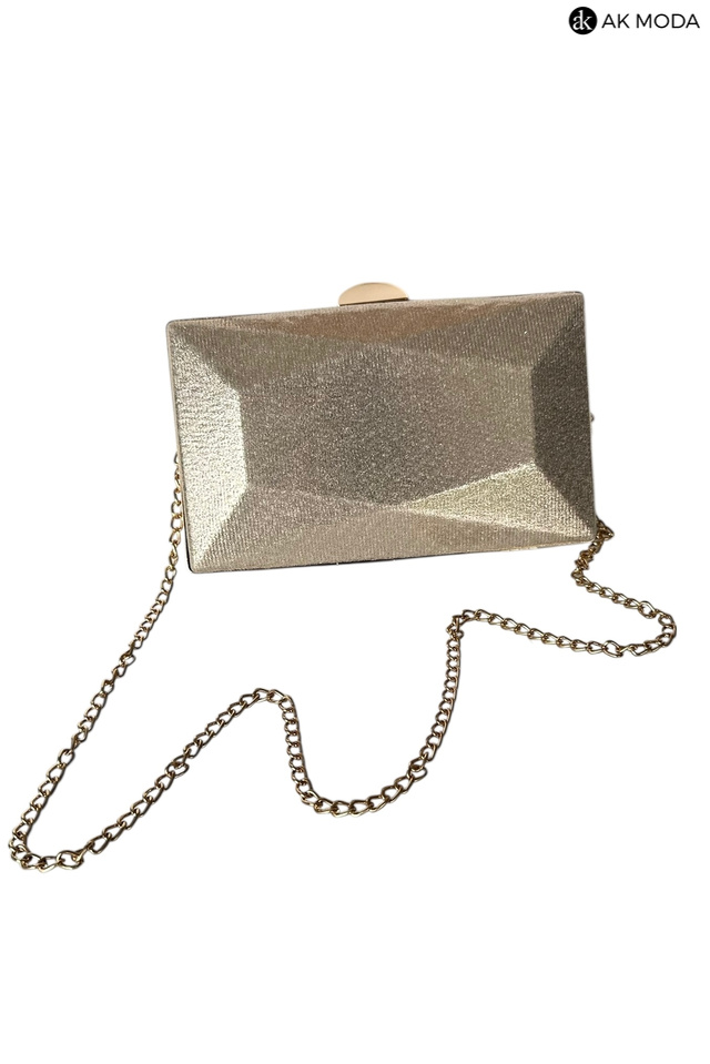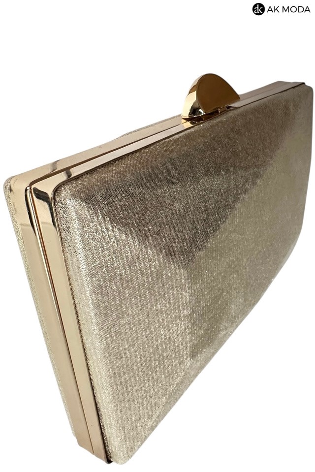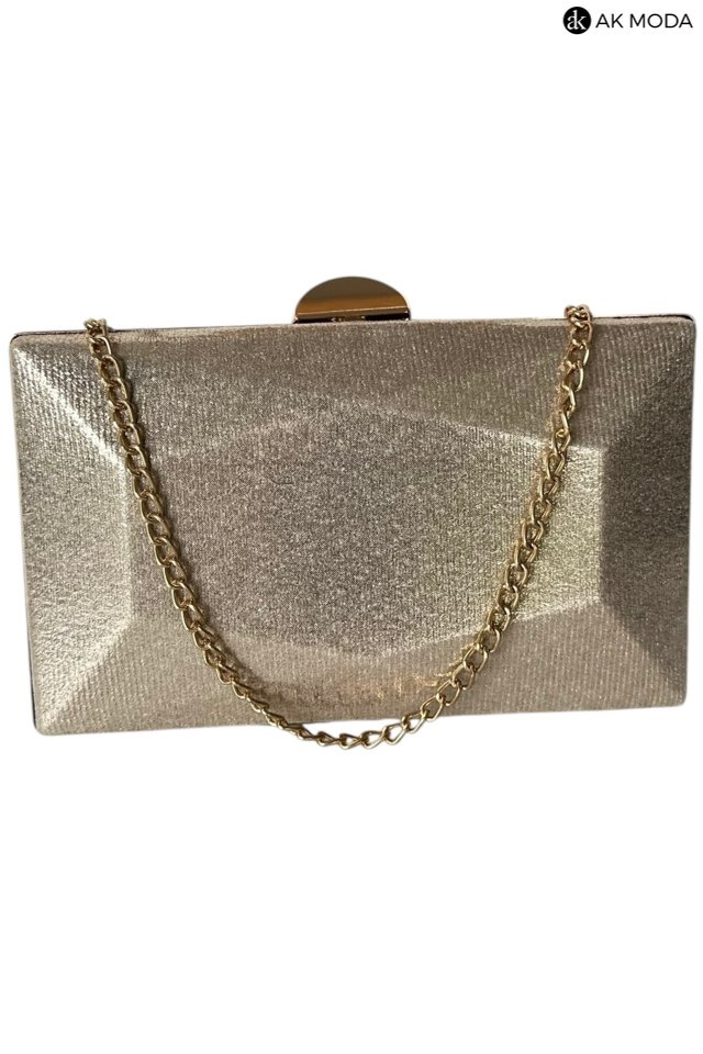 Elegancka torebka typu puzderko w kolorze złotym z zapięciem na zatrzask. Torebka posiada odpinany długi oraz krótki łańcuszek dzięki czemu można ją nosić zarówno w dłoni, jak i na ramieniu. Puzderko wykonane z błyszczącego, fakturowanego materiału.