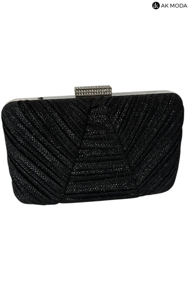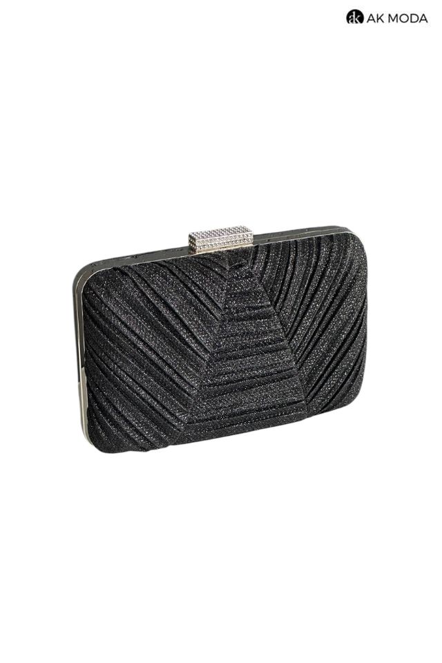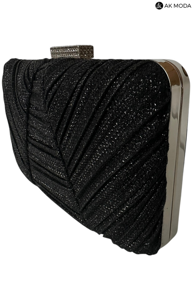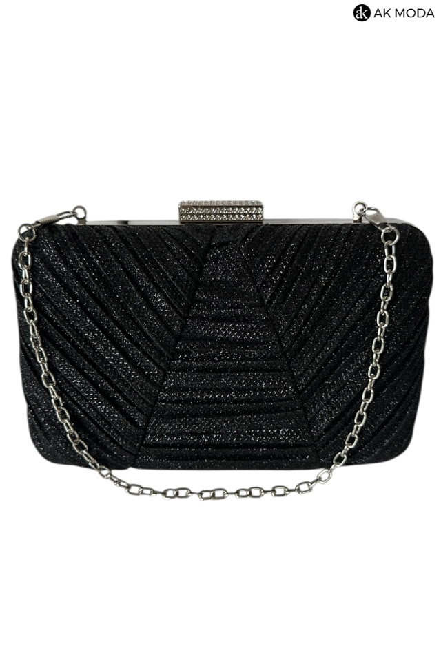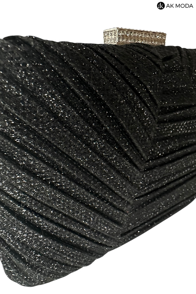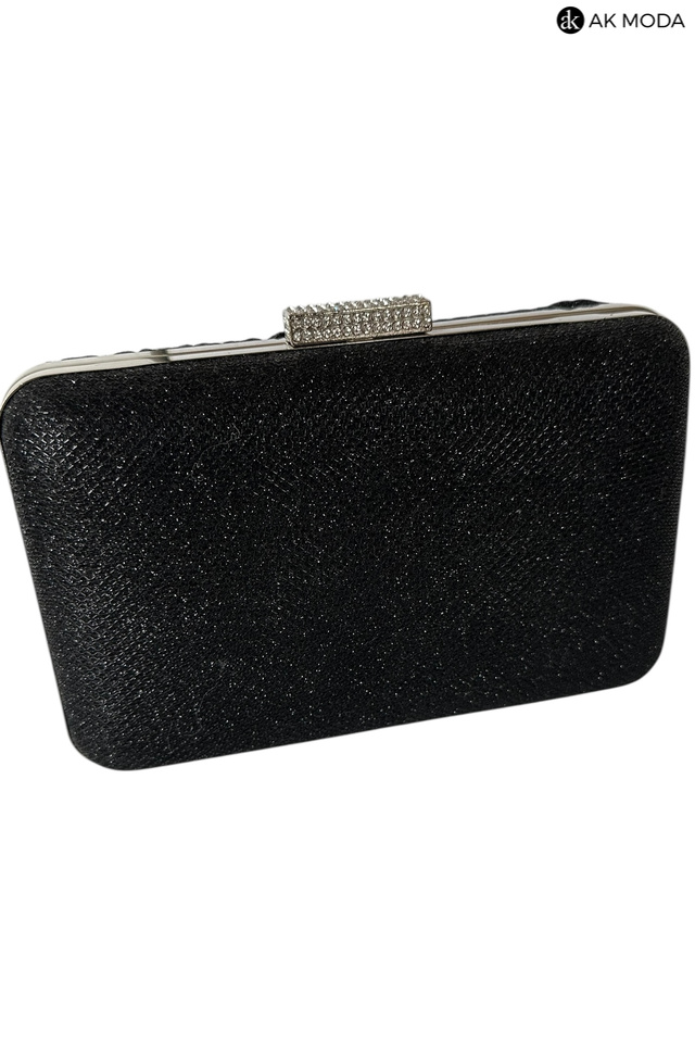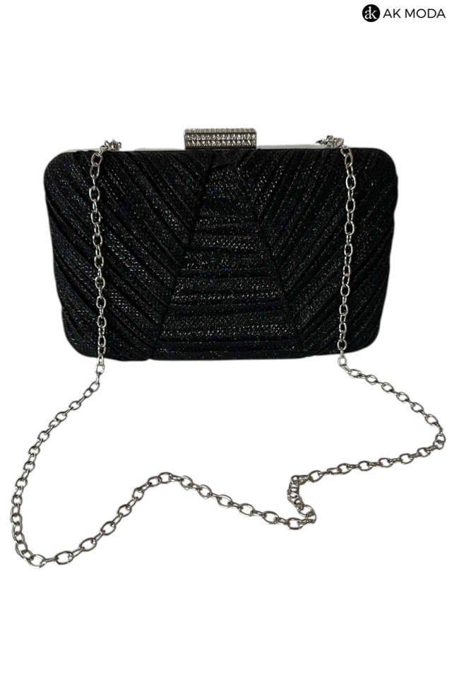 Elegancka torebka typu puzderko w kolorze czarnym, z zapięciem na zatrzask ozdobionym cyrkoniami. Torebka posiada odpinany długi i krótki łańcuszek, dzięki czemu można ją nosić zarówno w dłoni, jak i na ramieniu. Puzderko wykonane z błyszczącego, fakturowanego materiału.