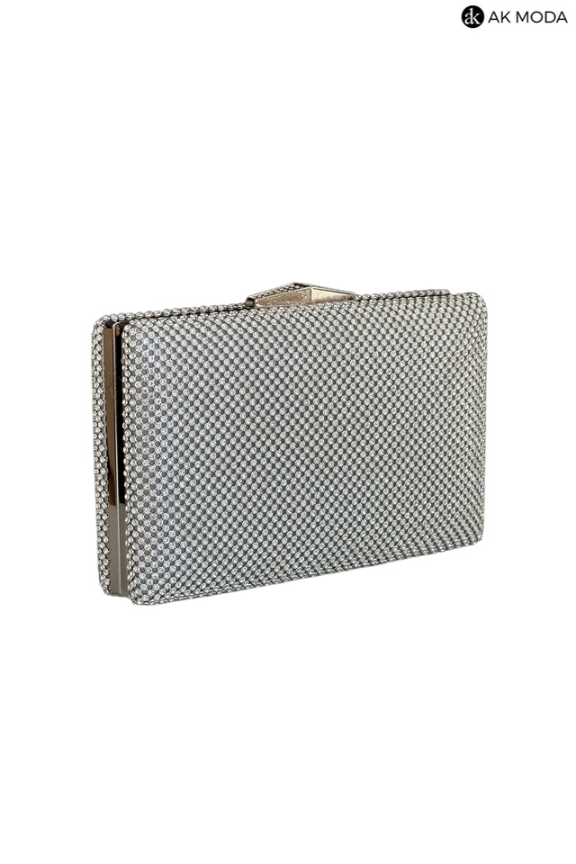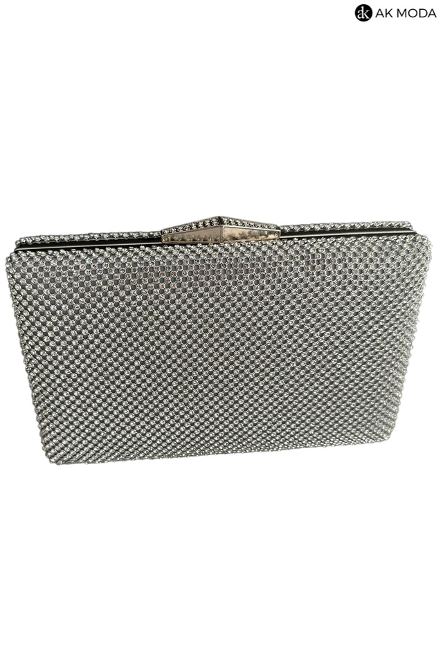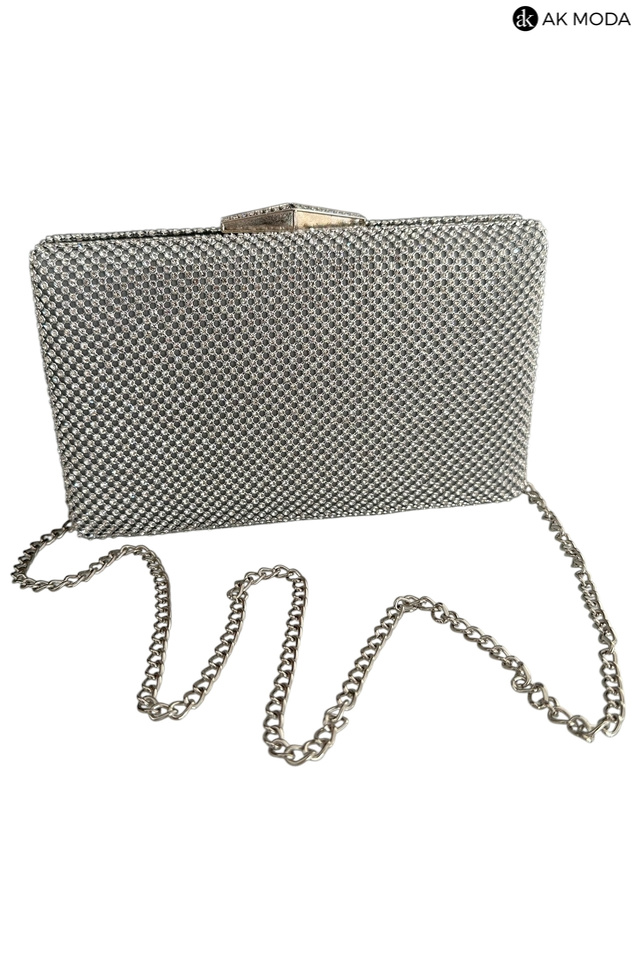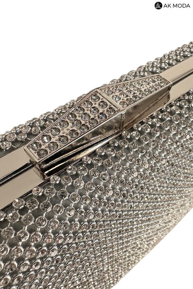Elegancka torebka typu puzderko w kolorze srebrnym z ozdobnym zapięciem na zatrzask. Torebka posiada odpinany długi i krótki łańcuszek, dzięki czemu można ją nosić zarówno w dłoni, jak i na ramieniu. Puzderko w całości wysadzane błyszczącymi cyrkoniami.