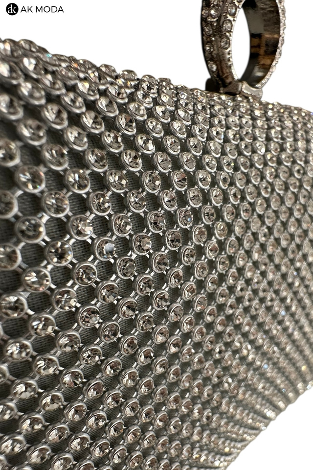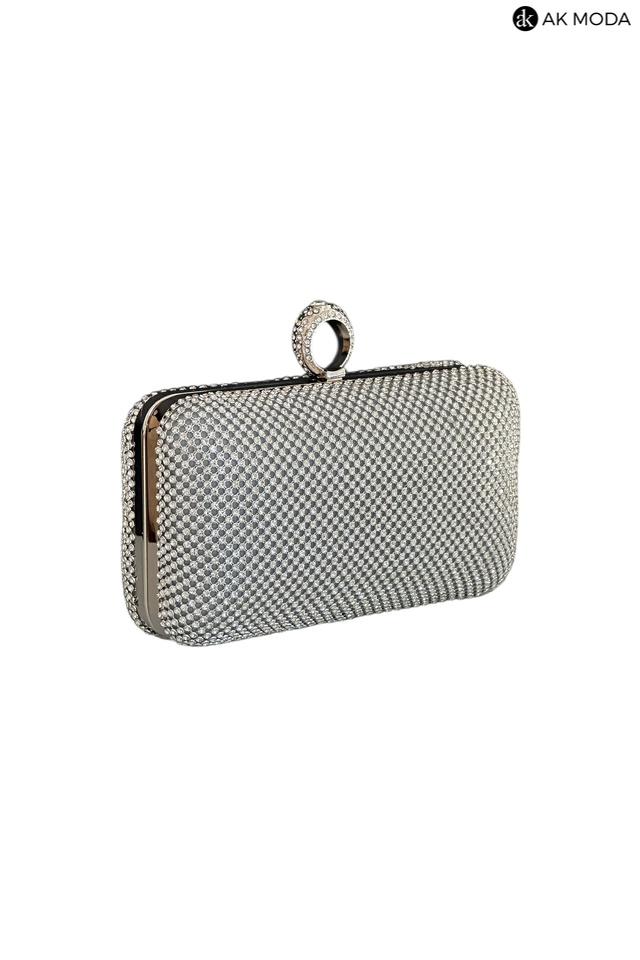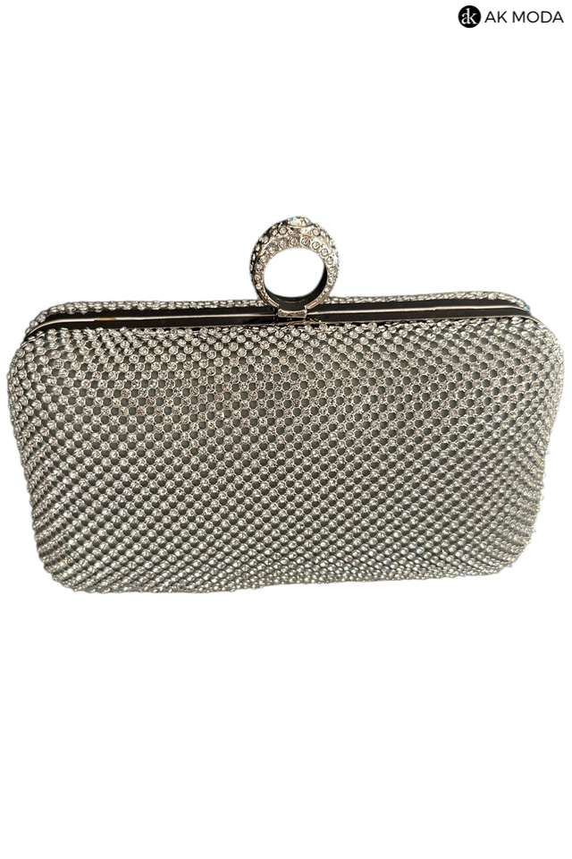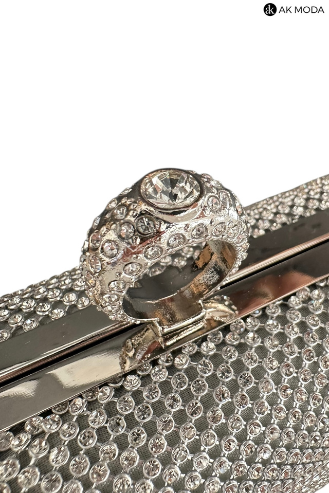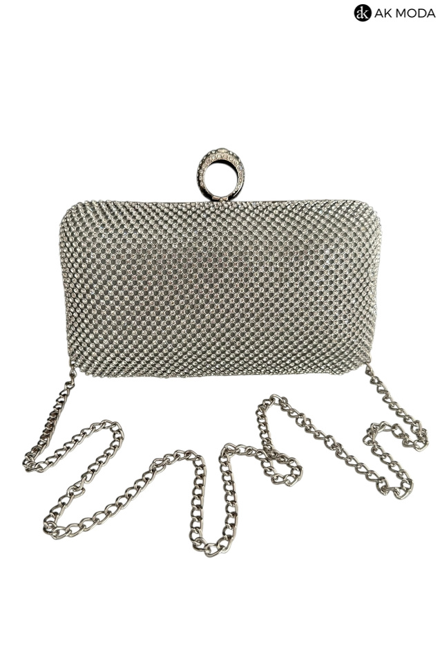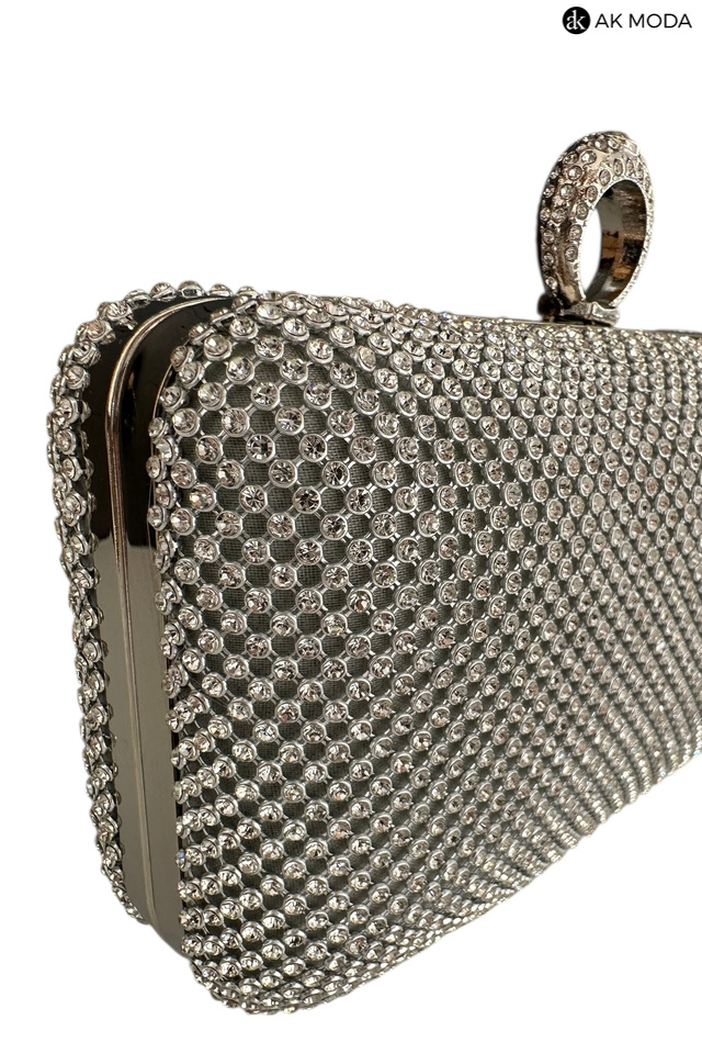 Elegancka torebka typu puzderko w kolorze srebrnym z ozdobnym zapięciem w kształcie pierścionka z błyszczącym kamykiem. Torebka posiada odpinany długi i krótki łańcuszek, dzięki czemu można ją nosić zarówno w dłoni, jak i na ramieniu. Puzderko w całości wysadzane cyrkoniami.