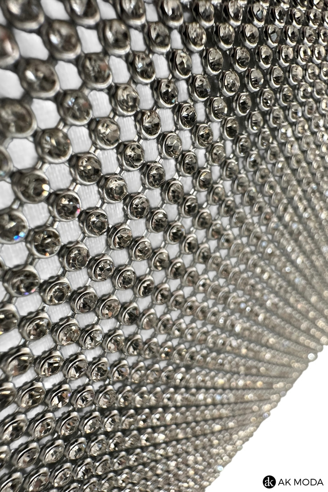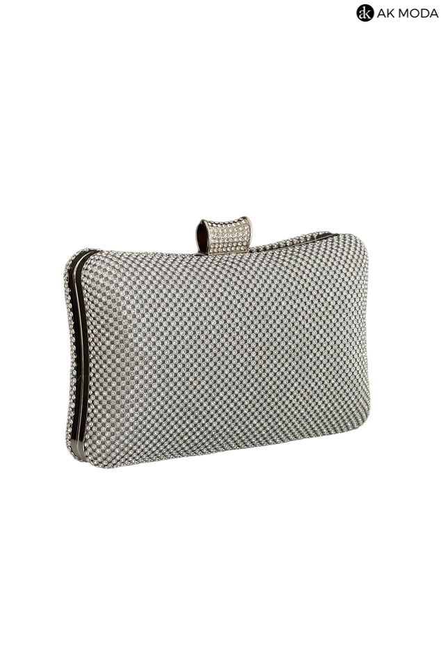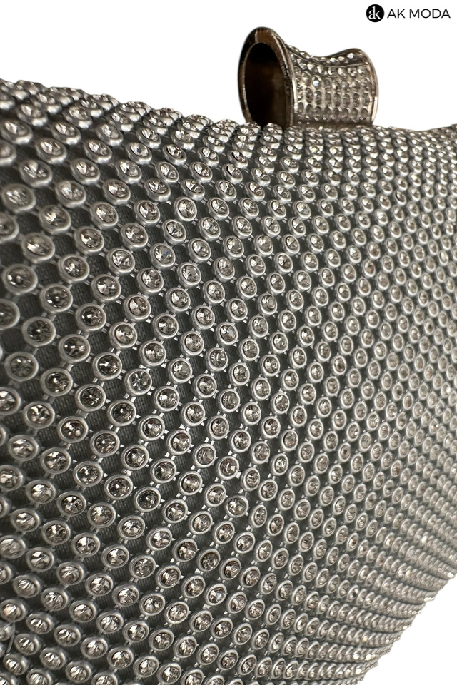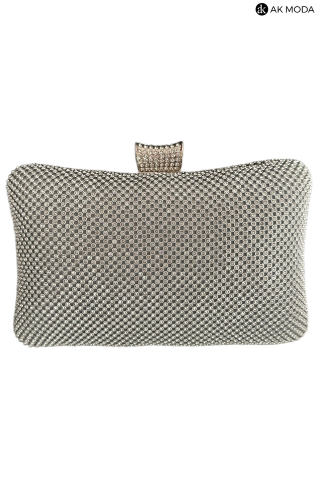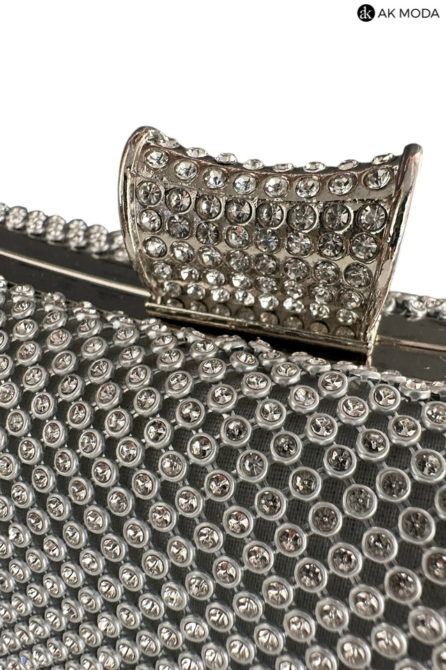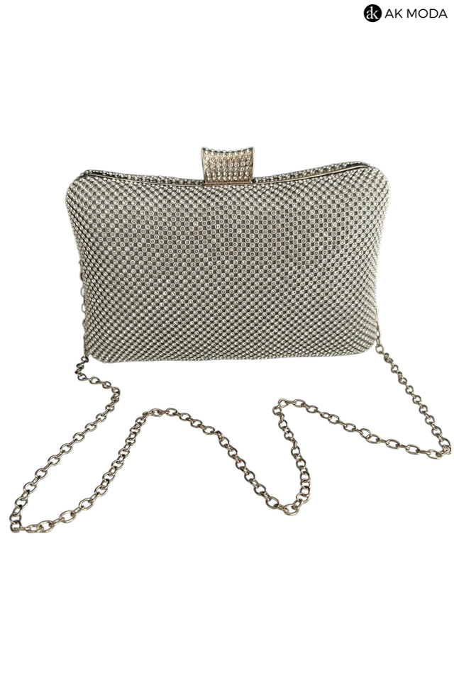 Elegancka torebka typu puzderko w kolorze srebrnym z ozdobnym zapięciem. Torebka posiada odpinany długi łańcuszek, oraz uchwyt, dzięki czemu można ją nosić zarówno w dłoni, jak i na ramieniu. Puzderko w całości wysadzane błyszczącymi cyrkoniami.