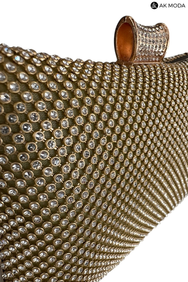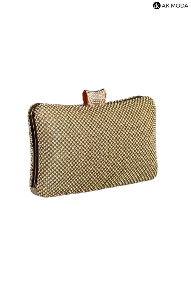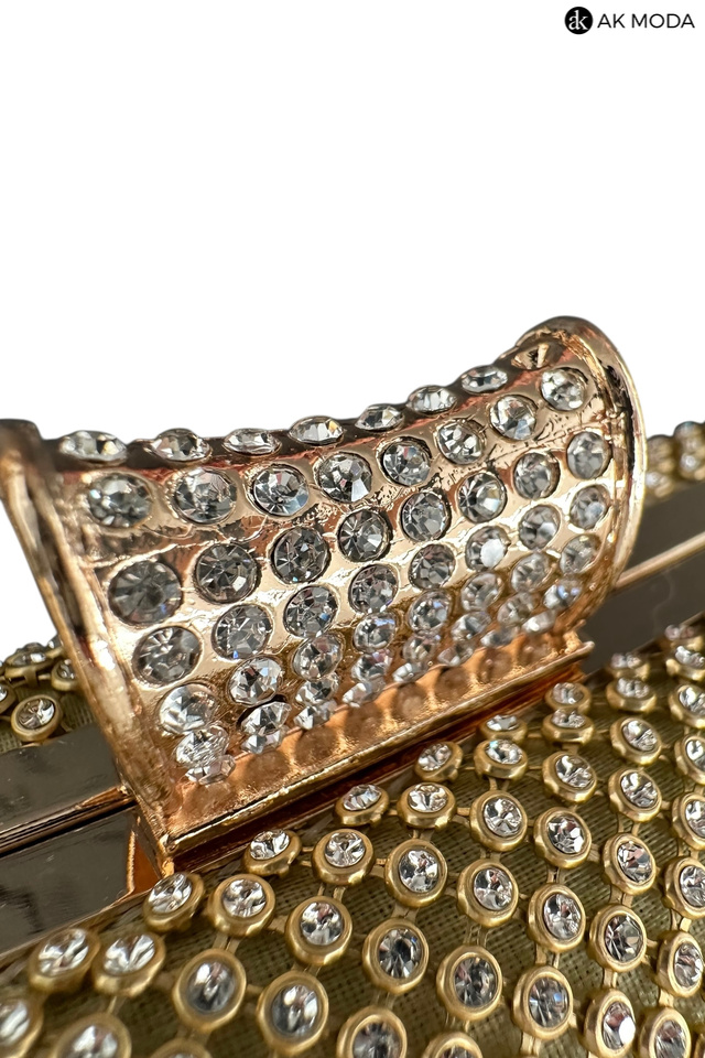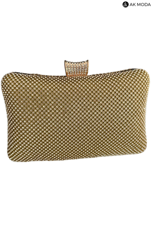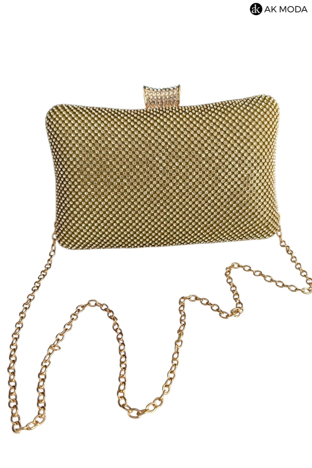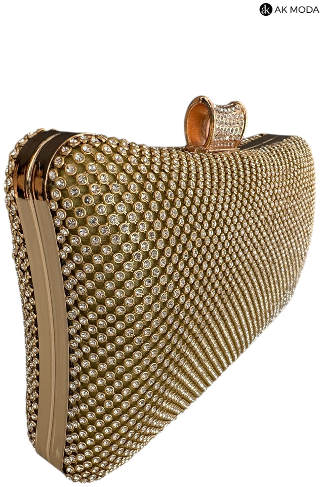 Elegancka torebka typu puzderko w kolorze złotym z ozdobnym zapięciem. Torebka posiada odpinany długi łańcuszek, oraz uchwyt, dzięki czemu można ją nosić zarówno w dłoni, jak i na ramieniu. Puzderko w całości wysadzane błyszczącymi cyrkoniami.