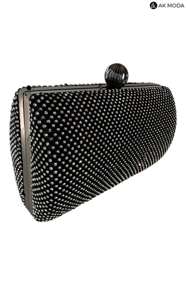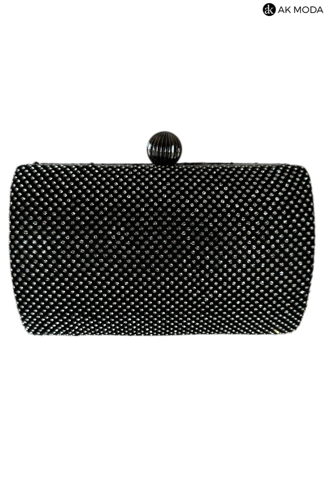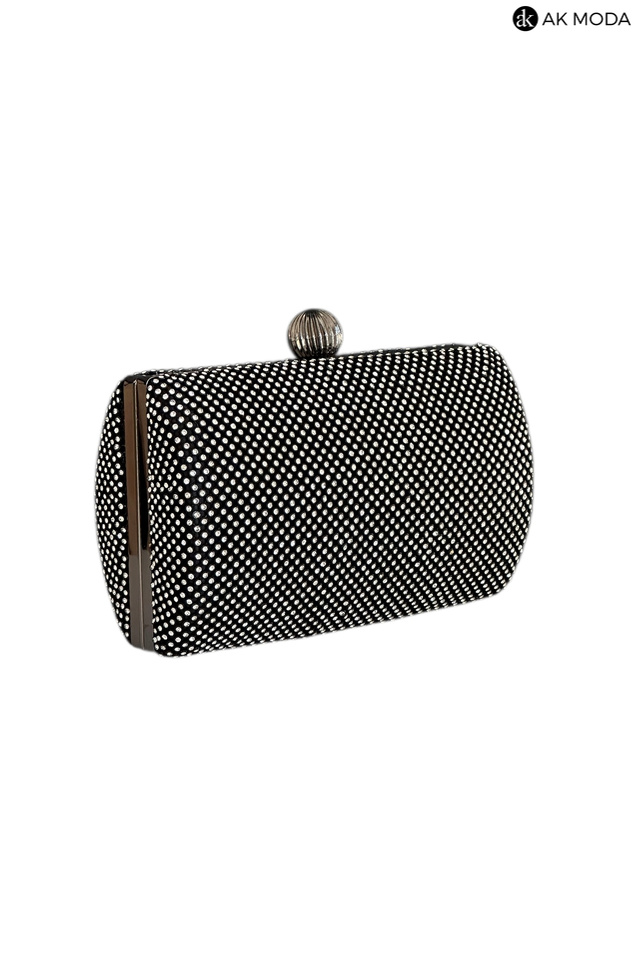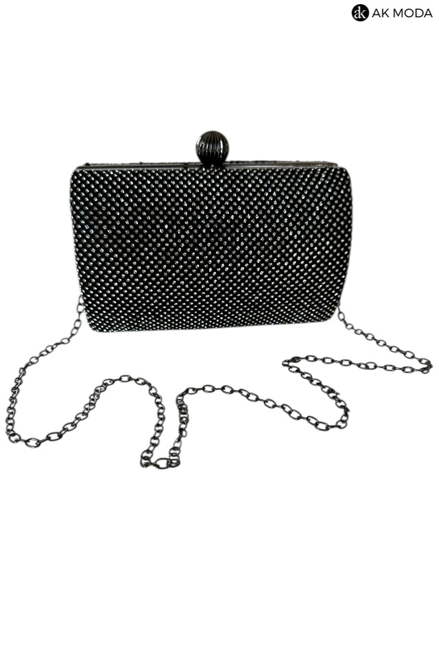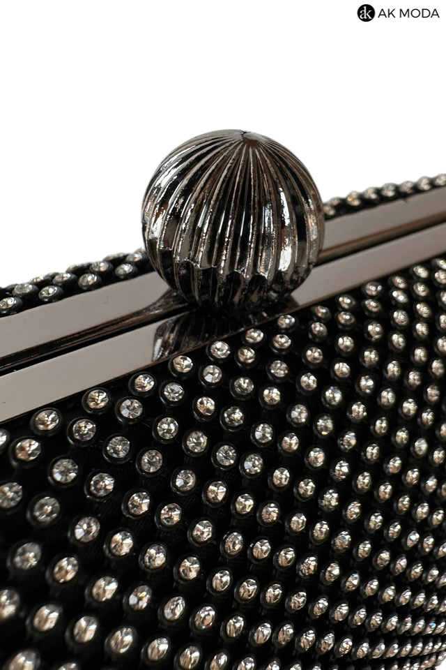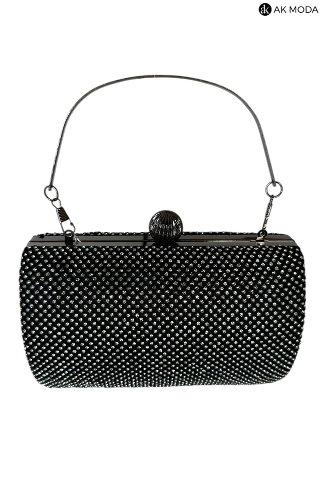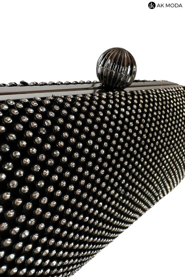 Elegancka torebka typu puzderko w kolorze czarnym z ozdobnym zapięciem na zatrzask. Torebka posiada odpinany długi łańcuszek oraz uchwyt, dzięki czemu można ją nosić zarówno w dłoni, jak i na ramieniu. Puzderko w całości wysadzane błyszczącymi cyrkoniami.