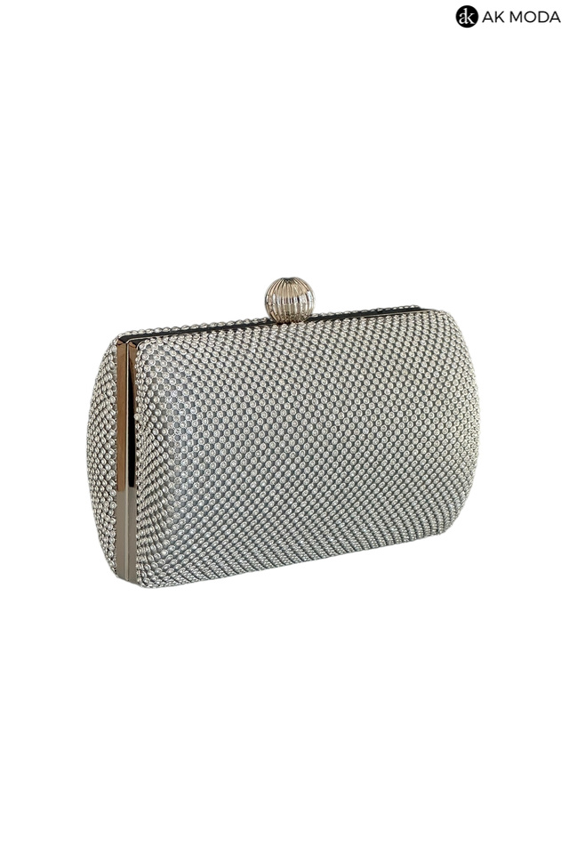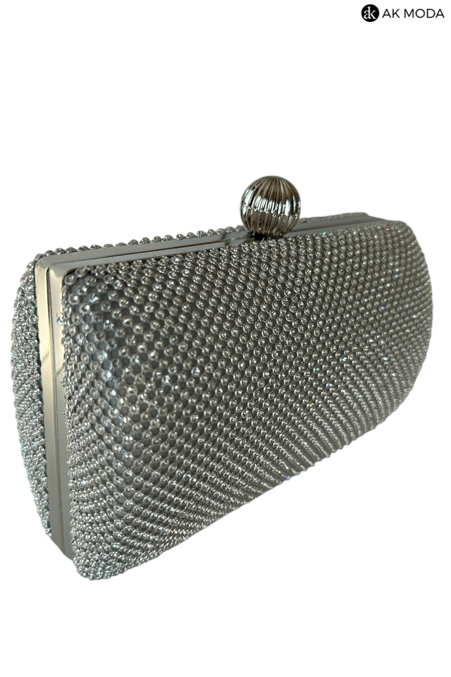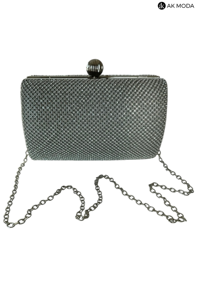Elegancka torebka typu puzderko w kolorze srebrnym z ozdobnym zapięciem na zatrzask. Torebka posiada odpinany długi łańcuszek oraz uchwyt, dzięki czemu można ją nosić zarówno w dłoni, jak i na ramieniu. Puzderko w całości wysadzane błyszczącymi cyrkoniami.