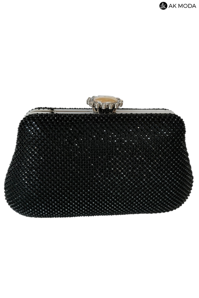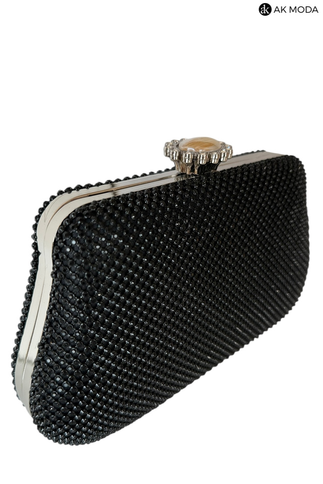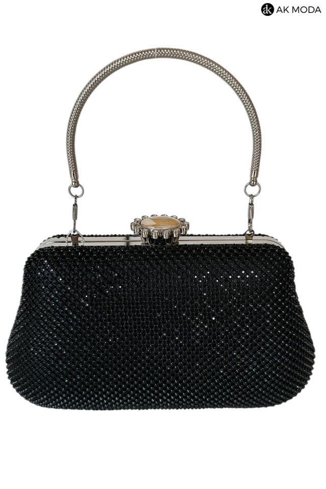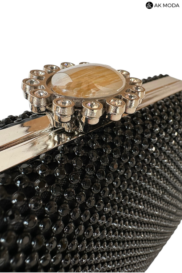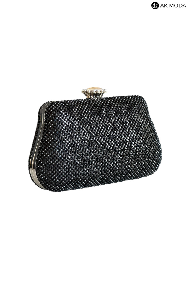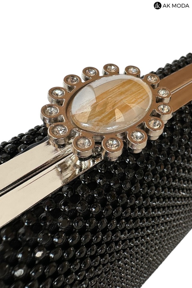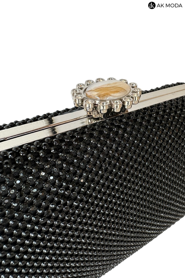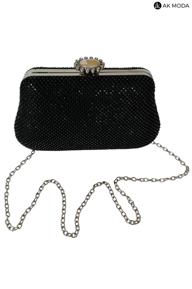 Elegancka torebka typu puzderko w kolorze czarnym, z ozdobnym zapięciem na zatrzask. Torebka posiada odpinany długi łańcuszek oraz ozdobny uchwyt, dzięki czemu można ją nosić zarówno w dłoni, jak i na ramieniu. Puzderko w całości wysadzane błyszczącymi cyrkoniami.