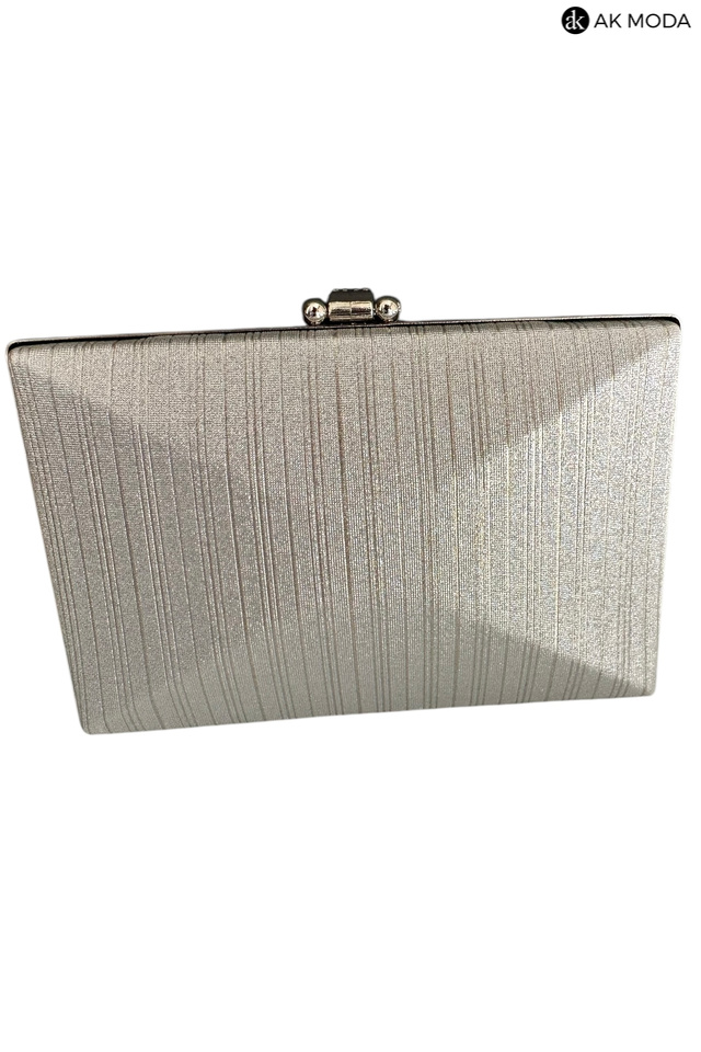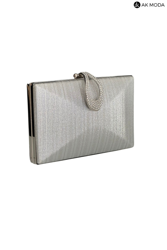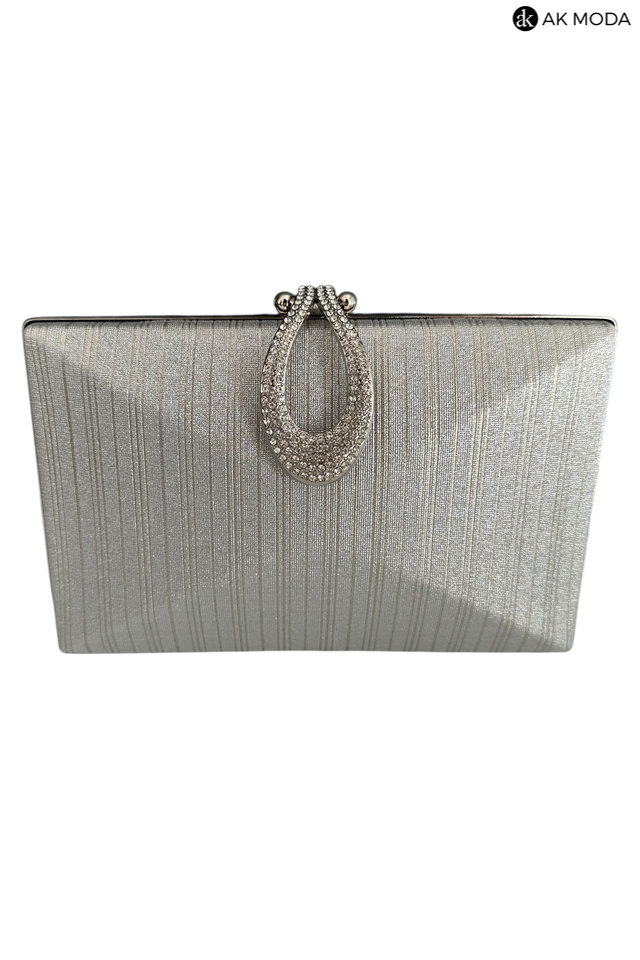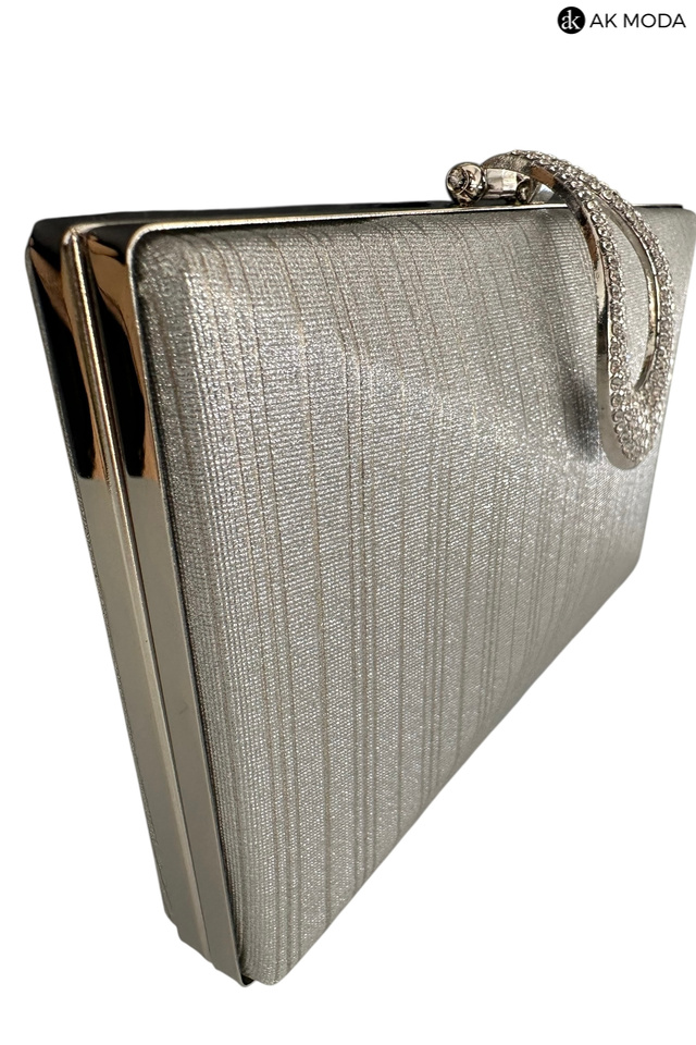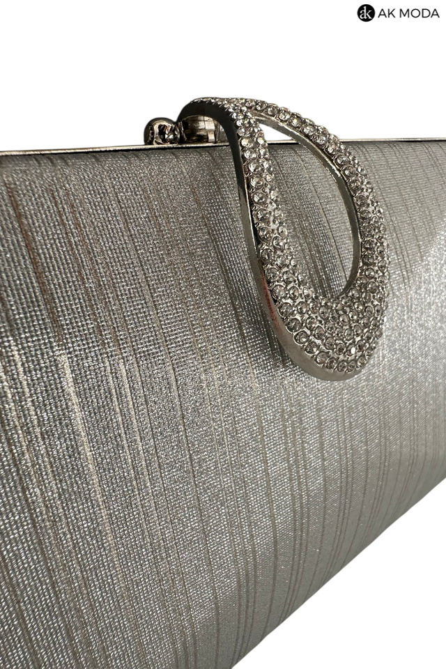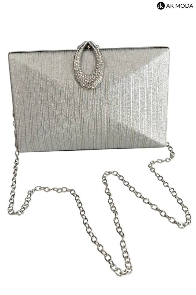 Elegancka torebka typu puzderko w kolorze srebrnym, z ozdobnym zapięciem w kształcie łezki wysadzanej cyrkoniami. Torebka posiada odpinany długi łańcuszek oraz uchwyt, dzięki czemu można ją nosić zarówno w dłoni, jak i na ramieniu. Puzderko wykonane z błyszczącego, fakturowanego materiału.