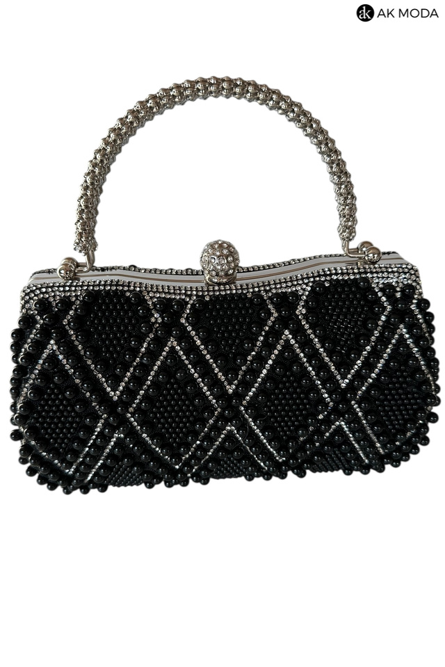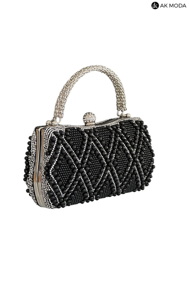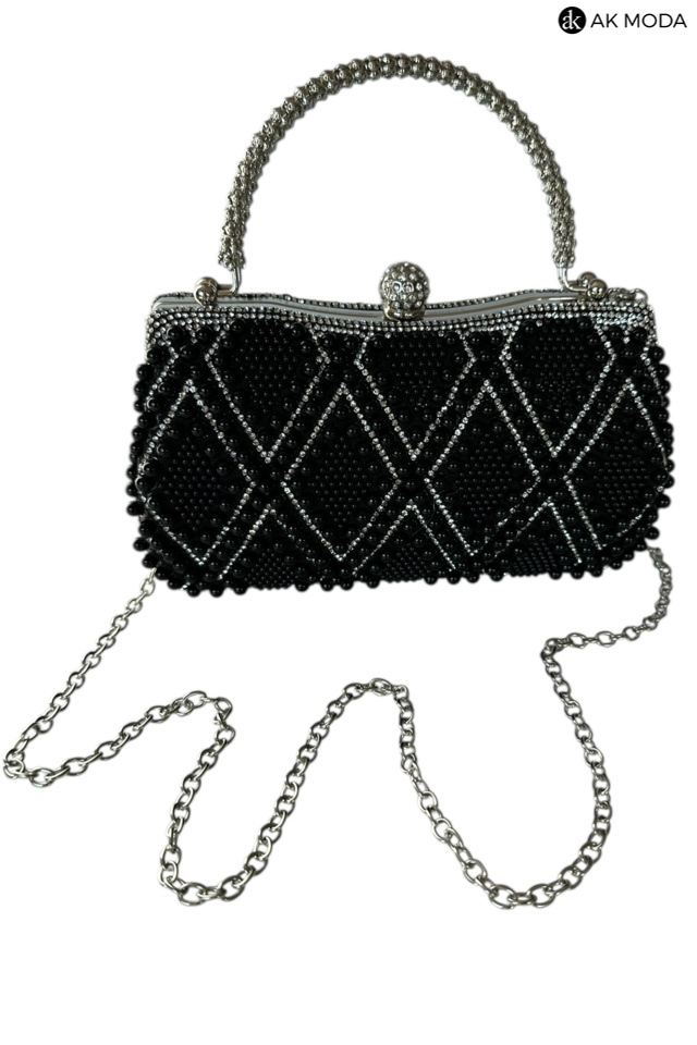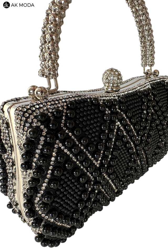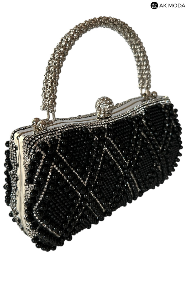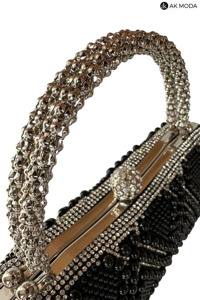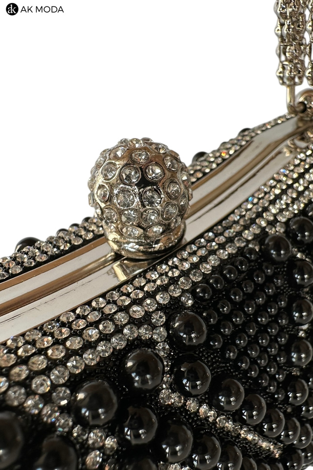 Elegancka torebka typu puzderko w kolorze czarnym, z zapięciem na zatrzask i ozdobnymi uchwytami. Torebka posiada odpinany długi łańcuszek, dzięki czemu można ją nosić zarówno w dłoni, jak i na ramieniu. Puzderko w całości wysadzane perełkami i cyrkoniami.