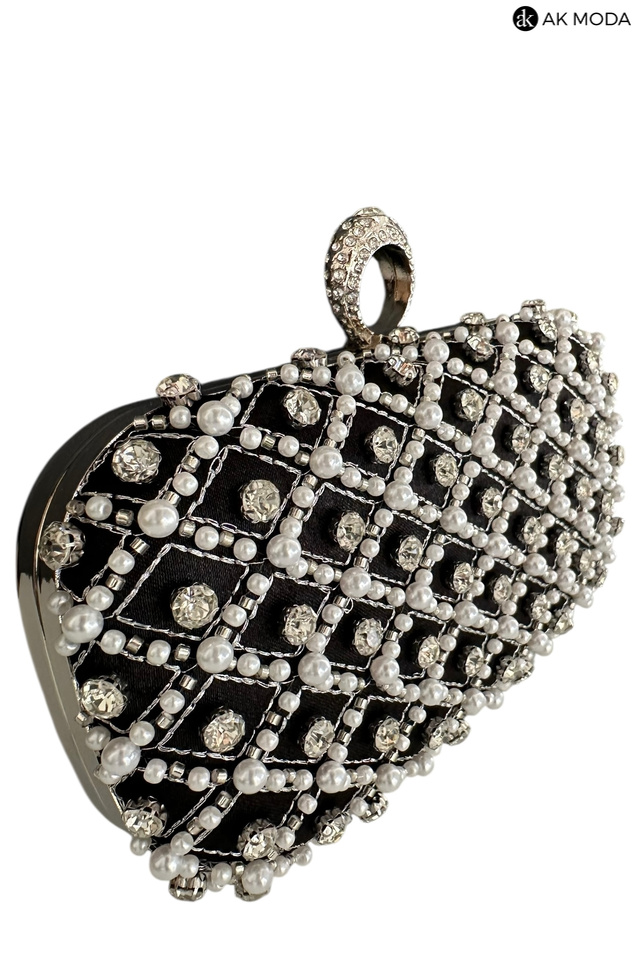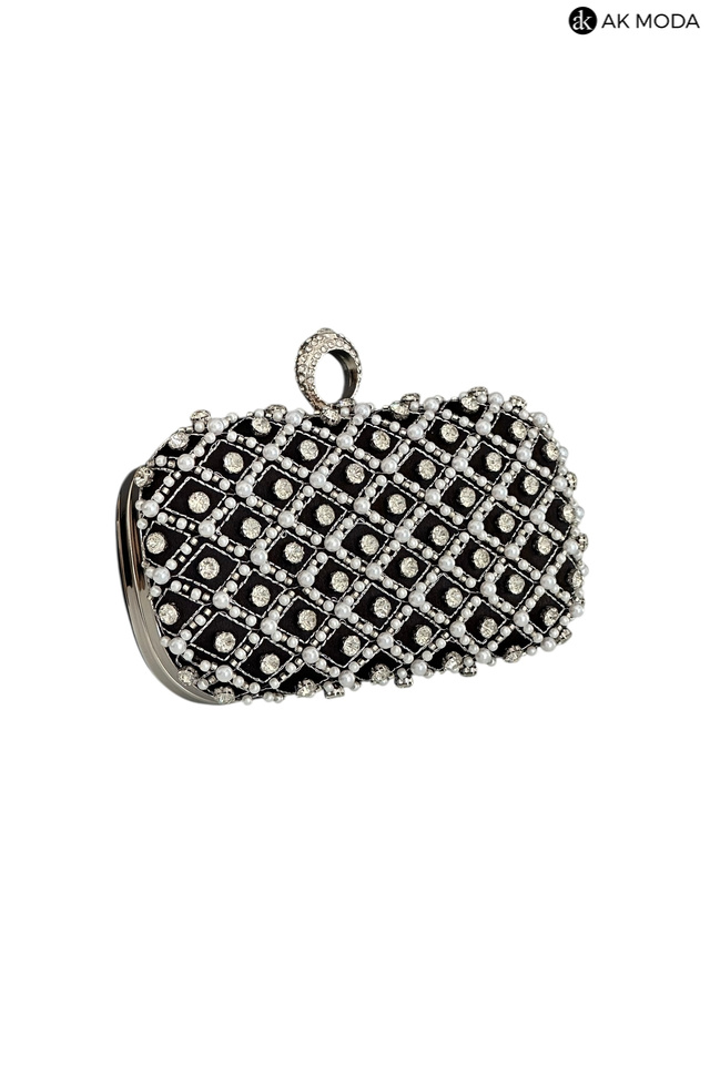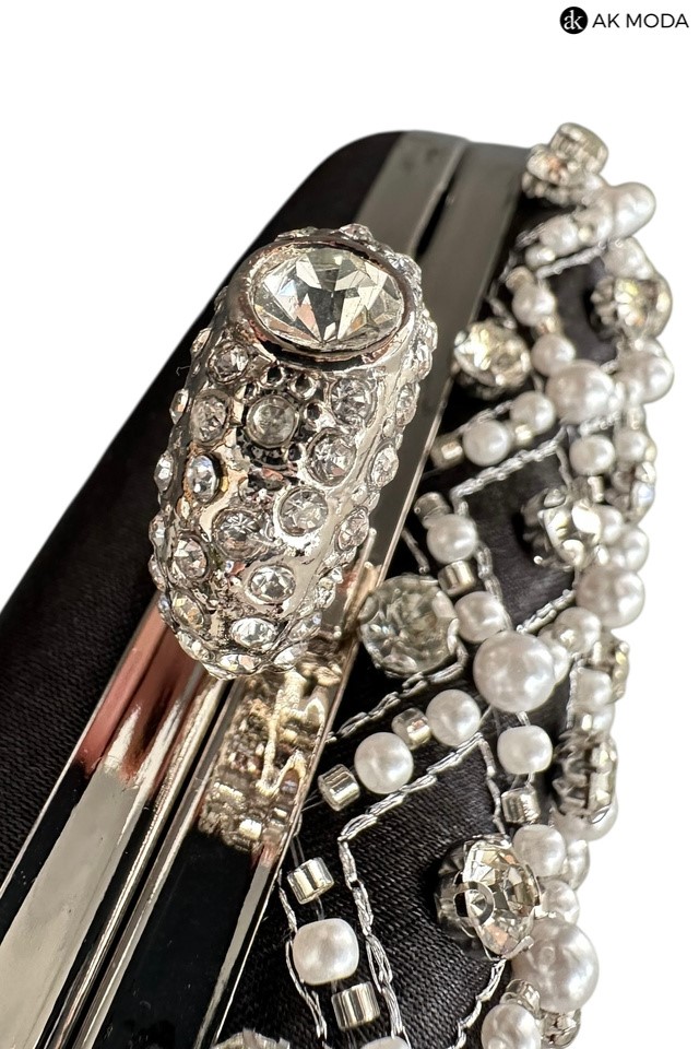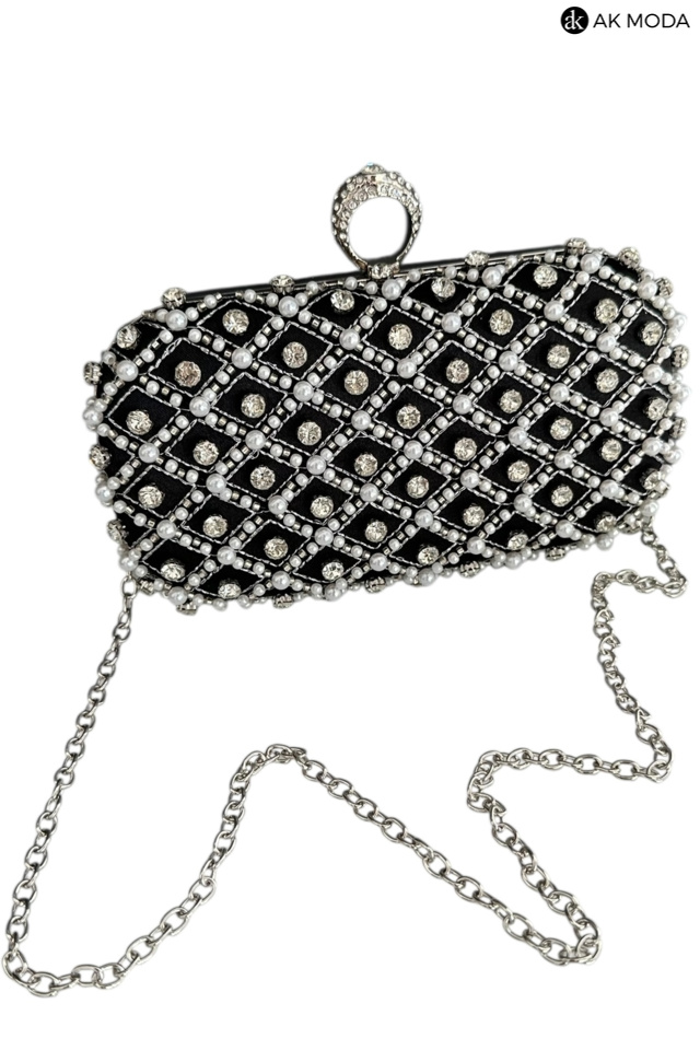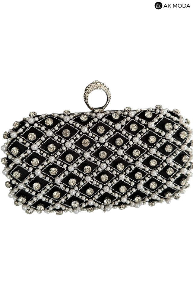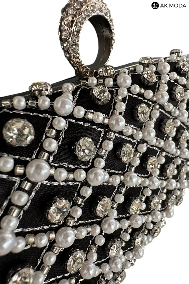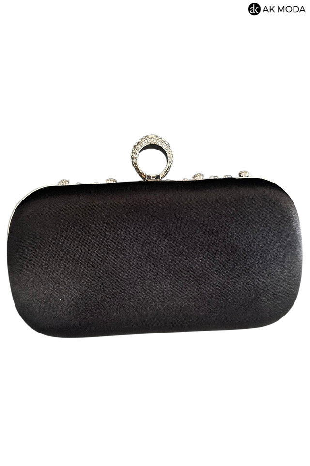 Elegancka torebka typu puzderko w kolorze czarnym, z ozdobnym zapięciem w kształcie pierścionka z błyszczącym kamykiem. Torebka posiada odpinany długi oraz krótki łańcuszek, dzięki czemu można ją nosić zarówno w dłoni, jak i na ramieniu. Puzderko z przodu ozdobione perełkami i cyrkoniami.