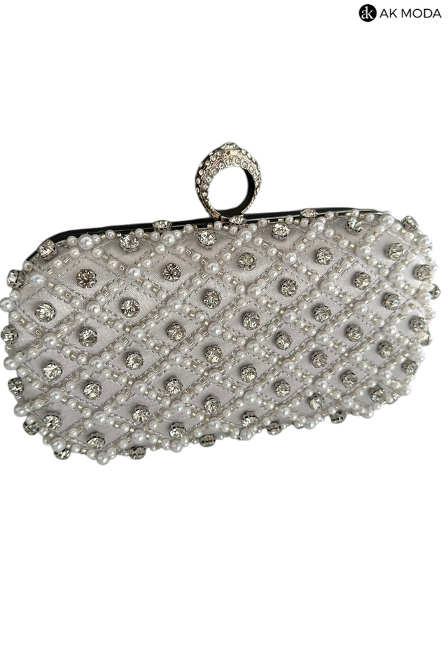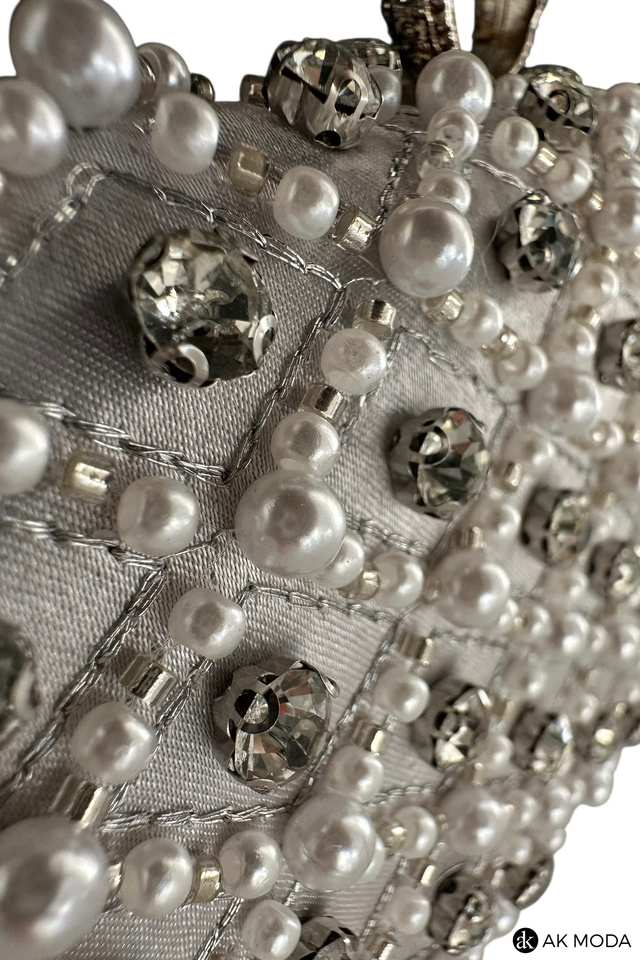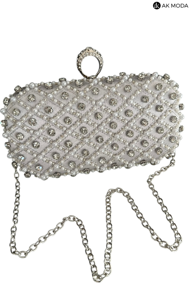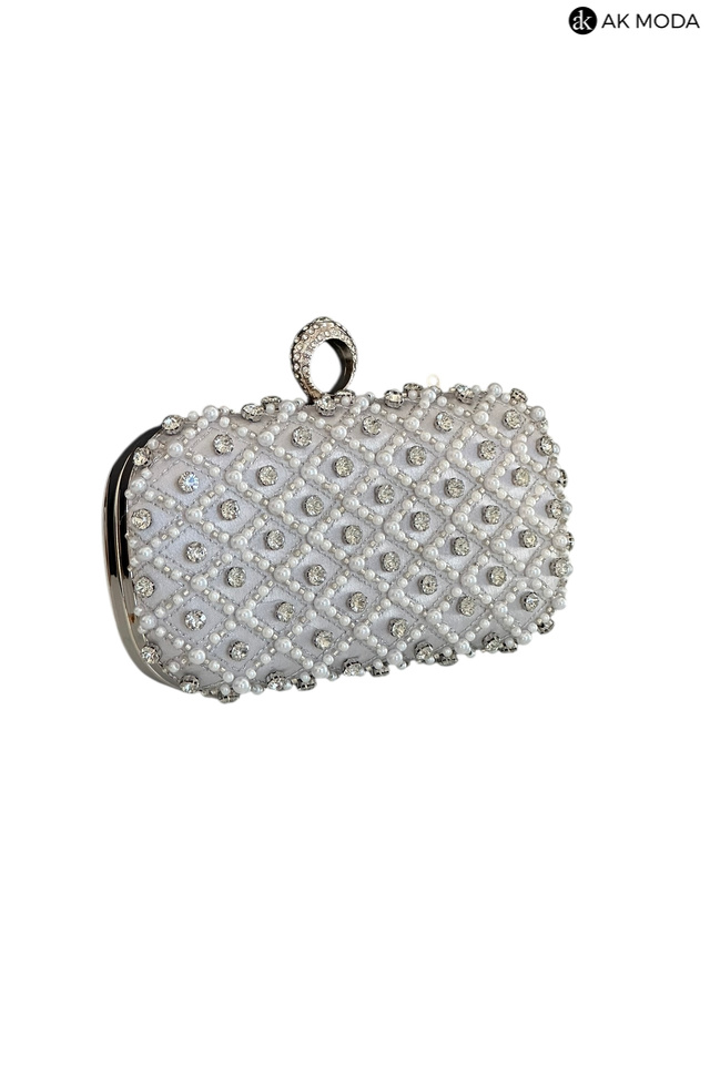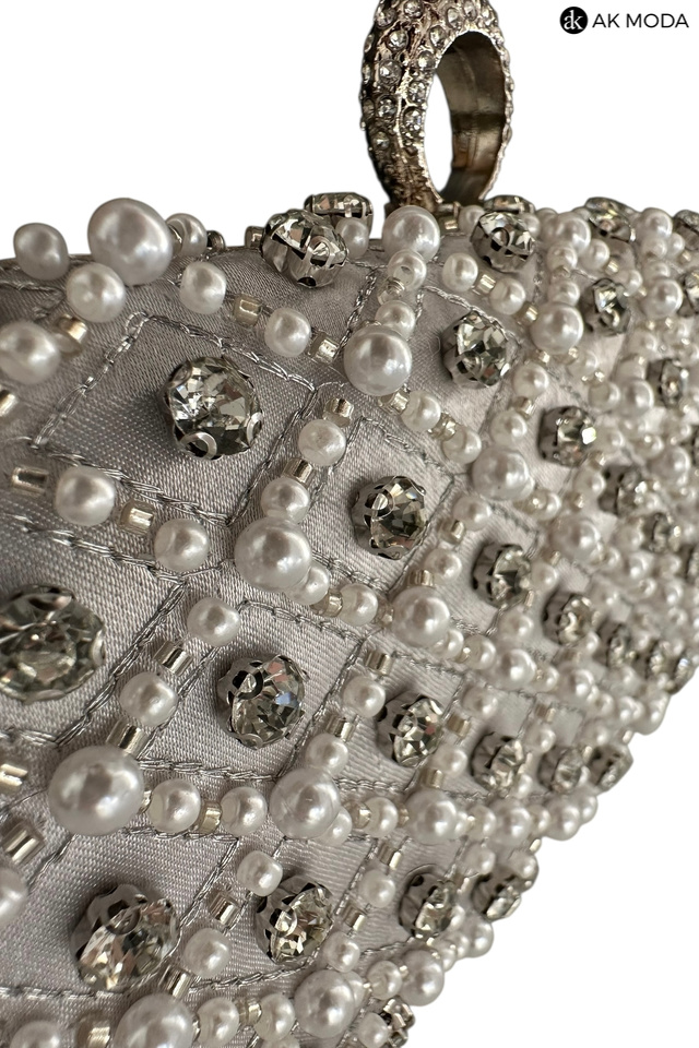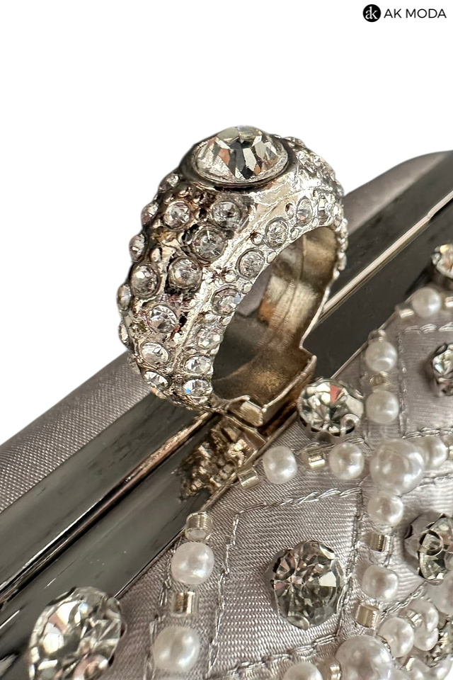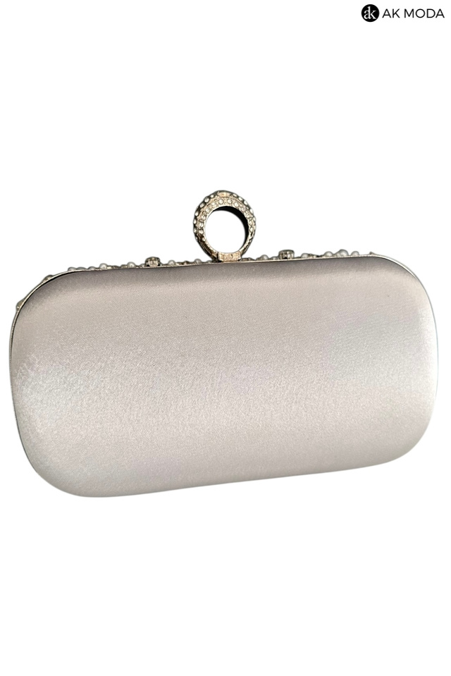 Elegancka torebka typu puzderko w kolorze srebrnym, z ozdobnym zapięciem w kształcie pierścionka z błyszczącym kamykiem. Torebka posiada odpinany długi oraz krótki łańcuszek, dzięki czemu można ją nosić zarówno w dłoni, jak i na ramieniu. Puzderko z przodu ozdobione perełkami i cyrkoniami.