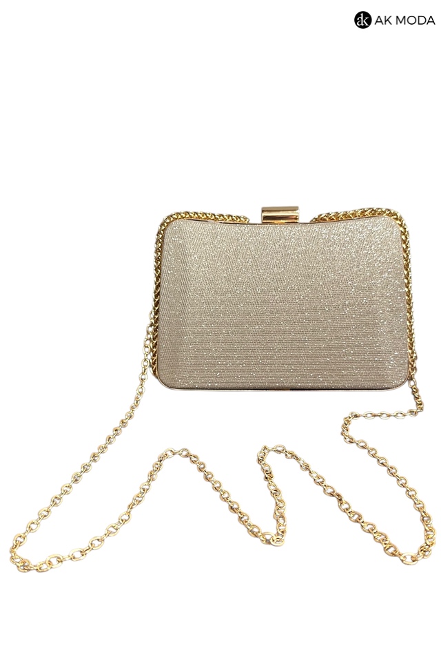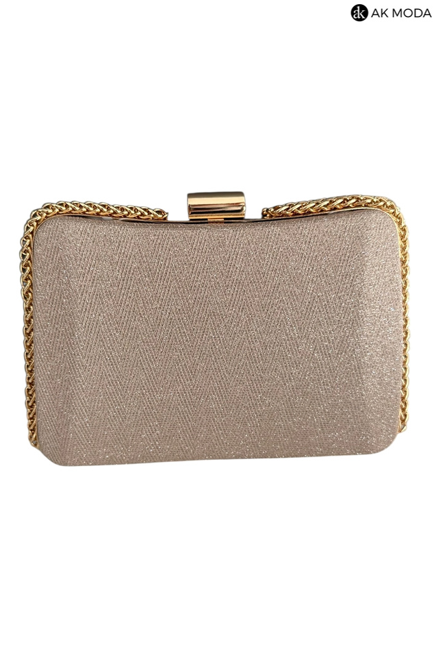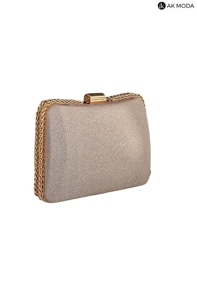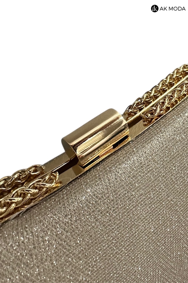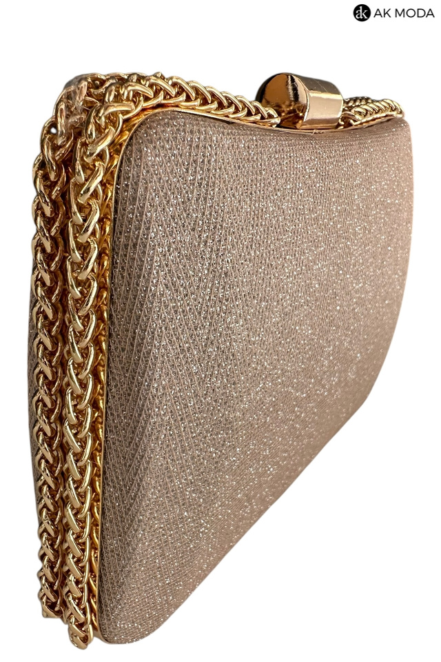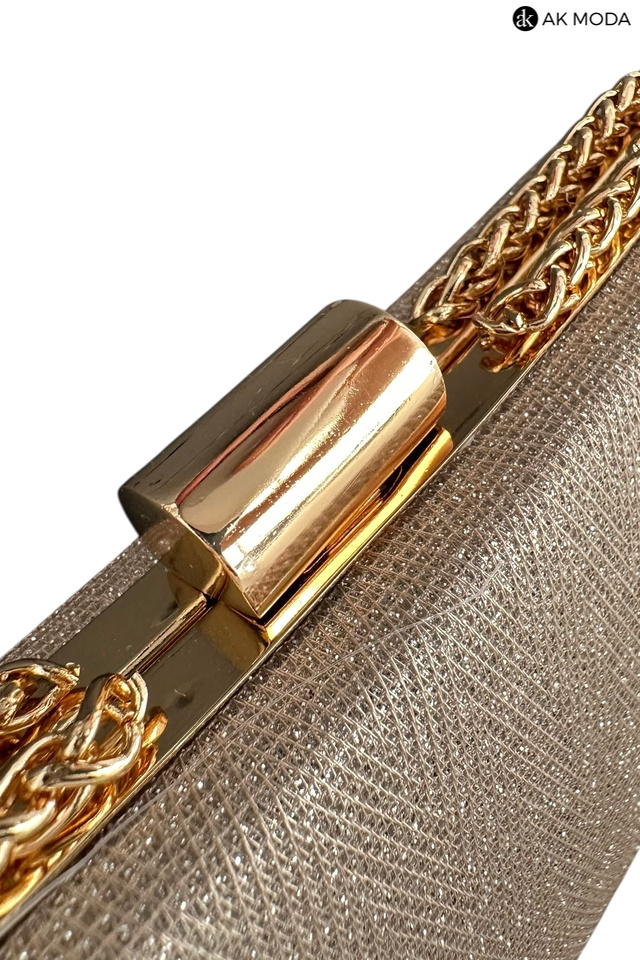 Elegancka torebka typu puzderko w kolorze złotym z zapięciem na zatrzask. Torebka posiada odpinany długi oraz krótki łańcuszek dzięki czemu można ją nosić zarówno w dłoni, jak i na ramieniu. Puzderko wykonane z brokatowego, fakturowanego materiału.