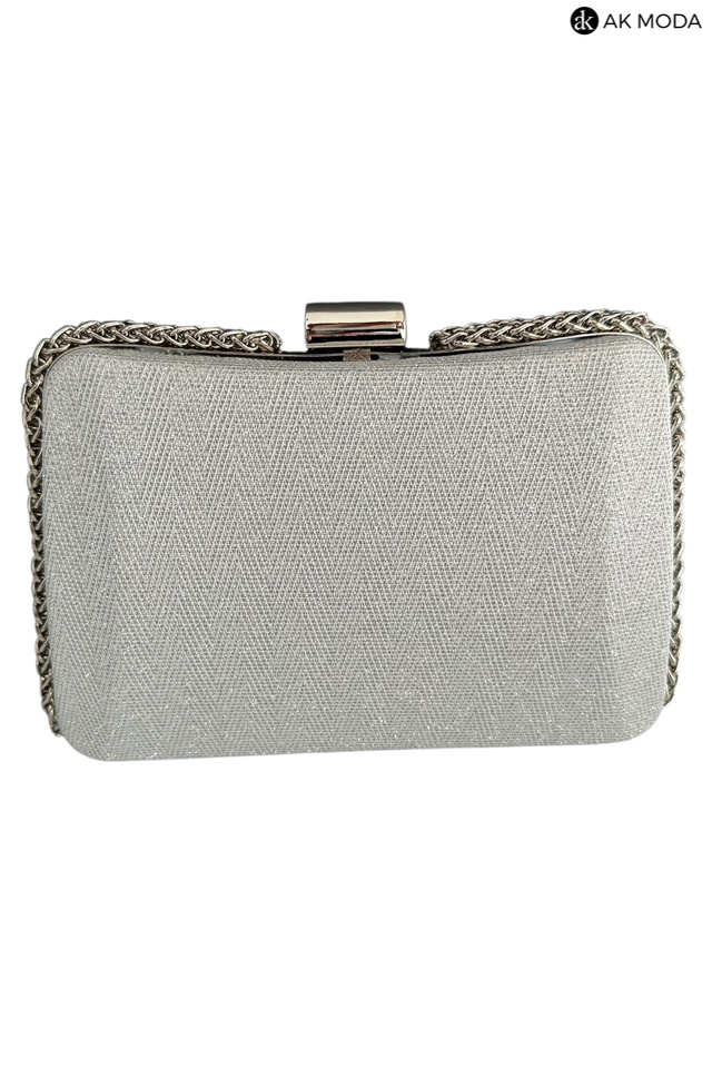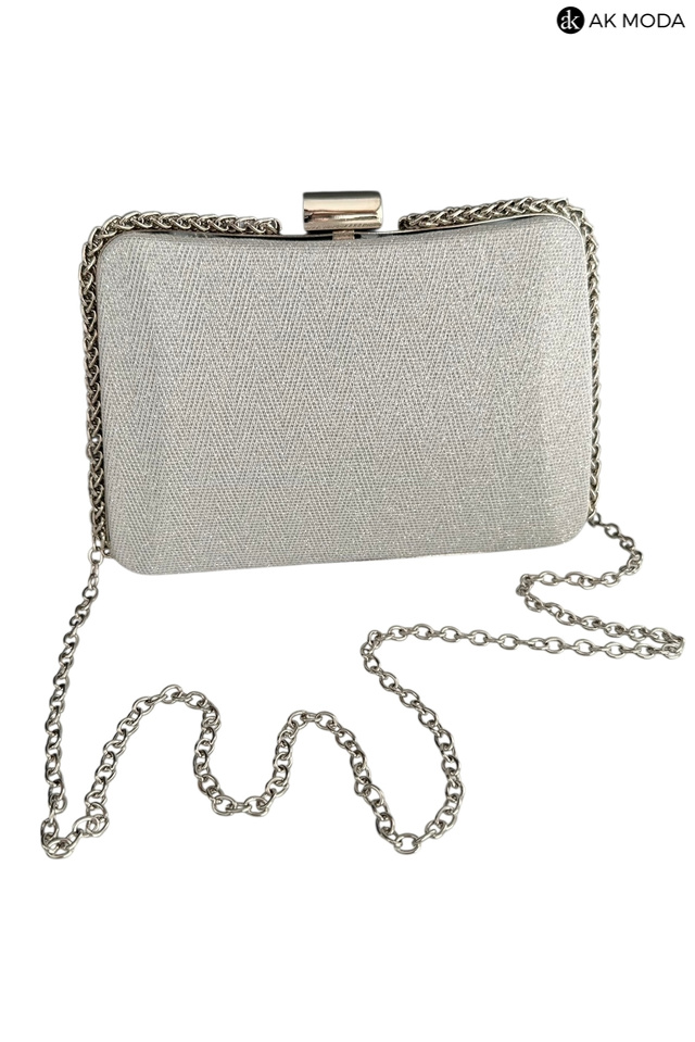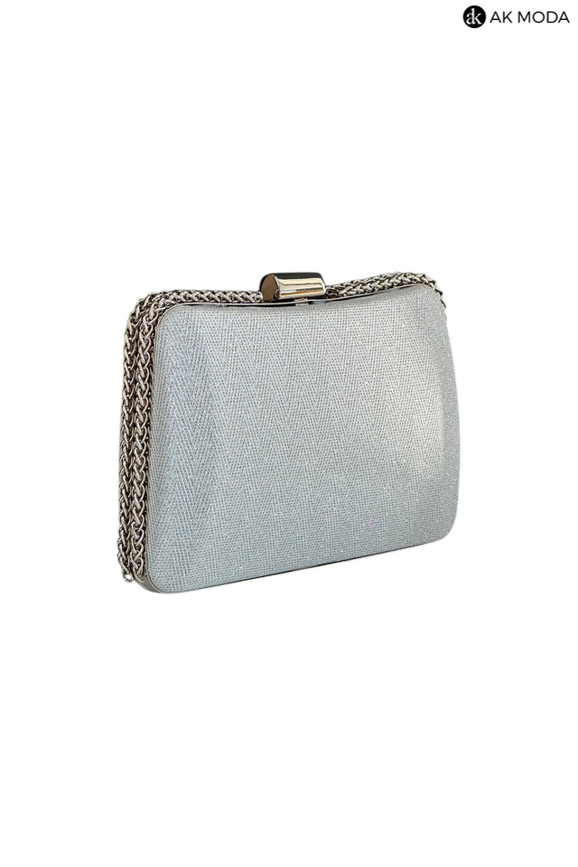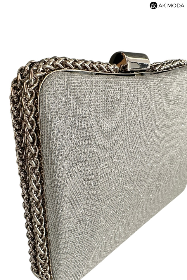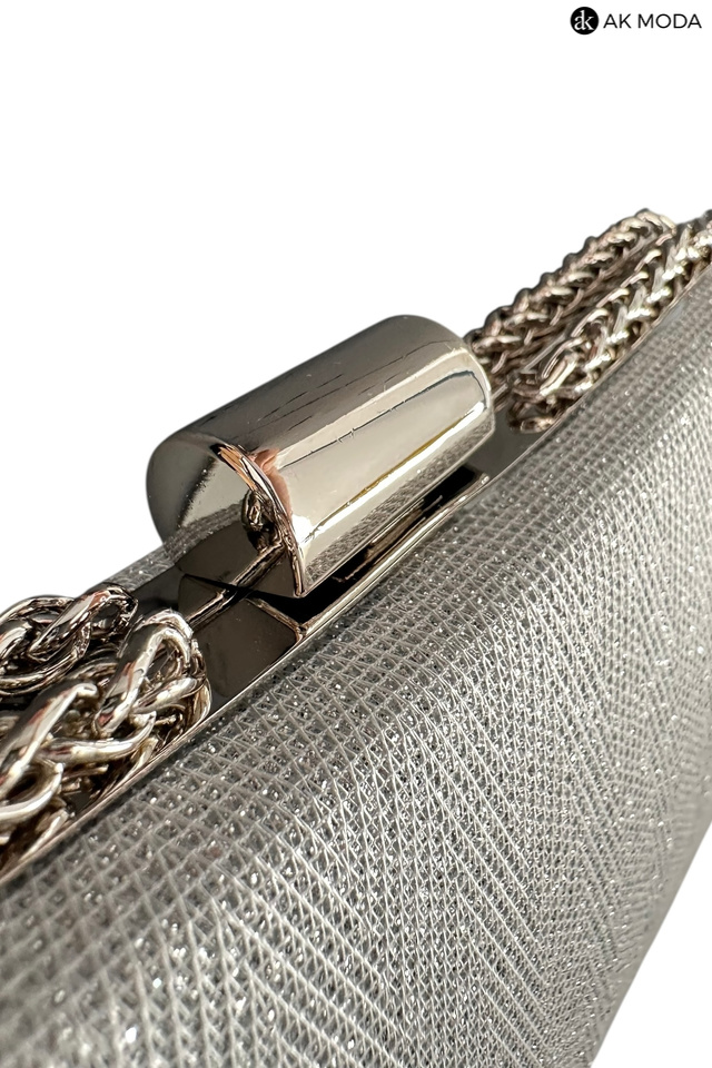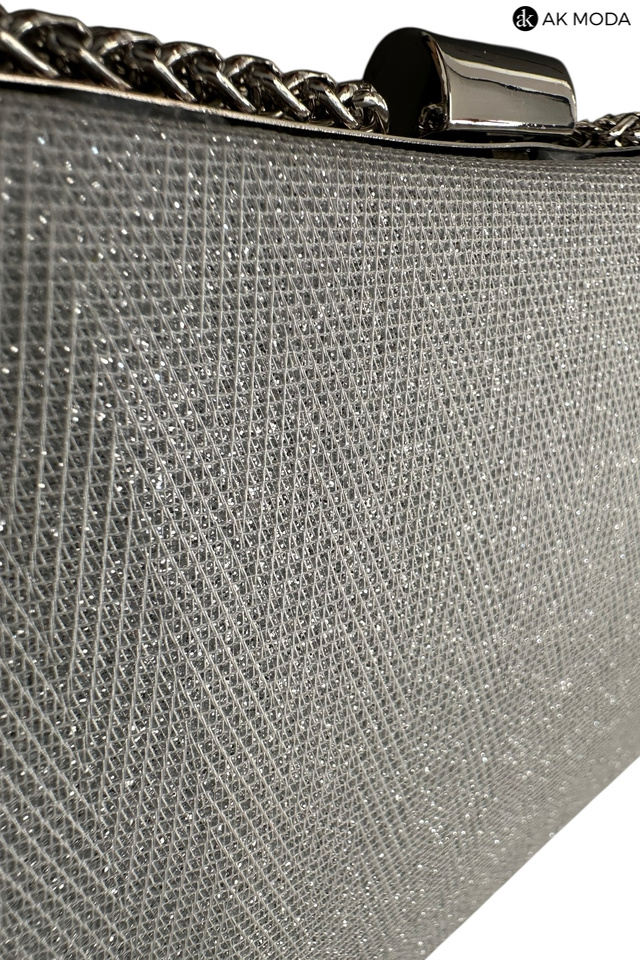 Elegancka torebka typu puzderko w kolorze srebrnym z zapięciem na zatrzask. Torebka posiada odpinany długi oraz krótki łańcuszek dzięki czemu można ją nosić zarówno w dłoni, jak i na ramieniu. Puzderko wykonane z brokatowego, fakturowanego materiału.
