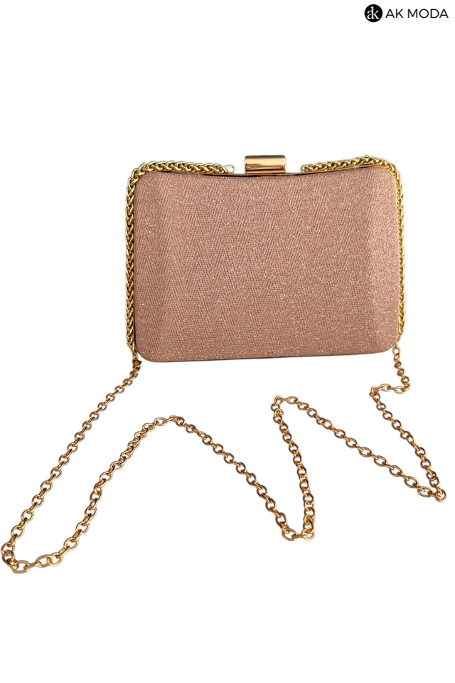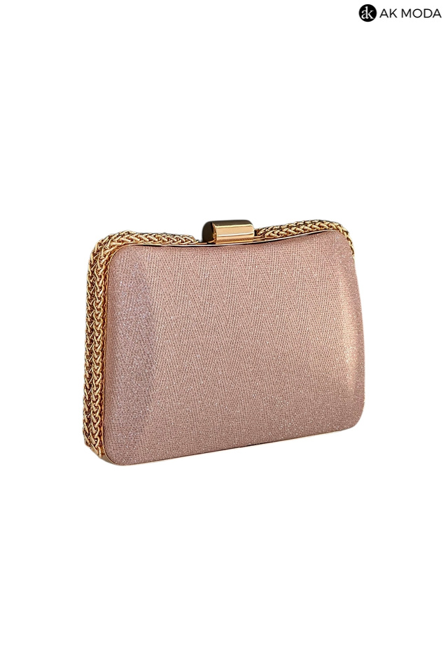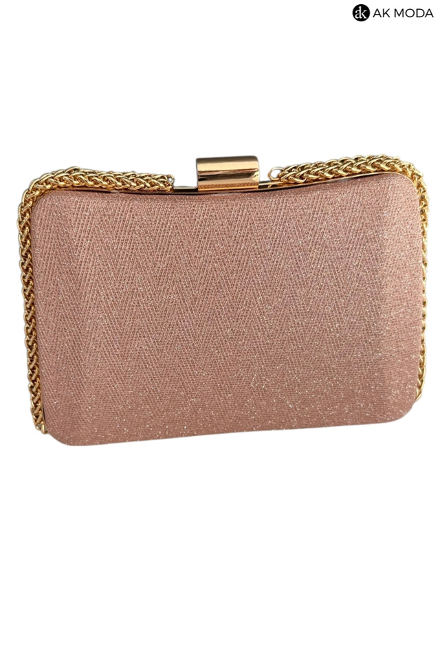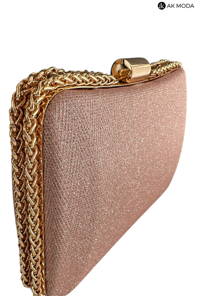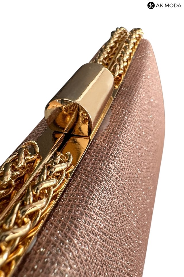 Elegancka torebka typu puzderko w kolorze różowym z zapięciem na zatrzask. Torebka posiada odpinany długi oraz krótki łańcuszek, dzięki czemu można ją nosić zarówno w dłoni, jak i na ramieniu. Puzderko wykonane z brokatowego, fakturowanego materiału.