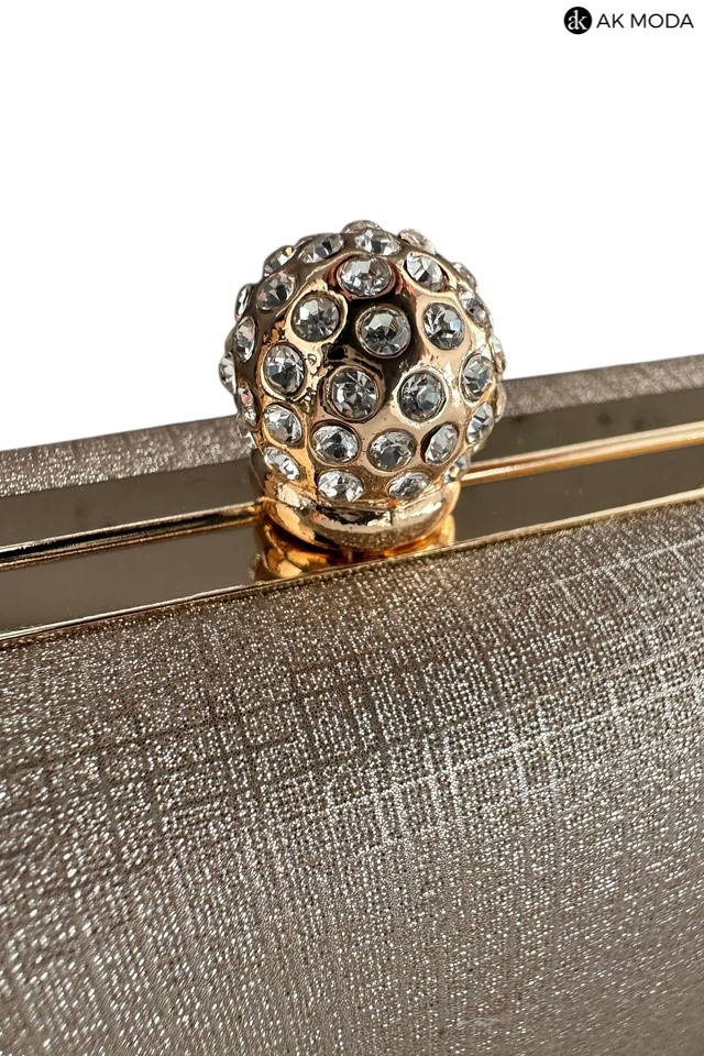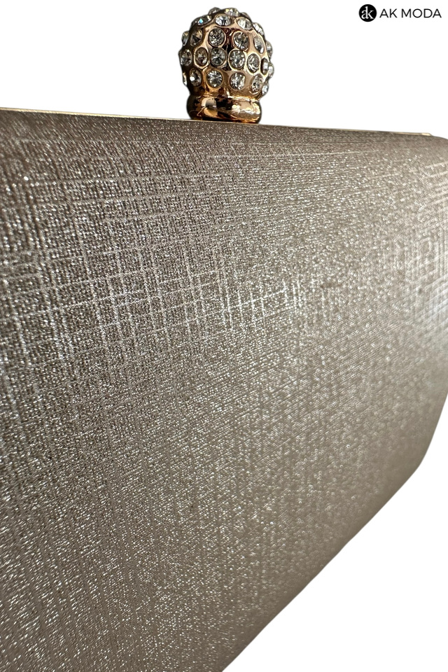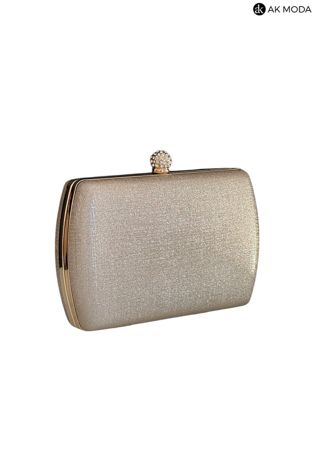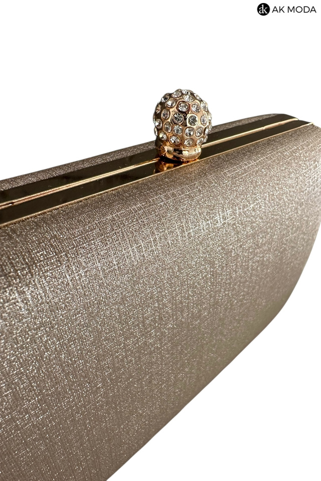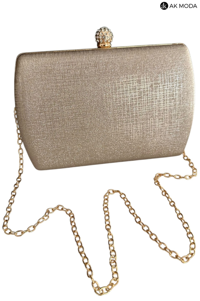 Elegancka torebka typu puzderko w kolorze złotym, z ozdobnym zapięciem na zatrzask. Torebka posiada odpinany długi łańcuszek oraz uchwyt, dzięki czemu można ją nosić zarówno w dłoni, jak i na ramieniu. Puzderko wykonane z błyszczącego, fakturowanego materiału.