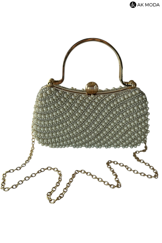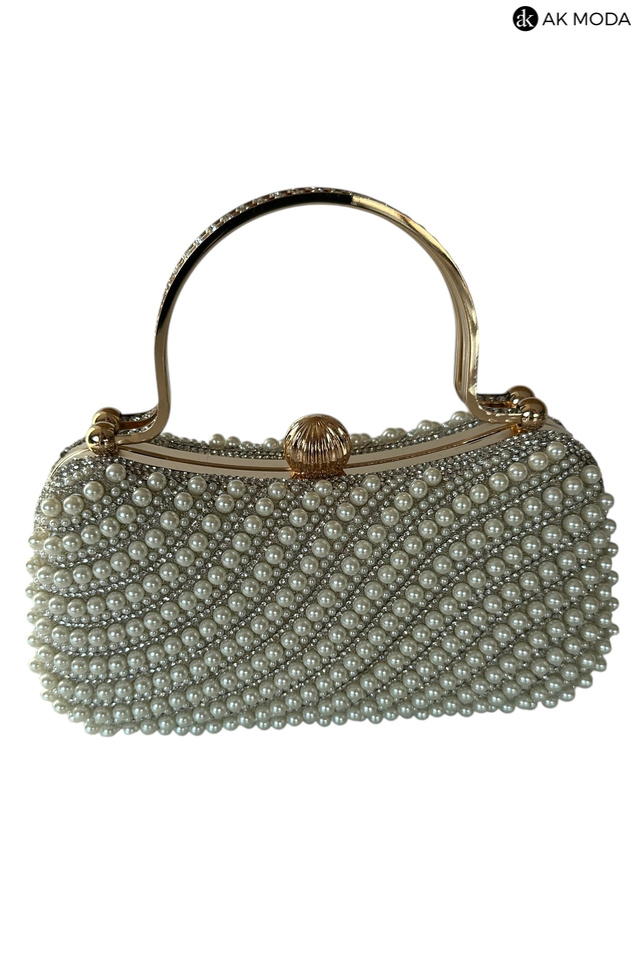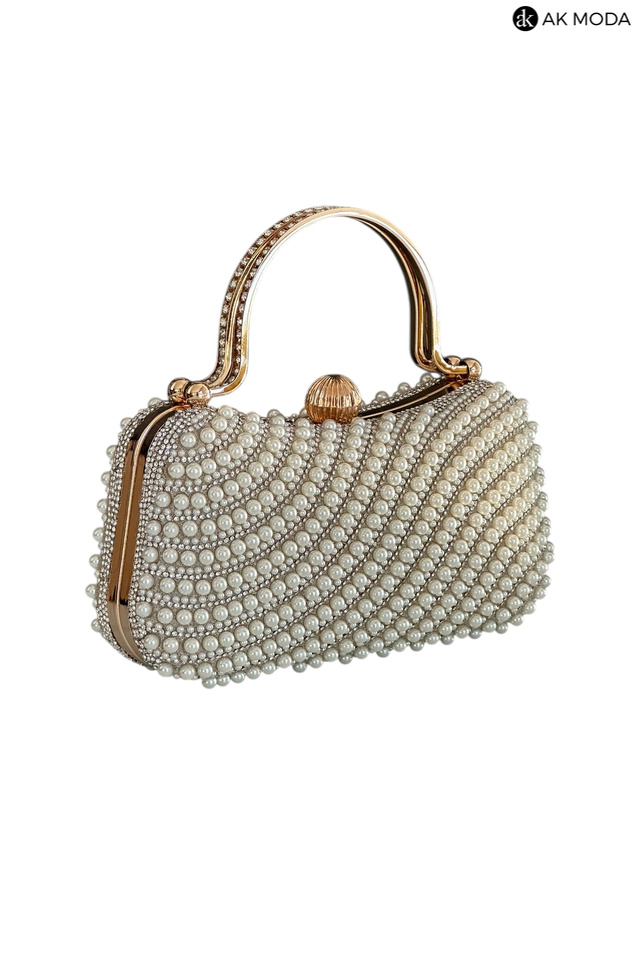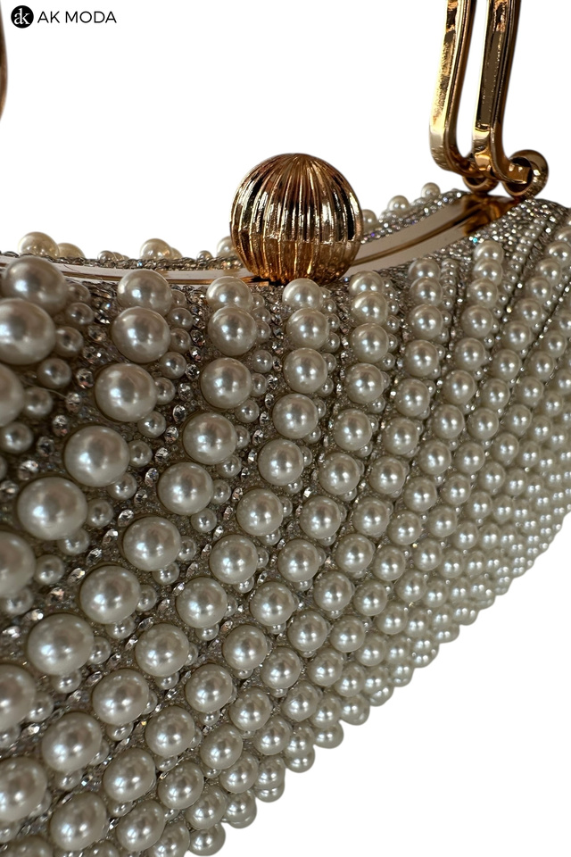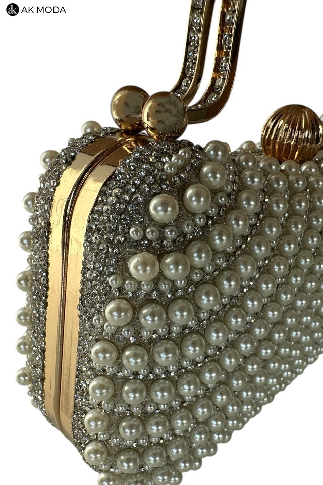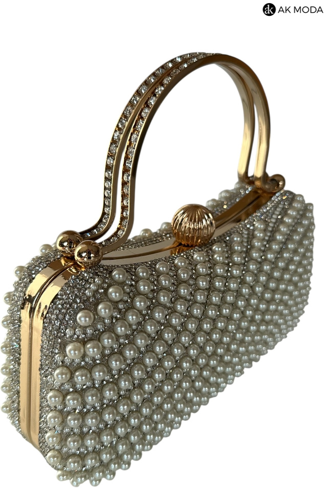 Elegancka torebka typu puzderko w kolorze ecru, z zapięciem na zatrzask i ozdobnymi uchwytami. Torebka posiada odpinany długi łańcuszek, dzięki czemu można ją nosić zarówno w dłoni, jak i na ramieniu. Puzderko w całości wysadzane perełkami i cyrkoniami.