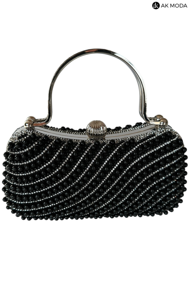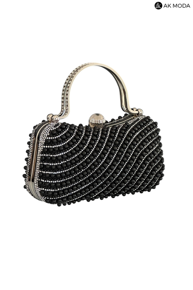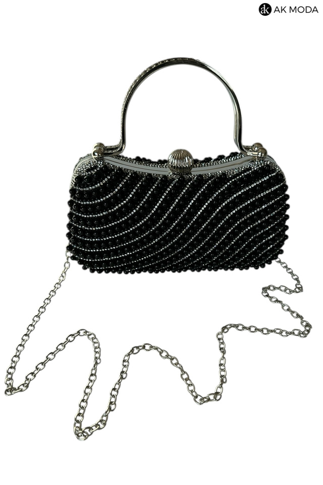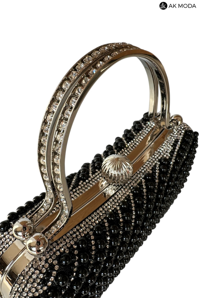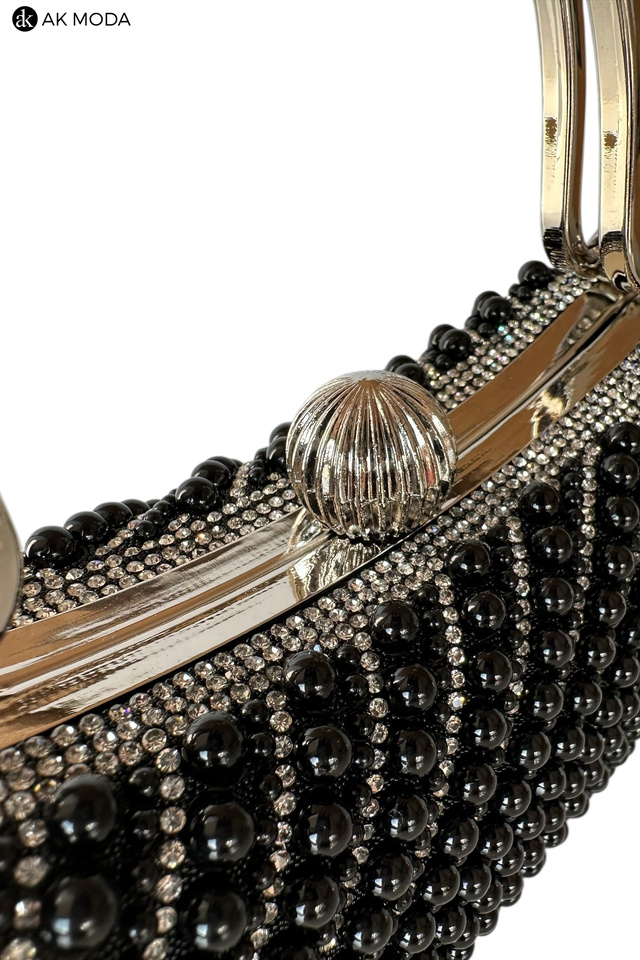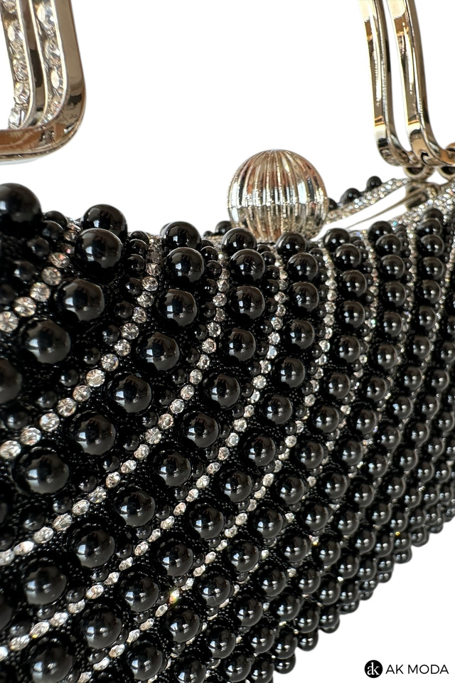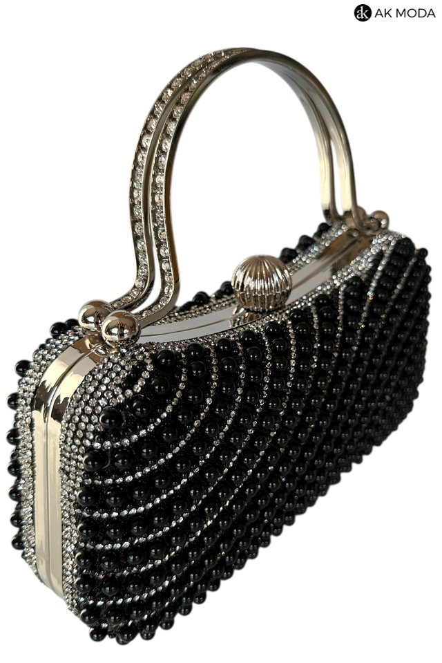 Elegancka torebka typu puzderko w kolorze czarnym, z zapięciem na zatrzask i ozdobnymi uchwytami. Torebka posiada odpinany długi łańcuszek, dzięki czemu można ją nosić zarówno w dłoni, jak i na ramieniu. Puzderko w całości wysadzane perełkami i cyrkoniami.