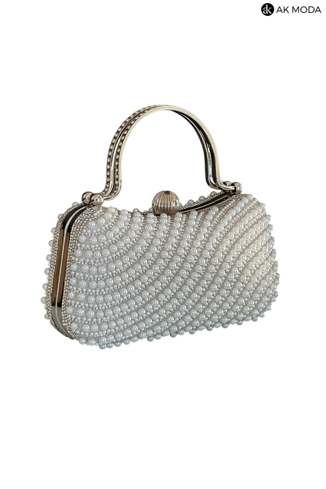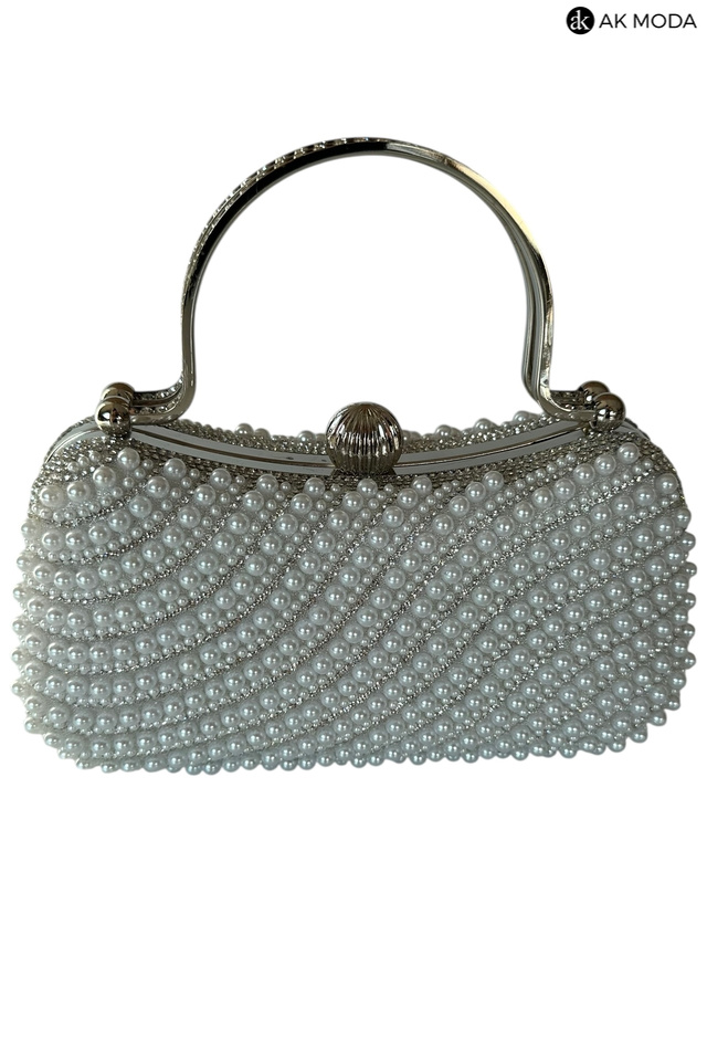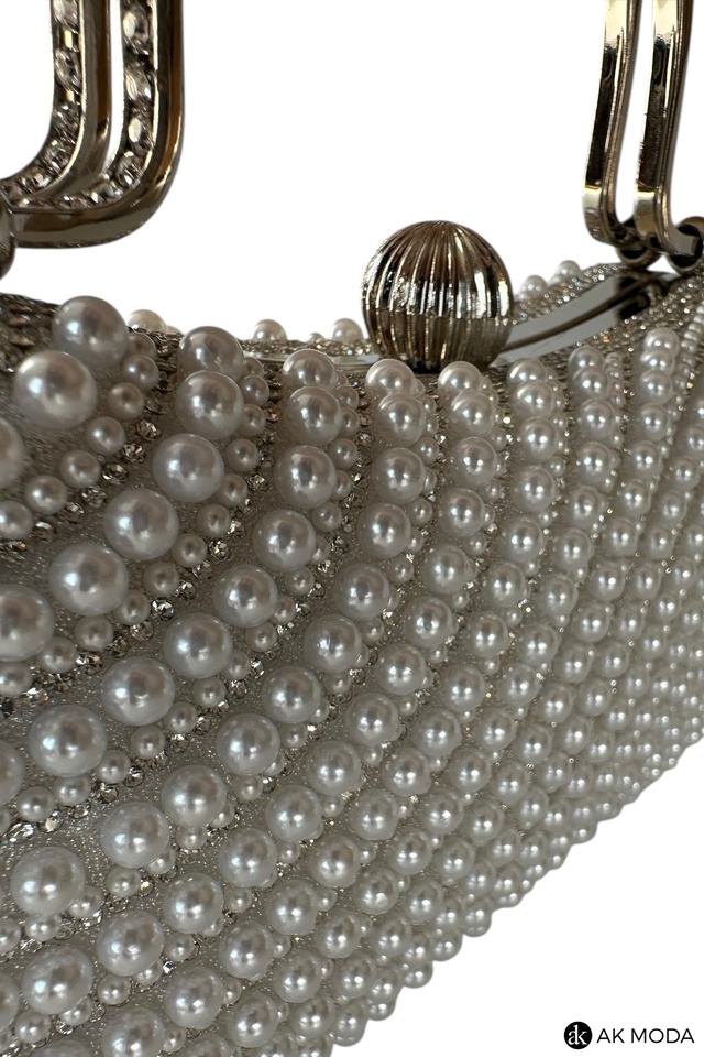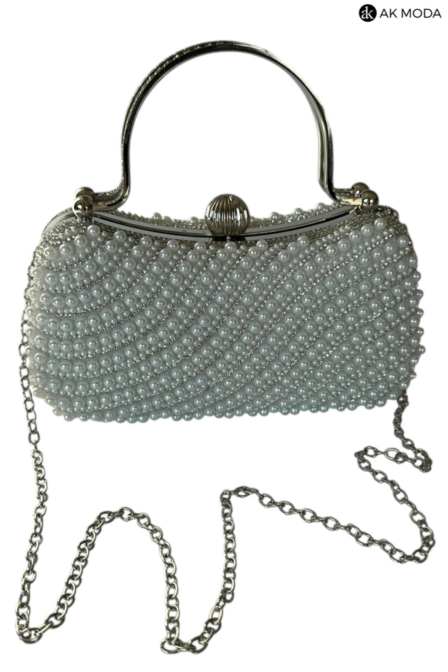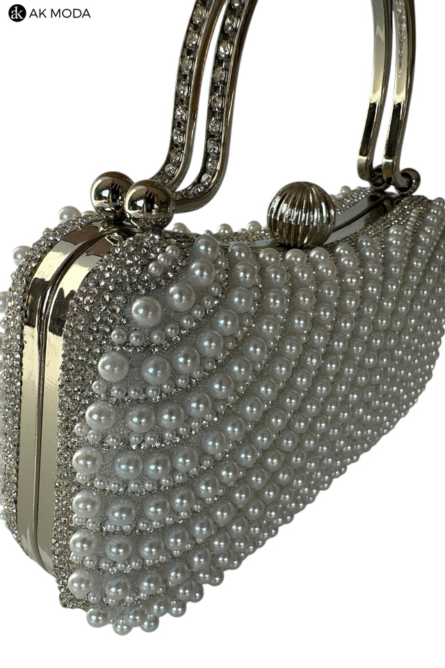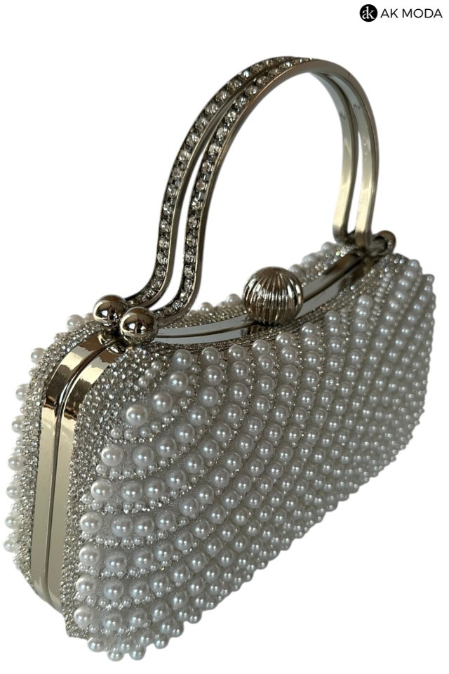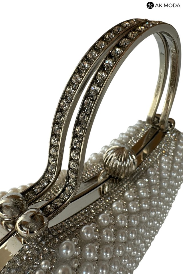 Elegancka torebka typu puzderko w kolorze srebrnym, z zapięciem na zatrzask i ozdobnymi uchwytami. Torebka posiada odpinany długi łańcuszek, dzięki czemu można ją nosić zarówno w dłoni, jak i na ramieniu. Puzderko w całości wysadzane perełkami i cyrkoniami.