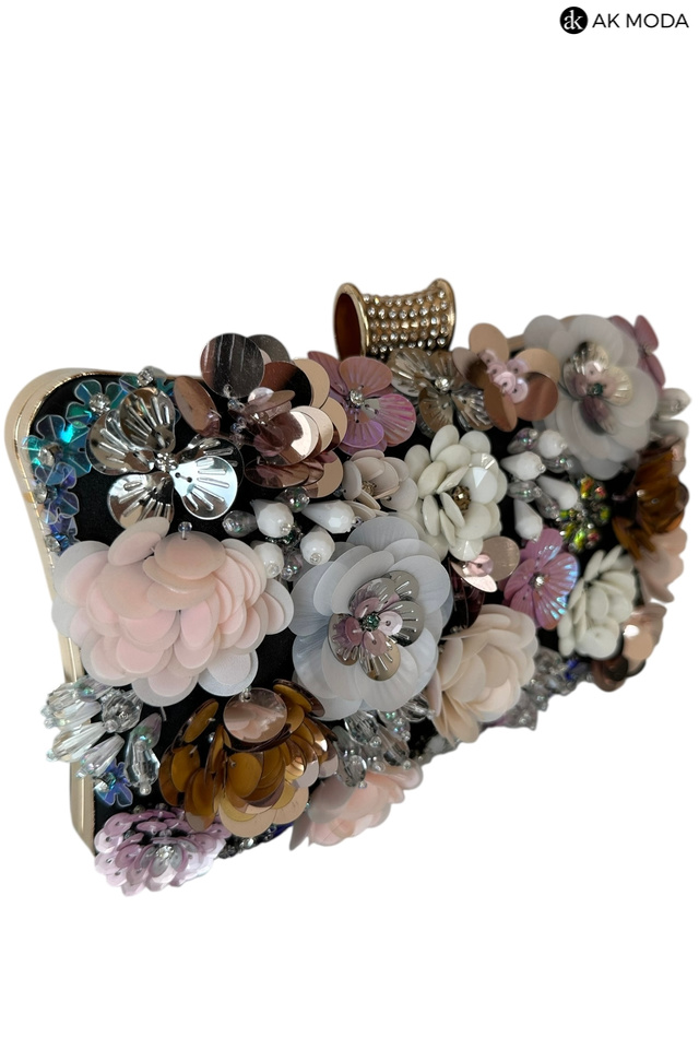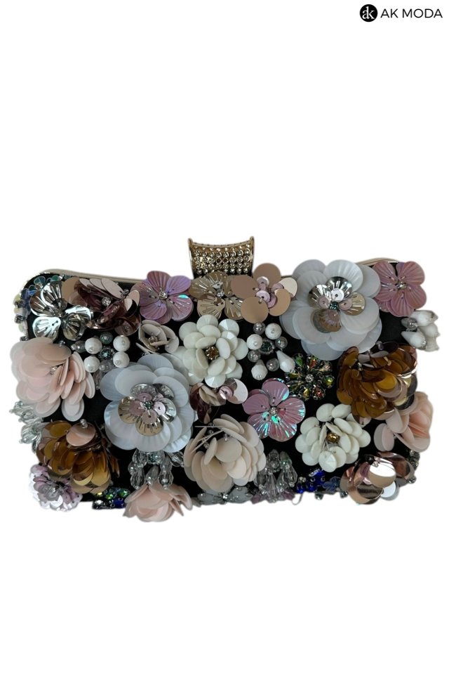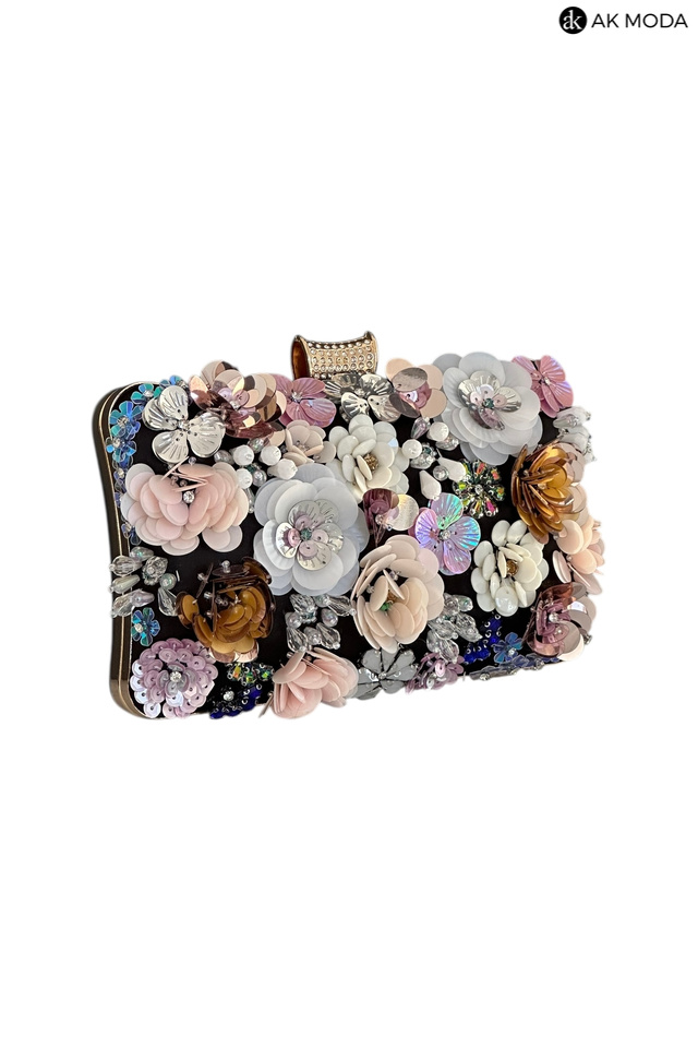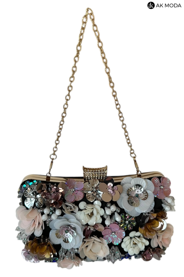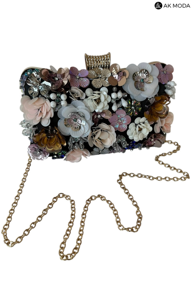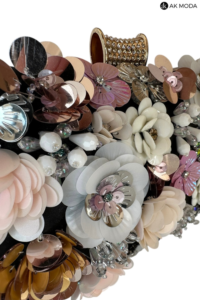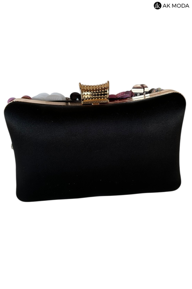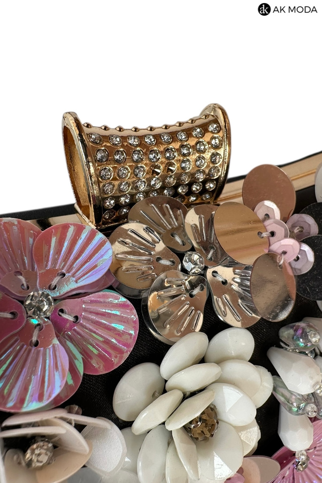 Elegancka torebka typu puzderko w kolorze czarnym, z ozdobnym zapięciem na zatrzask. Torebka posiada odpinany długi i krótki łańcuszek, dzięki czemu można ją nosić zarówno w dłoni, jak i na ramieniu. Z przodu efektowne zdobienie w formie kwiatowej aplikacji z cekinów i koralików.