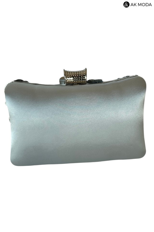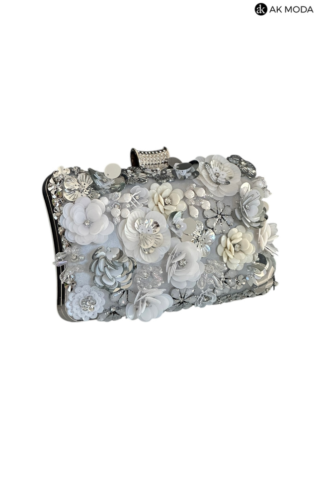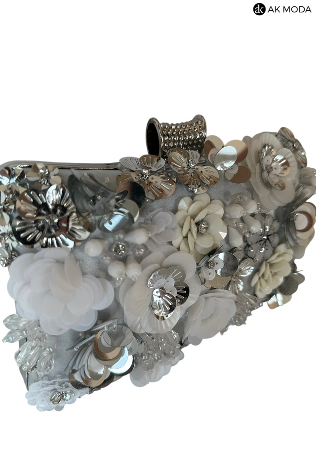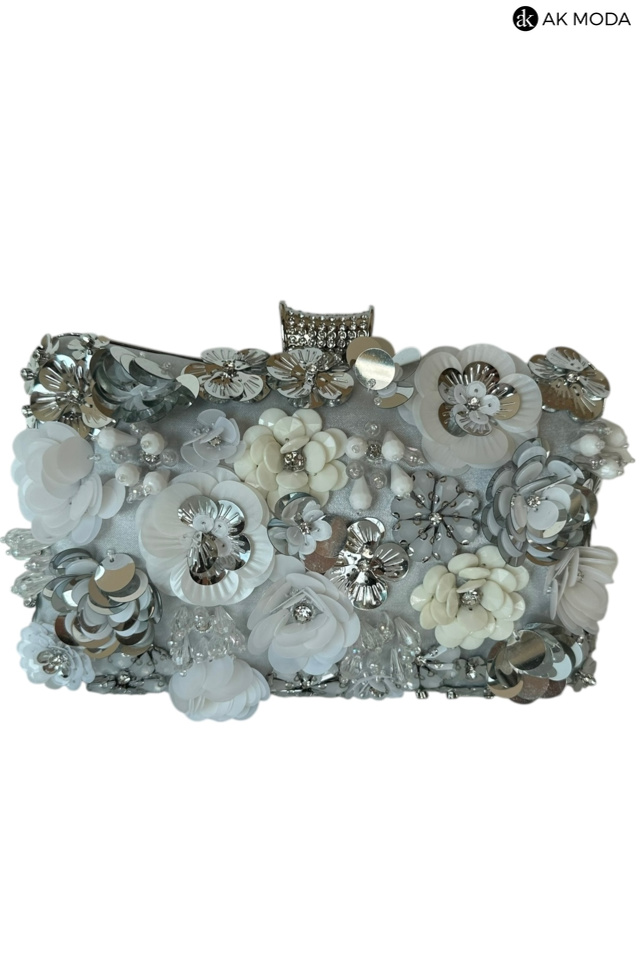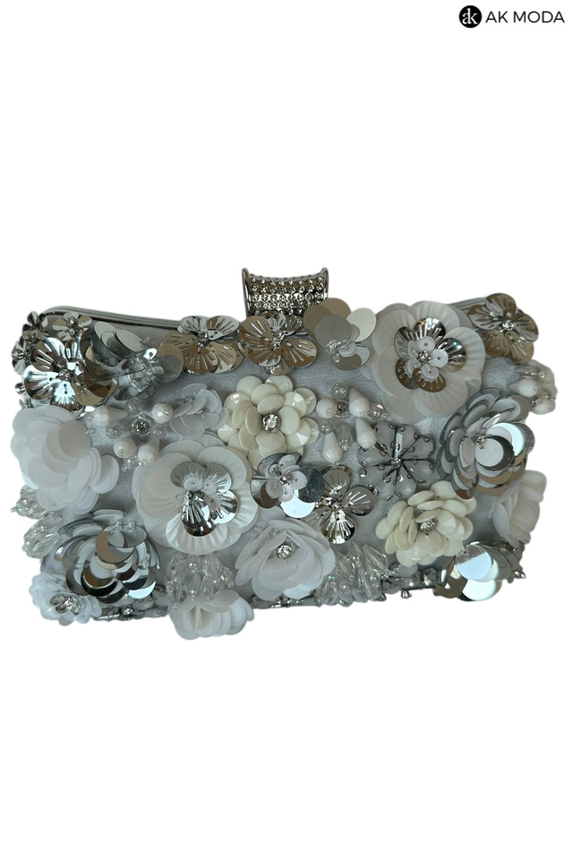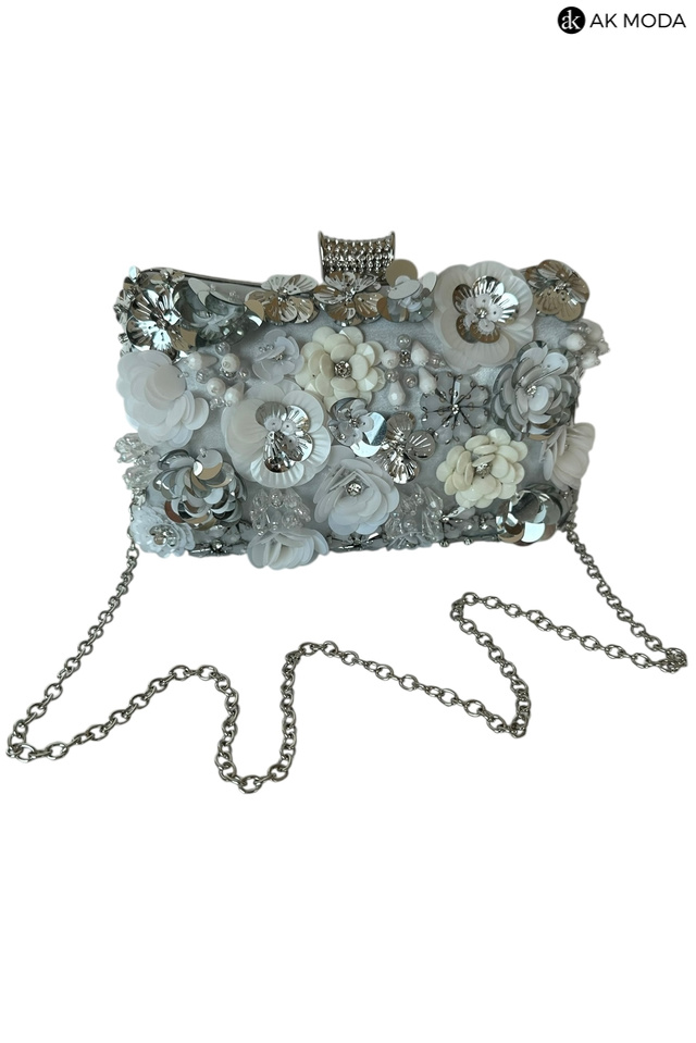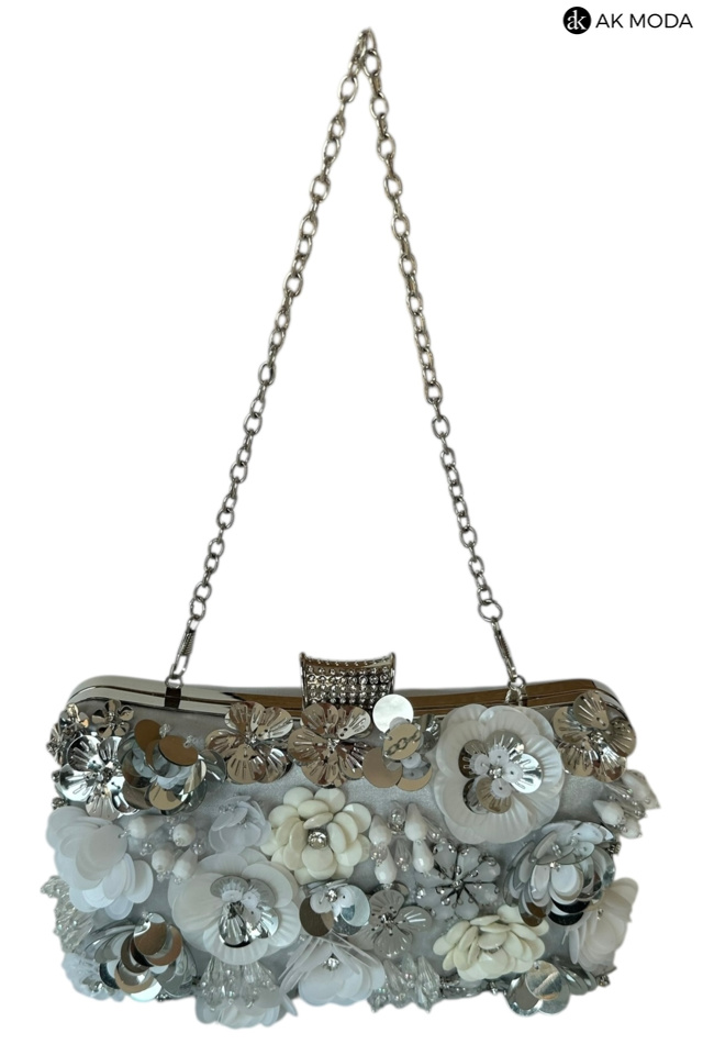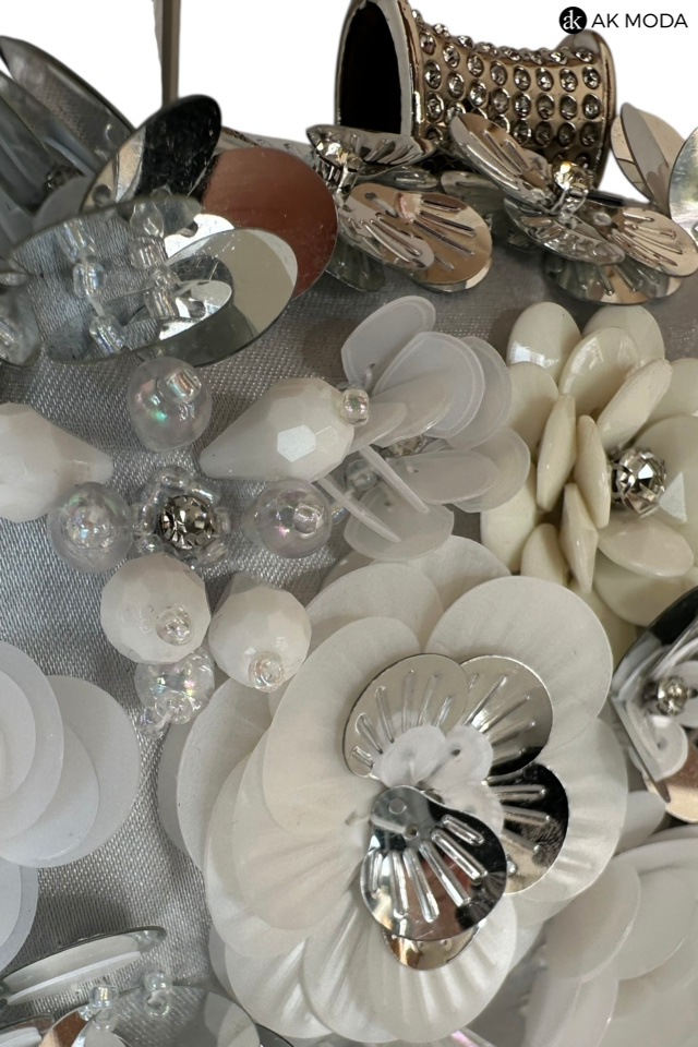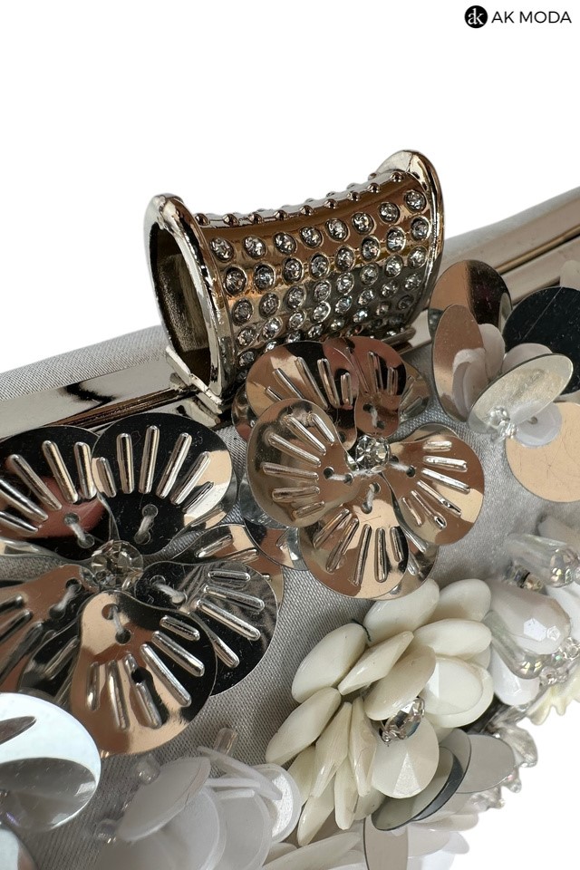 Elegancka torebka typu puzderko w kolorze srebrnym, z ozdobnym zapięciem na zatrzask. Torebka posiada odpinany długi i krótki łańcuszek, dzięki czemu można ją nosić zarówno w dłoni, jak i na ramieniu. Z przodu efektowne zdobienie w formie kwiatowej aplikacji z cekinów i koralików.