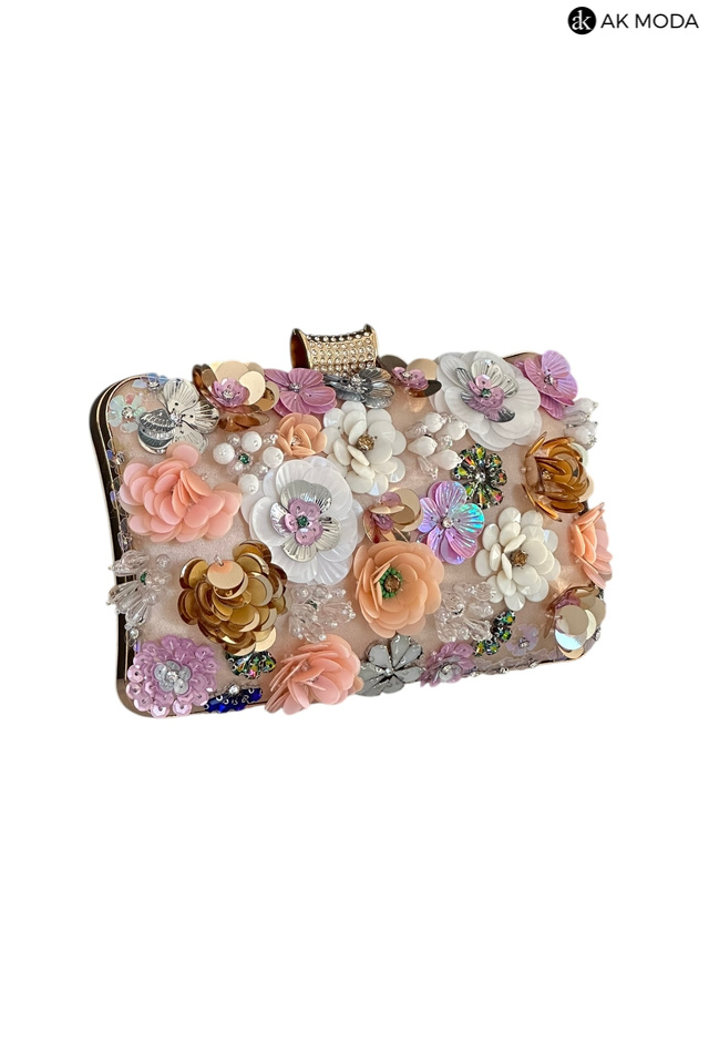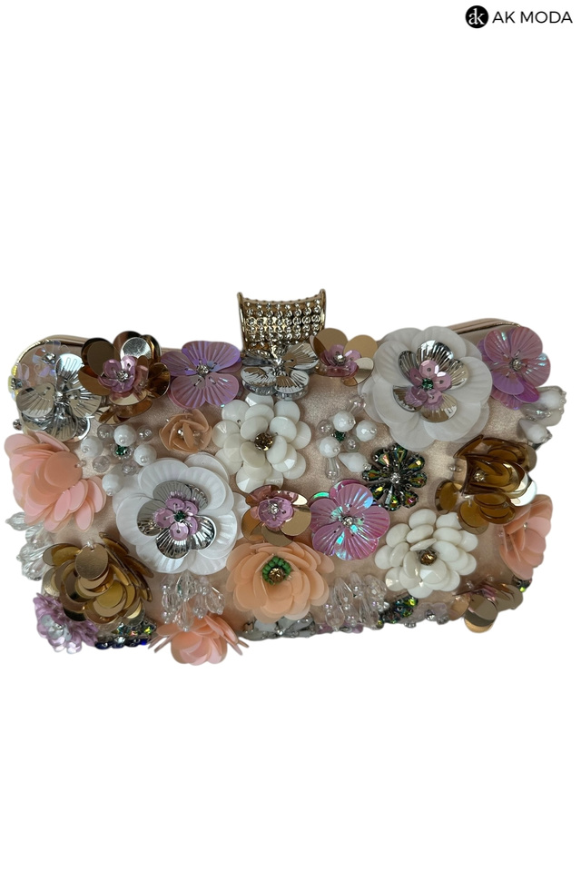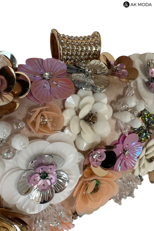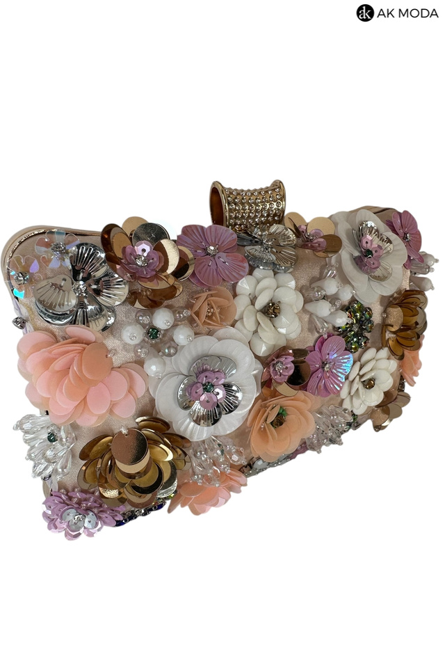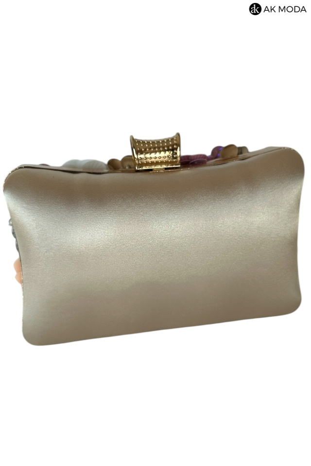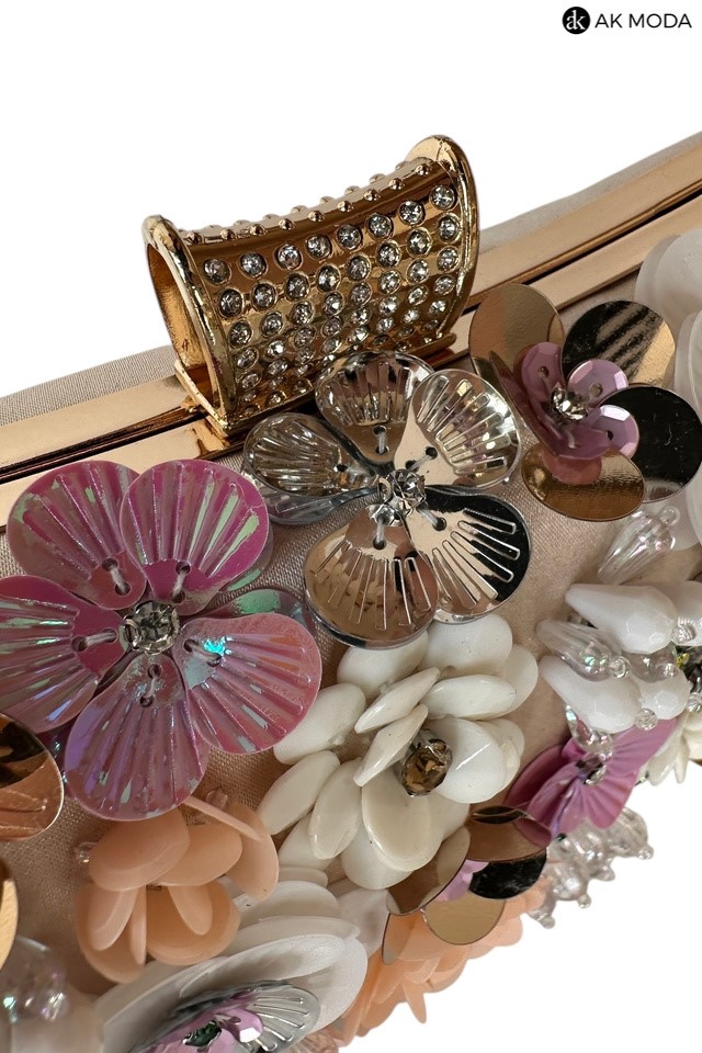 Elegancka torebka typu puzderko w kolorze złotym, z ozdobnym zapięciem na zatrzask. Torebka posiada odpinany długi i krótki łańcuszek, dzięki czemu można ją nosić zarówno w dłoni, jak i na ramieniu. Z przodu efektowne zdobienie w formie kwiatowej aplikacji z cekinów i koralików.