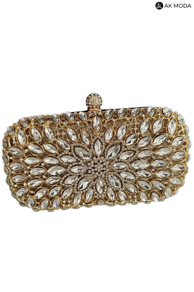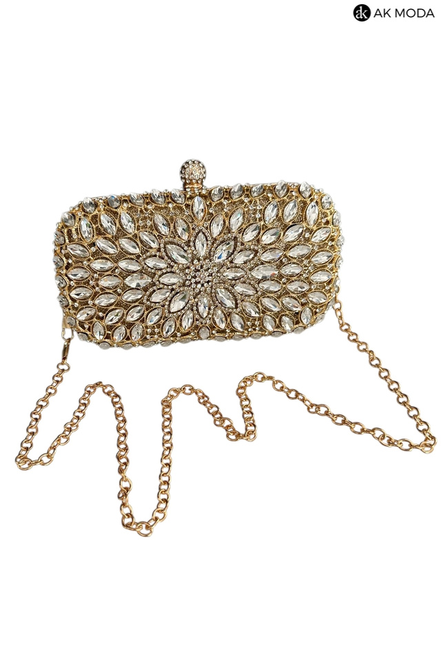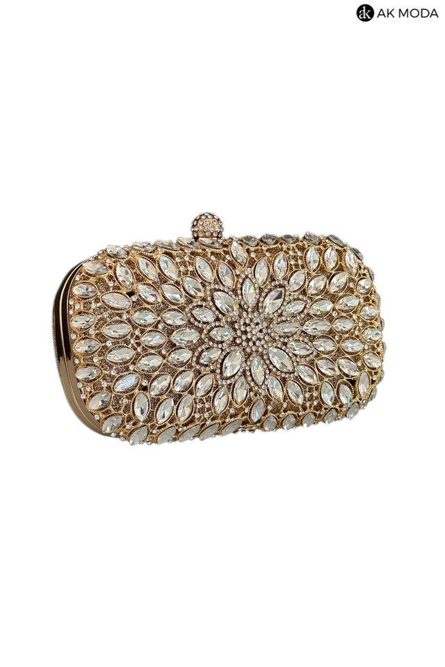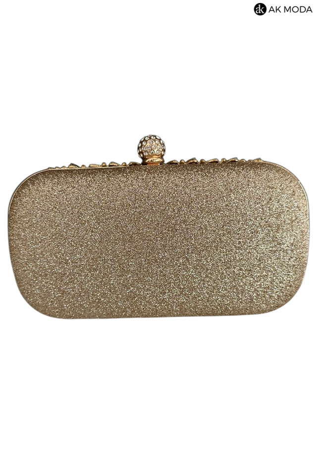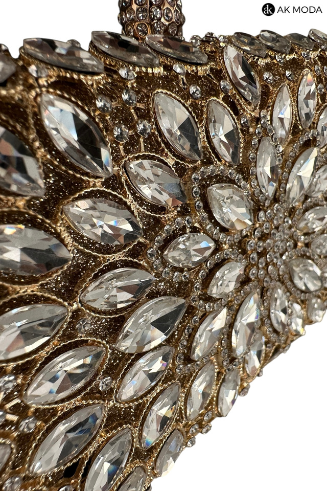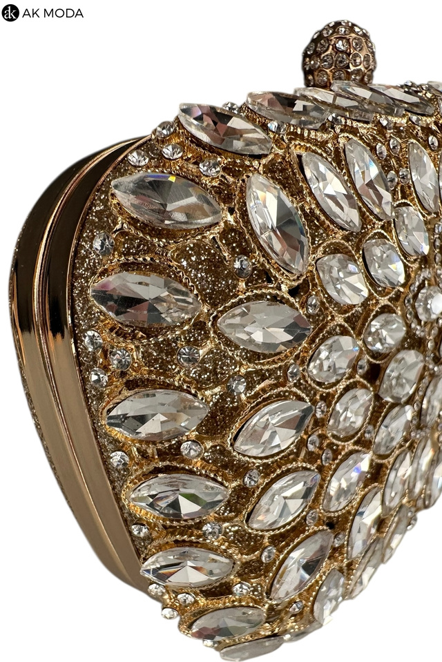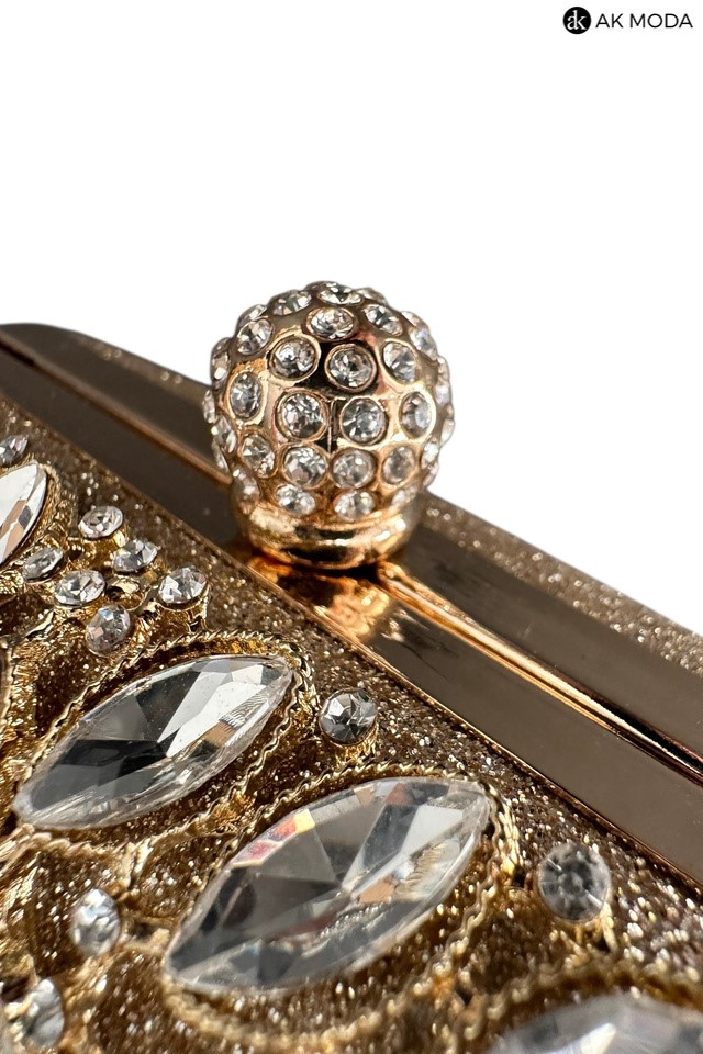 Elegancka torebka typu puzderko w kolorze złotym z ozdobnym zapięciem na zatrzask. Torebka posiada odpinany długi oraz krótki łańcuszek, dzięki czemu można ją nosić zarówno w dłoni, jak i na ramieniu. Puzderko wykonane brokatowego materiału, z przodu zdobione cyrkoniami.