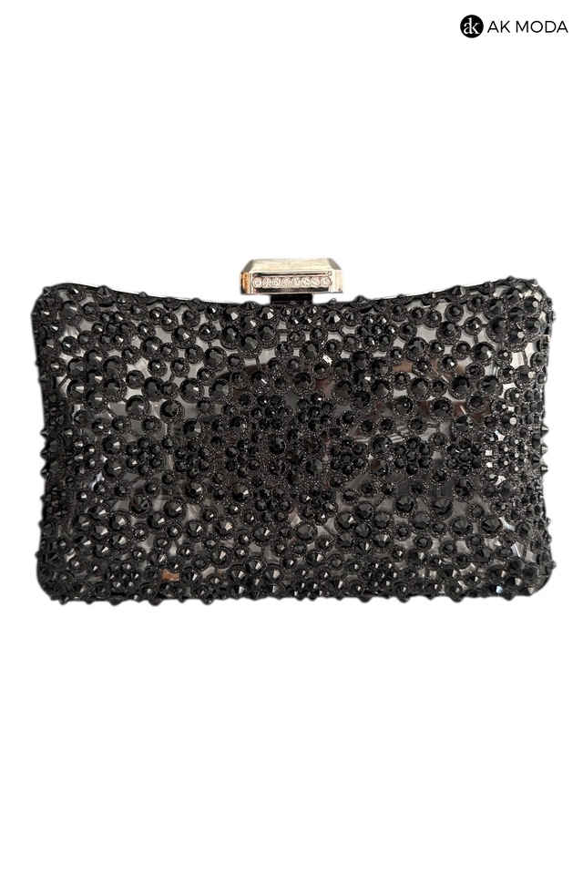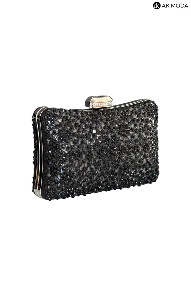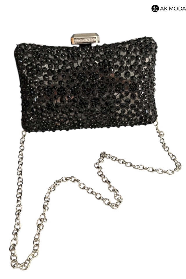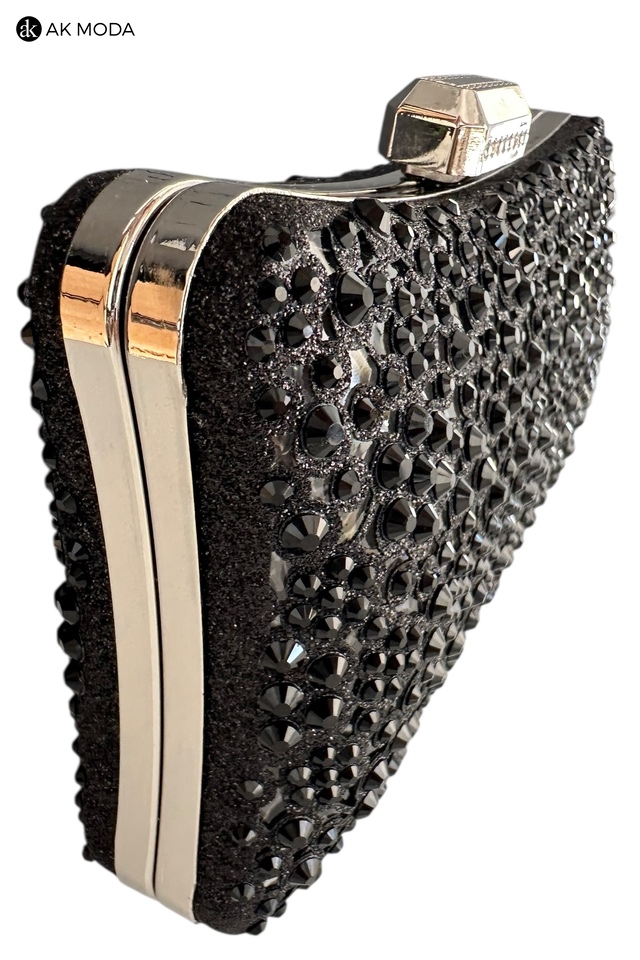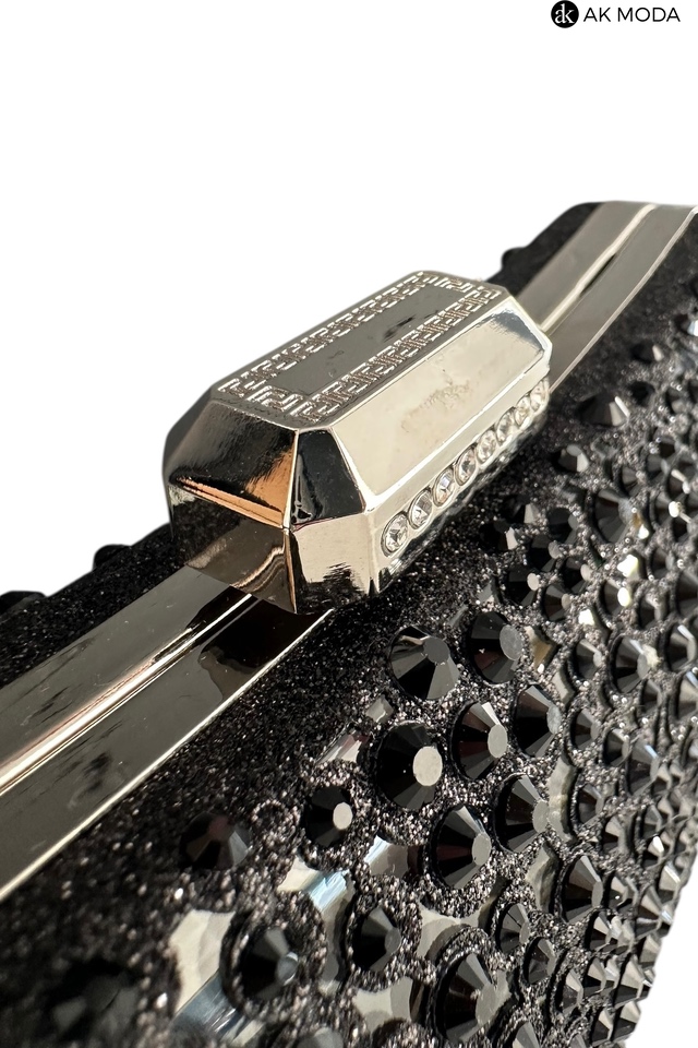 Elegancka torebka typu puzderko w kolorze czarnym, z ozdobnym zapięciem na zatrzask. Torebka posiada odpinany łańcuszek oraz uchwyt, dzięki czemu można ją nosić zarówno w dłoni, jak i na ramieniu. Puzderko wykonane z przezroczystego materiału, wysadzanego kamyczkami i brokatem.